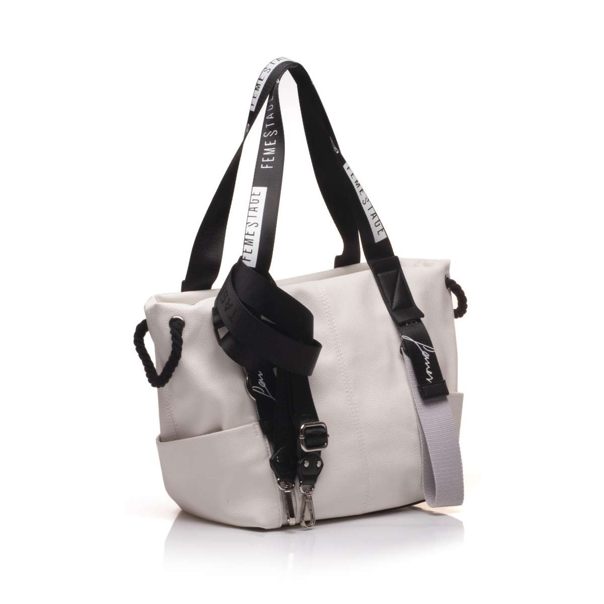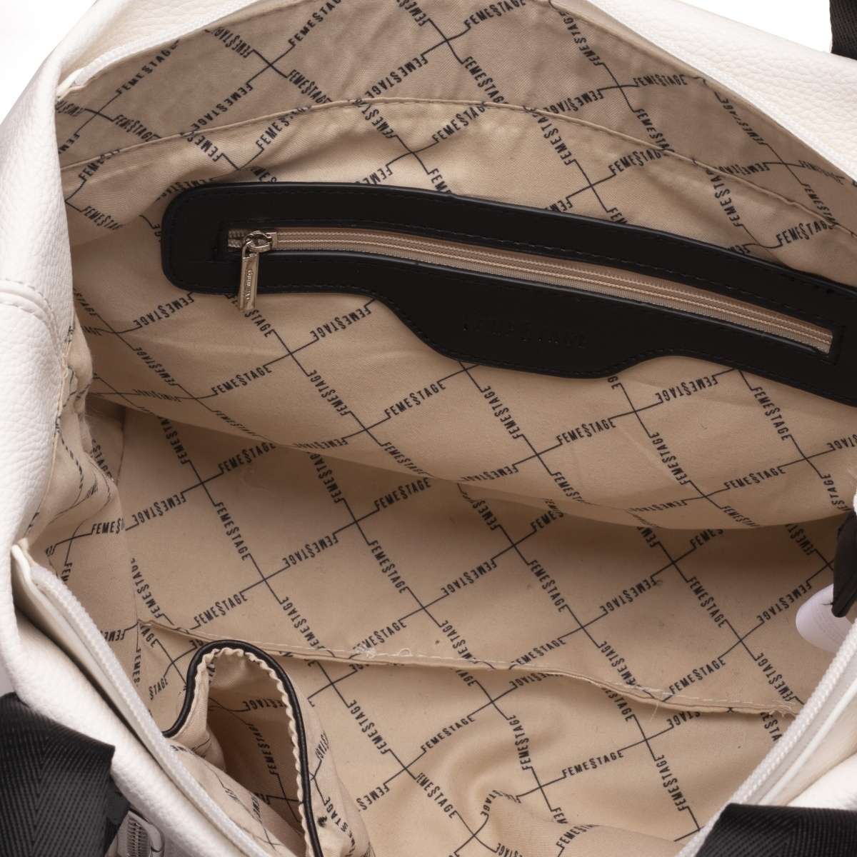 Dámská kabelka Femestage bílé barvy, hladkého povrchu je zdobena potištěnými uchy a zdobnými zipy na přední straně. U horního okraje má taška zip, po jehož rozepnutí se otevře vnitřní kapsa, kde na jedné straně je kapsa na zip a na druhé pak dvě kapsy na drobnosti. Taška má dlouhý popruh, který si můžete nastavit na Vámi zvolenou délku či jej odepnout. Tato kabelka ve dvou barevných variantách je skvělá jako módní doplněk k naší obuvi.
