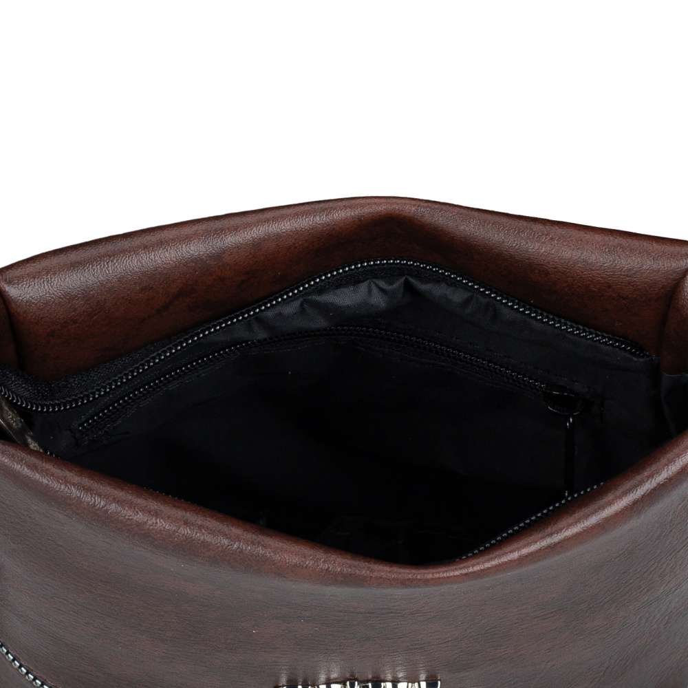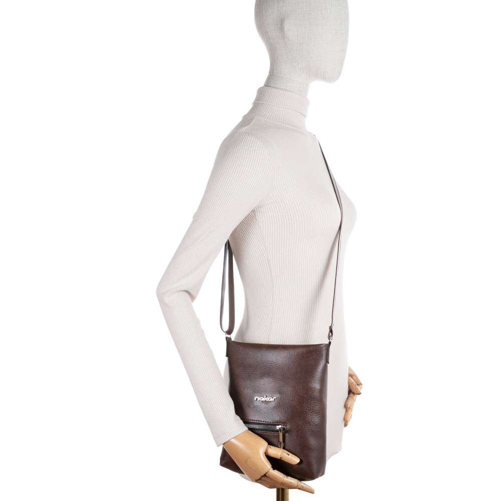 Tato stylová kabelka RIEKER v odstínu hnědé je stvořená pro ženy, které milují kombinaci módního vzhledu a praktického využití. Svršek zdobí tmavší linie, které jí dodávají hloubku a vizuální zajímavost. Přední strana je zvýrazněna stříbrným logem RIEKER, které decentně podtrhuje prémiový charakter značky, zatímco výrazný zip přední kapsičky dodává modelu dynamický vzhled. Tento designový prvek zároveň není jen ozdobou - zip otevírá praktickou přední přihrádku, do které si můžete uložit drobnosti. Vrchní zip kabelky odhaluje důkladně promyšlený interiér. Hlavní prostor je dostatečně prostorný pro všechny vaše každodenní nezbytnosti – mobil, peněženku, klíče, menší kosmetiku či zápisník. Uvnitř se nacházejí dvě menší vnitřní kapsičky, jedna otevřená a druhá se zipovým uzavíráním. Díky tomuto promyšlenému členění budete mít v kabelce vždy pořádek a vše na dosah ruky. O pohodlí při nošení se stará délkově nastavitelný ramenní popruh, který umožňuje různé způsoby nošení – klasicky přes rameno nebo crossbody stylem pro volné ruce a maximální pohodlí. Tento variabilní design dělá z kabelky praktického společníka na běžné dny v práci, nákupy, procházky městem, ale také na večerní setkání s přáteli. Kabelka RIEKER je nejen praktická, ale také vizuálně přitažlivá – zaručeně oživí každý outfit a dodá mu jemný nádech originality. Rozměry: cca V 23 cm x Š 18 cm x H 5 cm Vnitřní uspořádání: kabelka není dělená. Kabelka má délkově nastavitelný popruh, který nelze odepnout. Maximální délka nastavitelného popruhu je cca 135 cm.