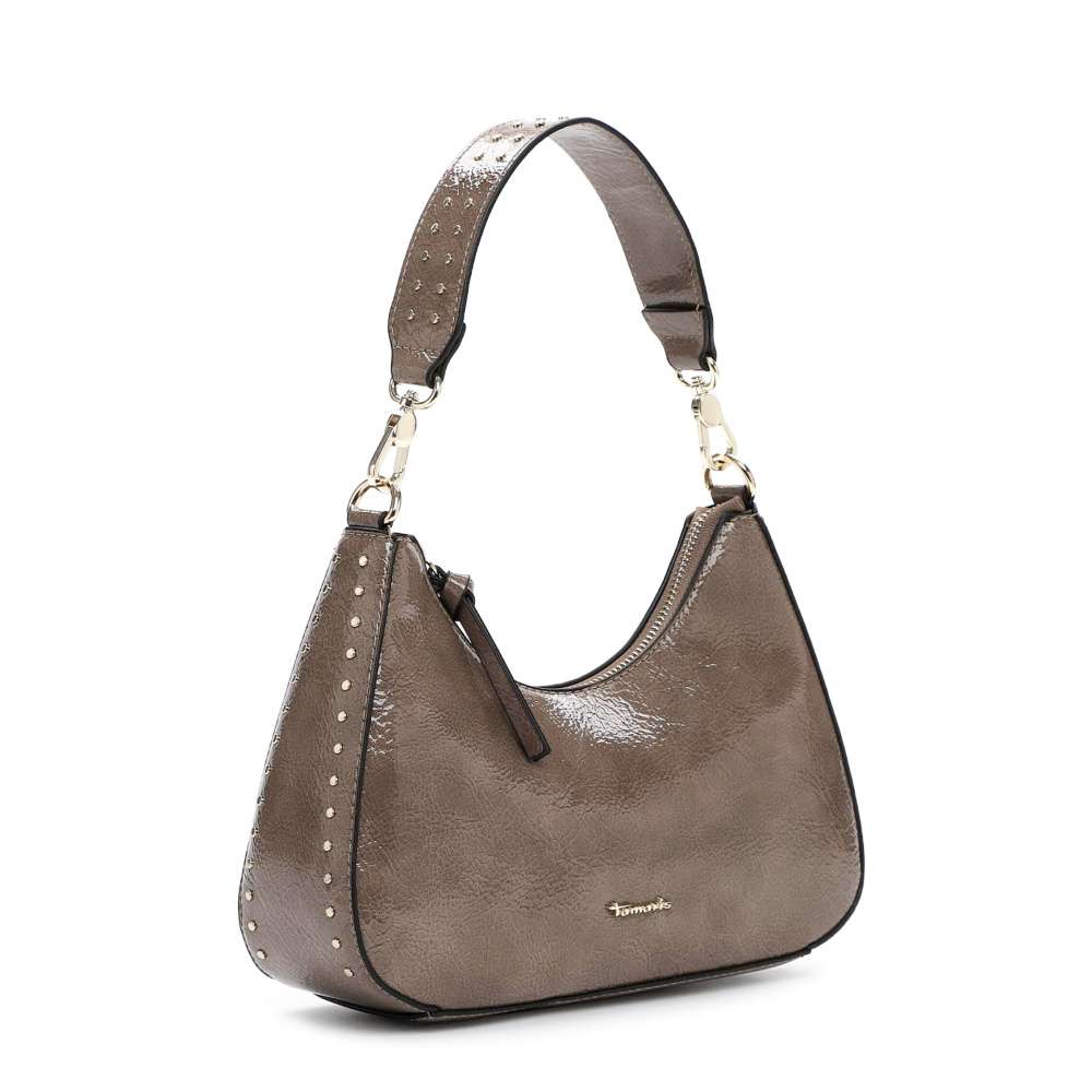 Trendy kabelka Tamaris s výraznými detaily, tuto stylovou kabelku Tamaris rozhodně nelze přehlédnout. Lesklý béžový svršek doplňuje zlaté logo značky a poutavé aplikace po stranách, které jí dodávají atraktivní vzhled. Hlavní prostor se uzavírá vrchním zipem a vytváří místo k uložení věcí včetně dvou menších vnitřních kapsiček pro přehledné uložení věcí. Kabelka je vybavena dvěma popruhy – kratší pevný je dekorovaný kulatými prvky a delší nastavitelný popruh umožňuje nošení přes rameno nebo přes tělo, oba popruhy lze odepnout a kabelku snadno přizpůsobíte svým potřebám i stylu. Tato kabelka vytváří skvělý doplněk pro ženy, které chtějí spojit funkčnost s aktuálními módními trendy. Rozměry: cca V 18 cm x Š 26 cm x H 8 cm Vnitřní uspořádání: kabelka není dělená Kabelka má délkově nastavitelný popruh, který lze odepnout.