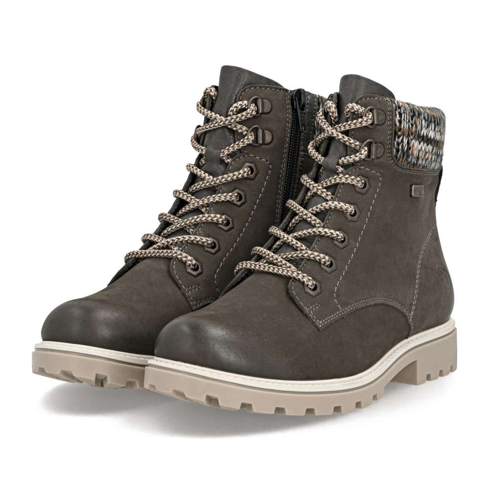 Obuv REMONTE je vyšší řada značky RIEKER, obuv se vyznačuje kvalitou použitých materiálů. Styl a pohodlí v jednom – přesně to přinášejí tyto kotníkové boty RIEKER. Díky promyšlené kombinaci materiálů působí originálně a moderně, šedý materiál svršku je doplněn atraktivním textilním lemem horního okraje. Nepromokavá membrána zajišťuje ochranu před vlhkostí, takže nemusíte mít obavu ani ze sychravého počasí. Šněrování nabízí možnost ideálního přizpůsobení noze, a pro ještě větší pohodlí je zde i praktický boční zip pro rychlé obutí. Vnitřek boty je vybaven měkkou, vyjímatelnou stélkou a textilní podšívkou, které zajistí komfort při každém kroku. Tento model je jako stvořený pro ženy, které hledají stylovou, ale zároveň funkční obuv pro každý den. Technologie: Remonte TEX – funkční vrstva, díky které je svršek boty nepromokavý a přesto prodyšný. Thermo stélka – ze spodní strany je hliníková fólie, která poskytuje výborné termoizolační vlastnosti a chrání tak chodidlo před chladem. Tato bota je vybavena vyjímatelnou stélkou.