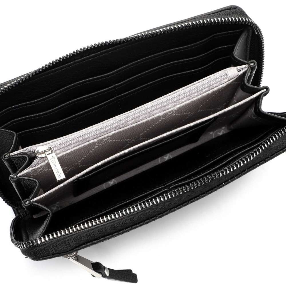 Dámská elegantní peněženka značky Tamaris okouzlí i Vaše oči. Svršek s malým nápisem Tamaris udělá tuhle peněženku elegantní. Druhá strana peněženky má laserem řezané dírky a tvoří tak jednoduchý design. Díky jemnému syntetickému materiálu je lehká a příjemná na dotek. Do této krásky si uložíte vše, co potřebujete, jelikož má přihrádku na mince na zip, 8 přihrádek na kreditní karty a zvlášť i bankovky. Vytáhněte tuhle krásku na nákupy a zpříjemněte si den.