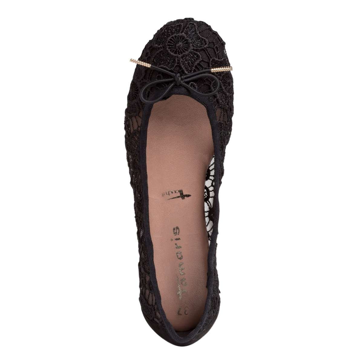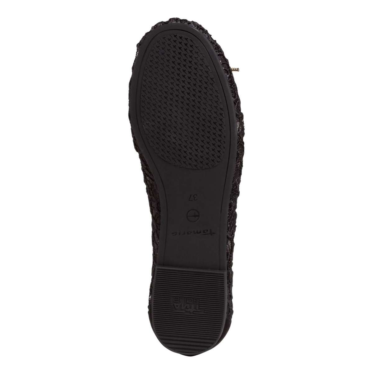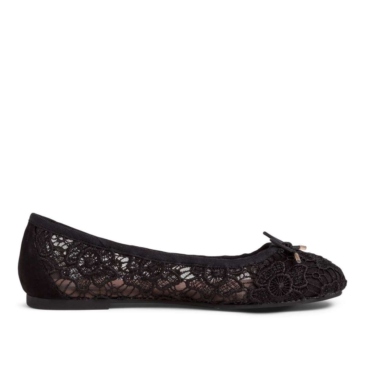 Dámské krajkové baleríny v černé barvě s pevnou a stabilní podešví. Zdobené jsou lemováním kolem horního obvodu kotníku a mašlí na špici s kovovým zakončením zlatavé barvy. Tento model unosíte jak do práce, tak i na běžné procházky po městě.