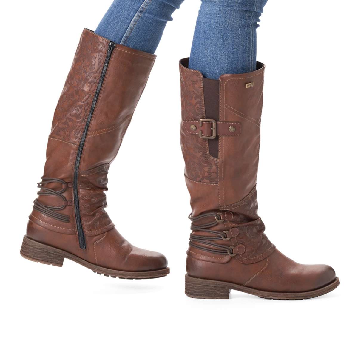 Obuv REMONTE je vyšší řadou značky RIEKER, obuv se vyznačuje kvalitou použitých materiálů, komfortnější šířkou a nadměrnými velikostmi. Dámské kozačky hnědé barvy jsou zdobené květinovým vzorem v patě i na nártu, přezkou s hnědým páskem na vnější straně a pružnými gumičkami kolem paty. Vyjímatelnou stélku a funkční vrstvu RemonteTex oceníte v chladném zimním počasí. Boty z řady Remonte Vám zajistí maximální komfort a pohodlí při celodenním nošení.