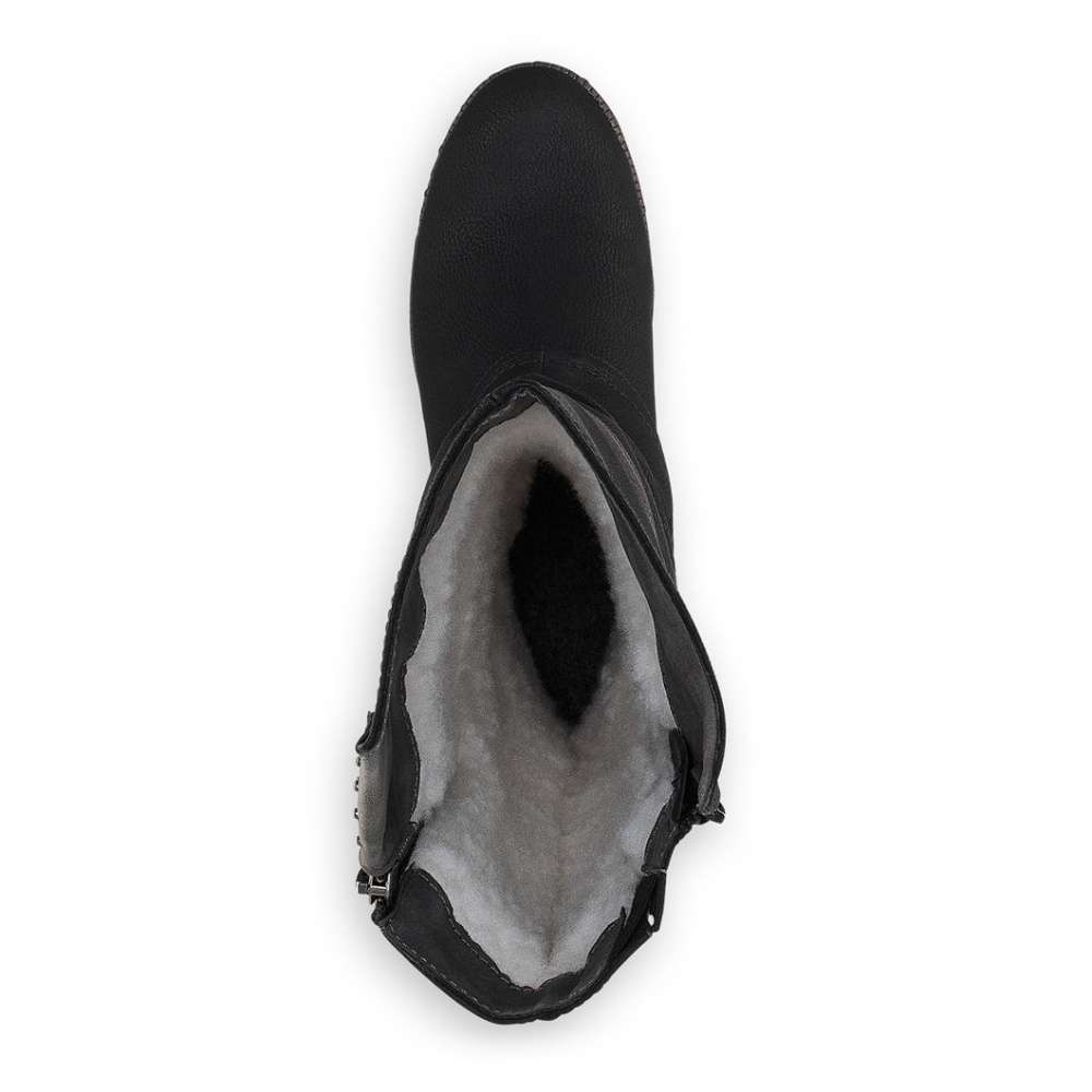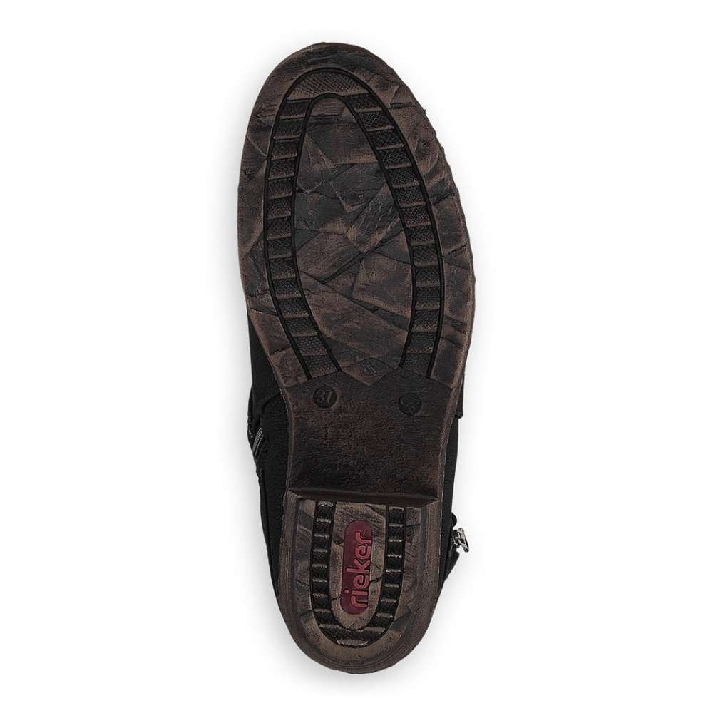 Zajímavé kozačky značky Rieker, které využijete do práce i na procházku do města.Na černém svršku se některé díly přes sebe zajímavě překrývají. Od kotníku nahoru jsou boty mirně zvrásněné a mají na sobě kovové prvky ve spojení s malými šedými díly. Na vnější straně je u horního okraje kratší funkční zip, který lze rozepnout a povolit tak obuv kolem lýtka. Na vnitřní straně je druhý zip, který je po celé délce a slouží pro pohodlné nazouvání. Díky membráně RiekerTex a kožešině budete v suchu a teple i za nepříznivého počasí. Podešev má hrubší vzorek a je vybavena technologií Antistress.