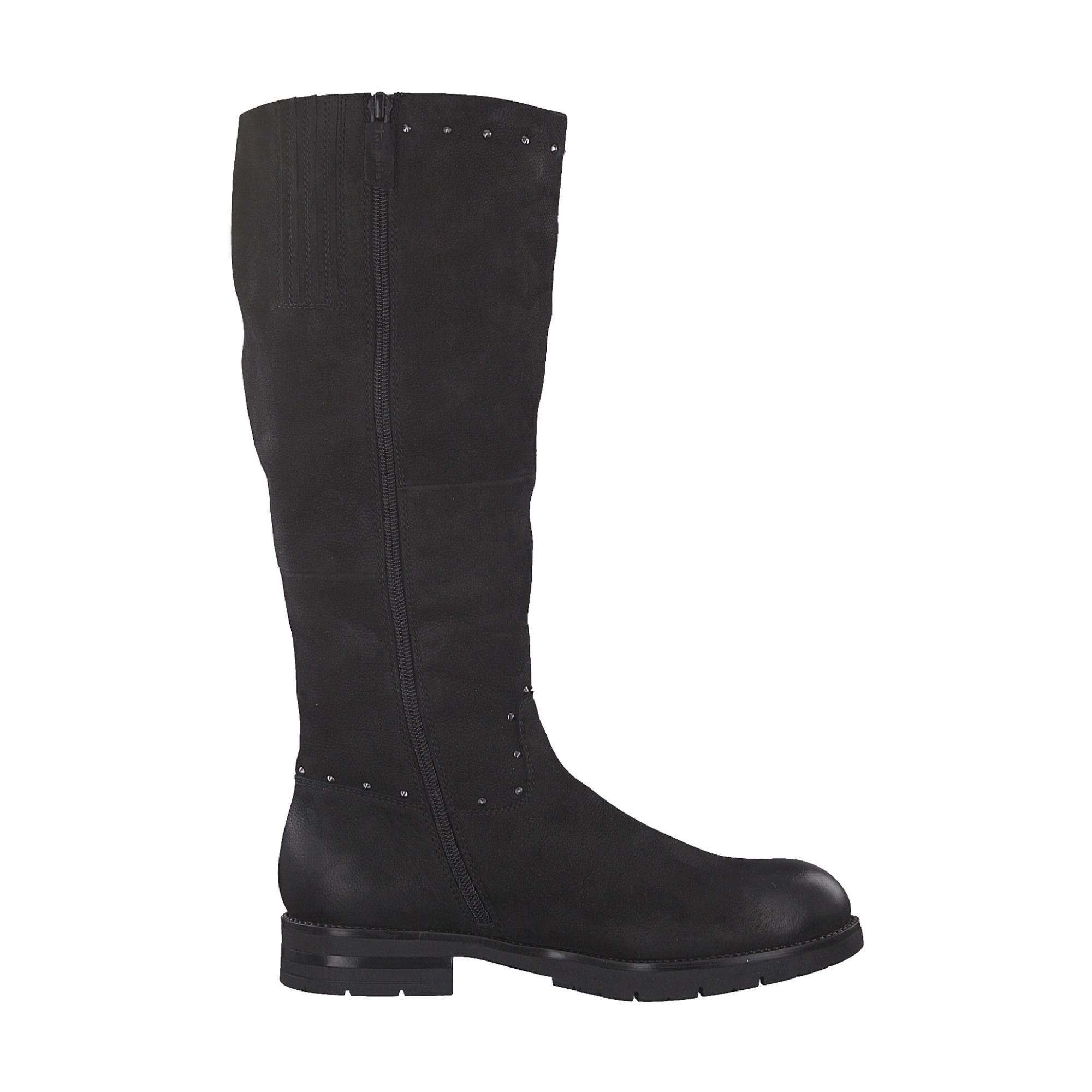 Dámské elegantní kozačky v černé barvě Vás oslní zdobnými metalickými cvočky u prošití a kolem kotníku v horní oblasti. Díky všitým gumičkám v horní části se bota lehce přizpůsobí obvodu Vašeho lýtka. Jsou vhodné pro každý dámský šatník a zároveň se hodí pro každou příležitost. Pro snadné obutí je zapracován funkční zip z vnitřní strany. Podešev jemně hrubšího vzoru a podpatek krásně podepře Vaši páteřní část, což jistě oceníte. Pohodlná stélka Vám zaručí komfort po celý den.