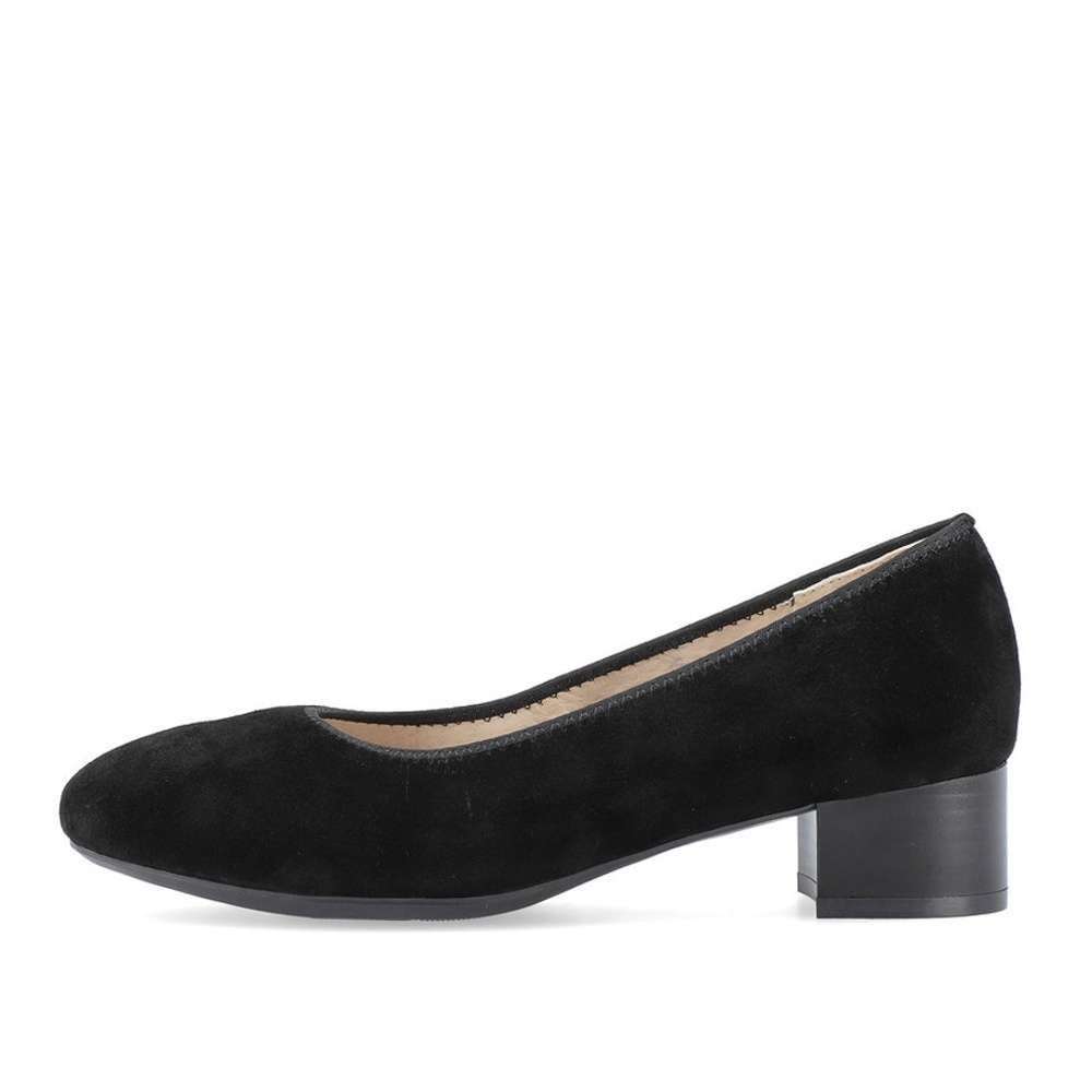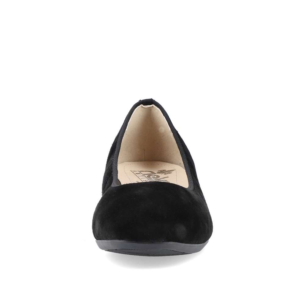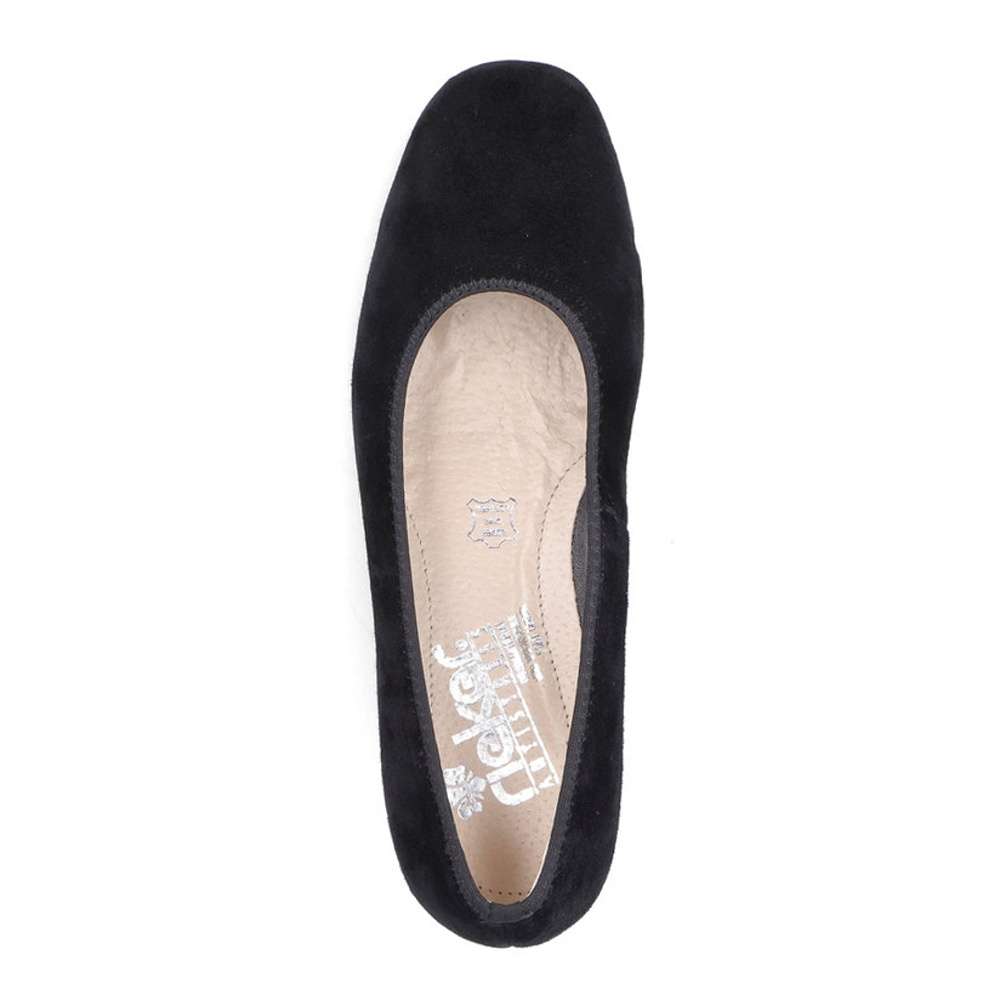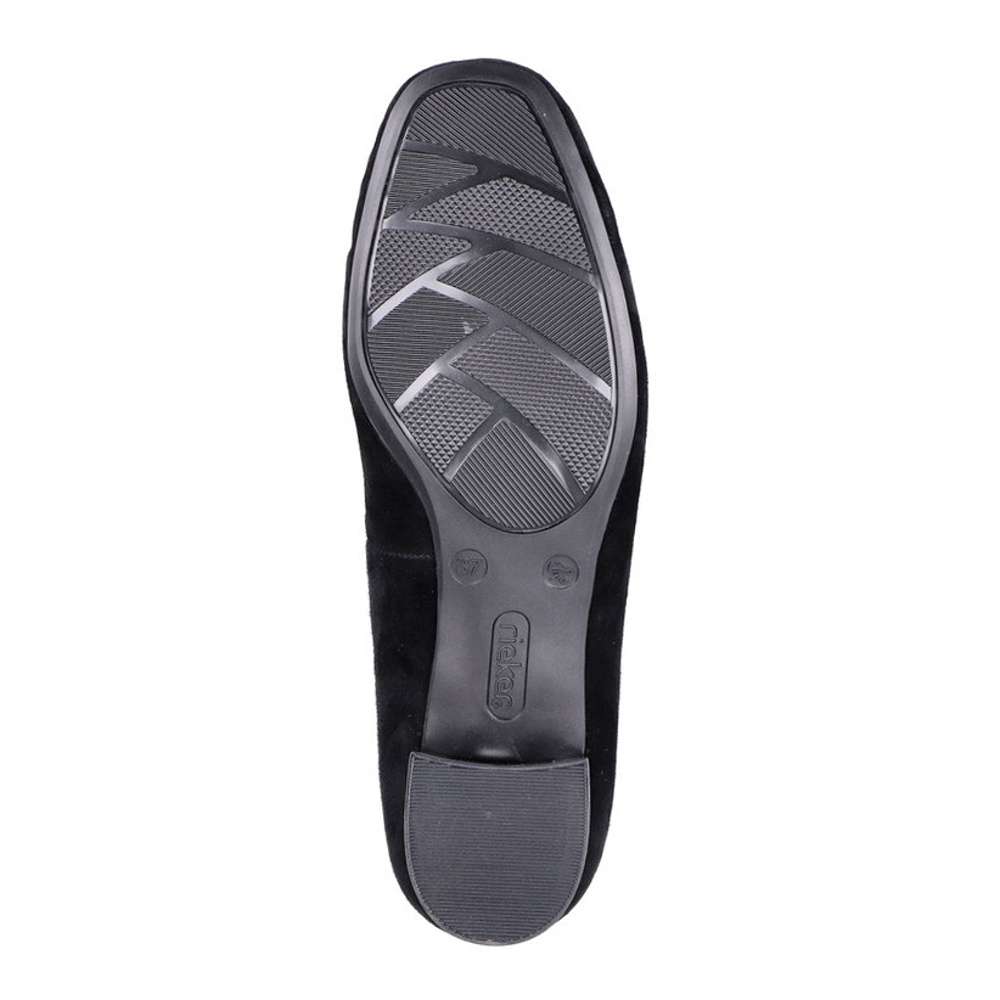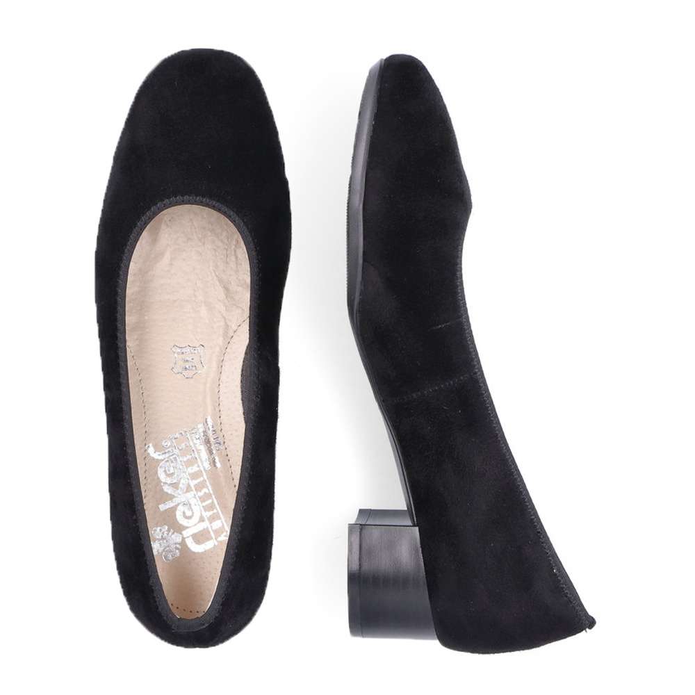 Klasické dámské lodičky jsou šité z pravé kůže černé barvy. Mají semišový povrch, kulatou špici, pružnou gumičku po obvodu pro přilehnutí k Vaší noze a logo firmy Rieker na straně paty. Měkká stélka a bokový podpatek se postarají o pohodlí na každém kroku. Užijete je k pracovním i volnočasovým aktivitám se všemi outfity.