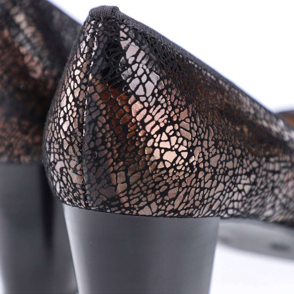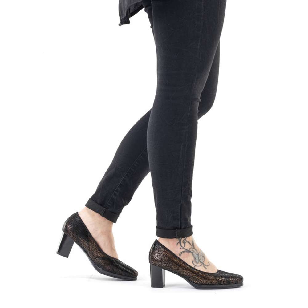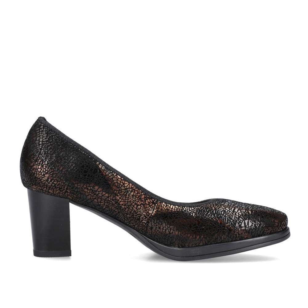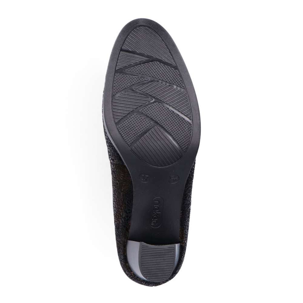 Klasické dámské lodičky s nádherným designovým svrškem jsou šité z pravé kůže. Mají semišový vzhled, užší špici, pružnou gumičku po obvodu pro přilehnutí k Vaší noze a logo firmy Rieker na straně paty. Měkká stélka a vyšší bokový podpatek se postarají o pohodlí na každém kroku. Užijete je k pracovním i volnočasovým aktivitám se všemi outfity.