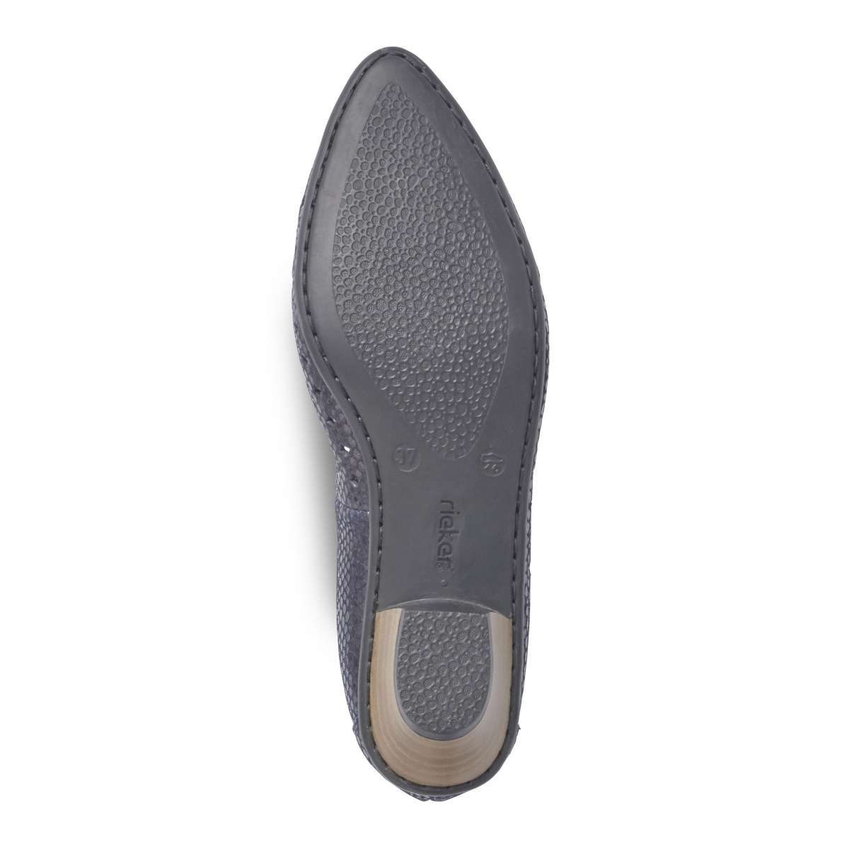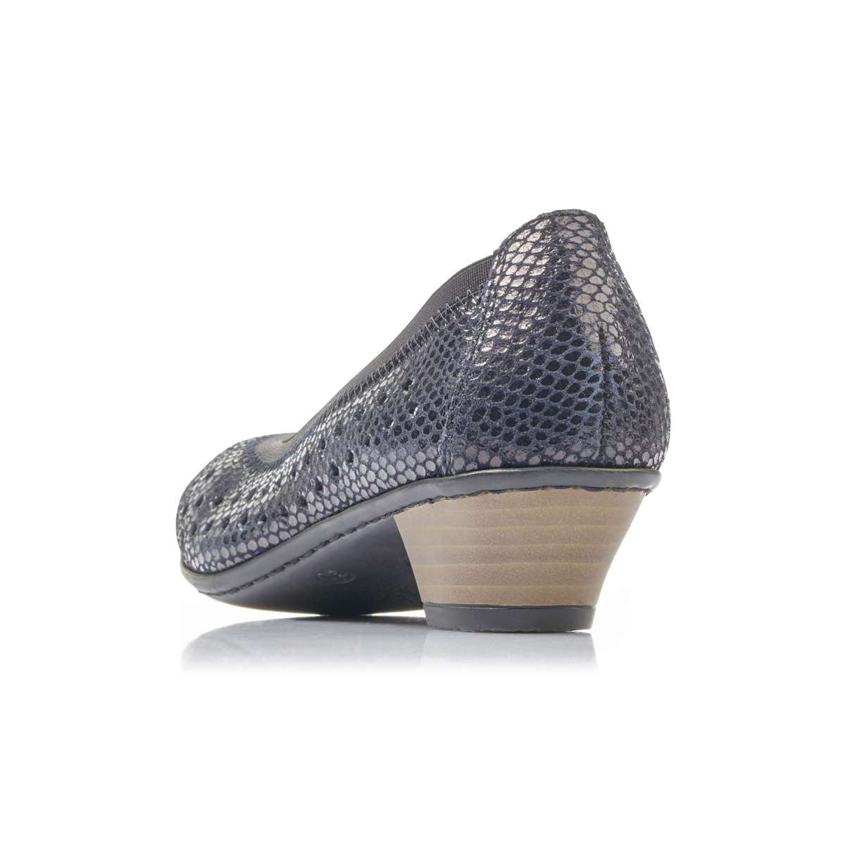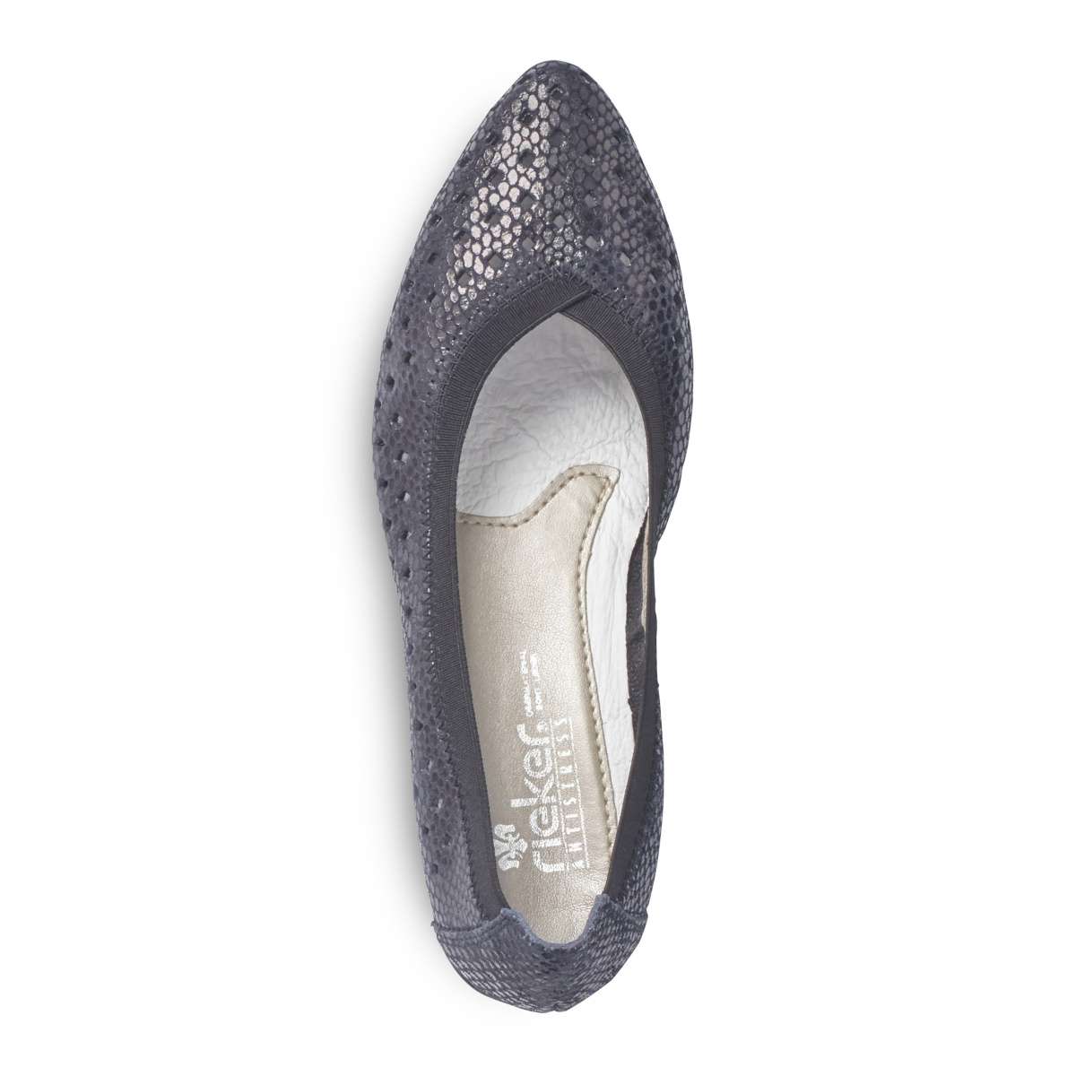 Dámské lodičky vyrobené z pravé kůže v modré barvě s metalickými odlesky a hadím vzorem je zdobená perforací ve špici i po stranách. Mají úzkou špičku, lemování kolem horního okraje, šití podešve a nízký kontrastní podpatek. Extra měkká kožená stélka se pak postará o Vaše pohodlí na každém kroku. Tento model je vhodný jak na nákupy, tak do práce.