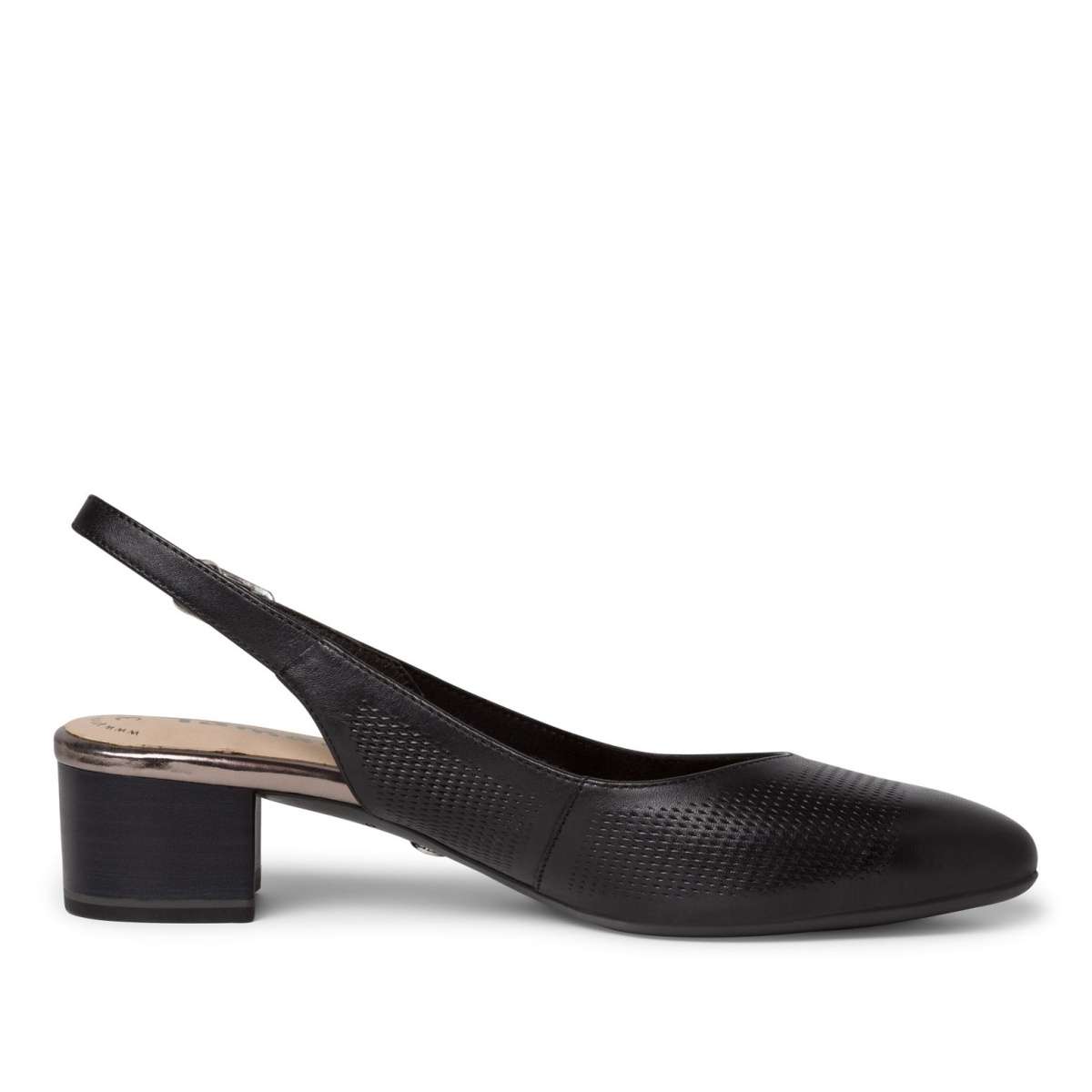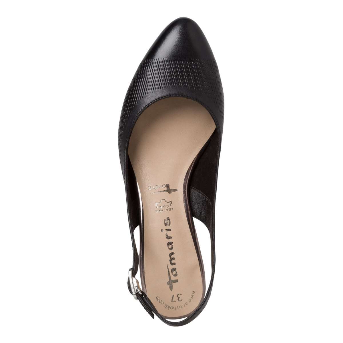 TAMARIS elegantní lodičky jednoduchého vzhledu s otevřenou patou. Svršek a podšívka jsou vyrobeny z materiálu, který se přizpůsobí Vaší noze. Na patě je vsazená gumička pod sponkou, díky které jdou lodičky snadno a pohodlně obout. Přední část svršku je do špičky se středně velkým vykrojením. Podešev je pevná a skvělá pro dny plné chůze, kdy chcete vypadat elegantně nebo i jen pro běžné nošení do práce nebo do města.