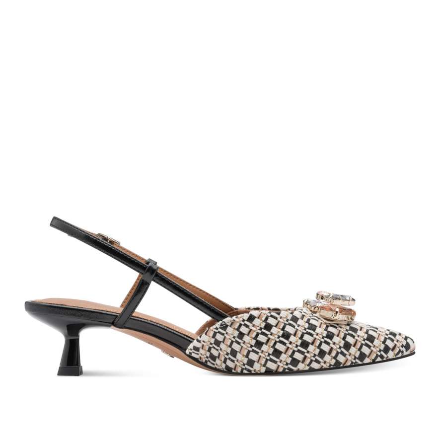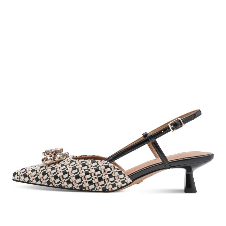Tyto lodičky Tamaris s volnou patou jsou zosobněním jemné elegance a ženského půvabu. Okouzlujícím vzorem v kontrastní barevné kombinaci a třpytivou dekorací dodávají modelu luxusní nádech, díky kterému budete nepřehlédnutelná. Měkká stélka se postará o pohodlí i během delšího dne či večera, takže si svůj výjimečný vzhled můžete užívat bez kompromisů. Zadní pásek s nastavitelnou sponou umožňuje přesné přizpůsobení noze a zajistí stabilitu při chůzi. Nízký podpatek působí elegantně, zároveň však neubírá na komfortu při chůzi. Tyto lodičky Tamaris jsou ideální volbou pro chvíle, kdy chcete zazářit – ať už na společenské události, večeři nebo při slavnostní příležitosti.