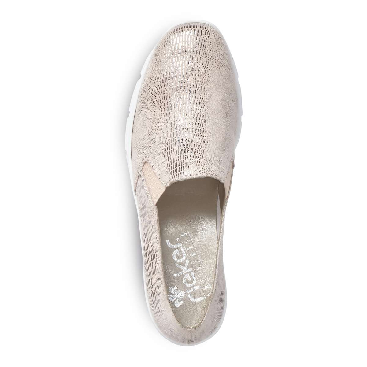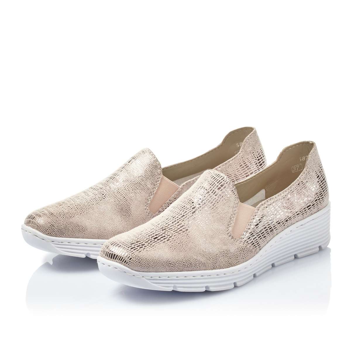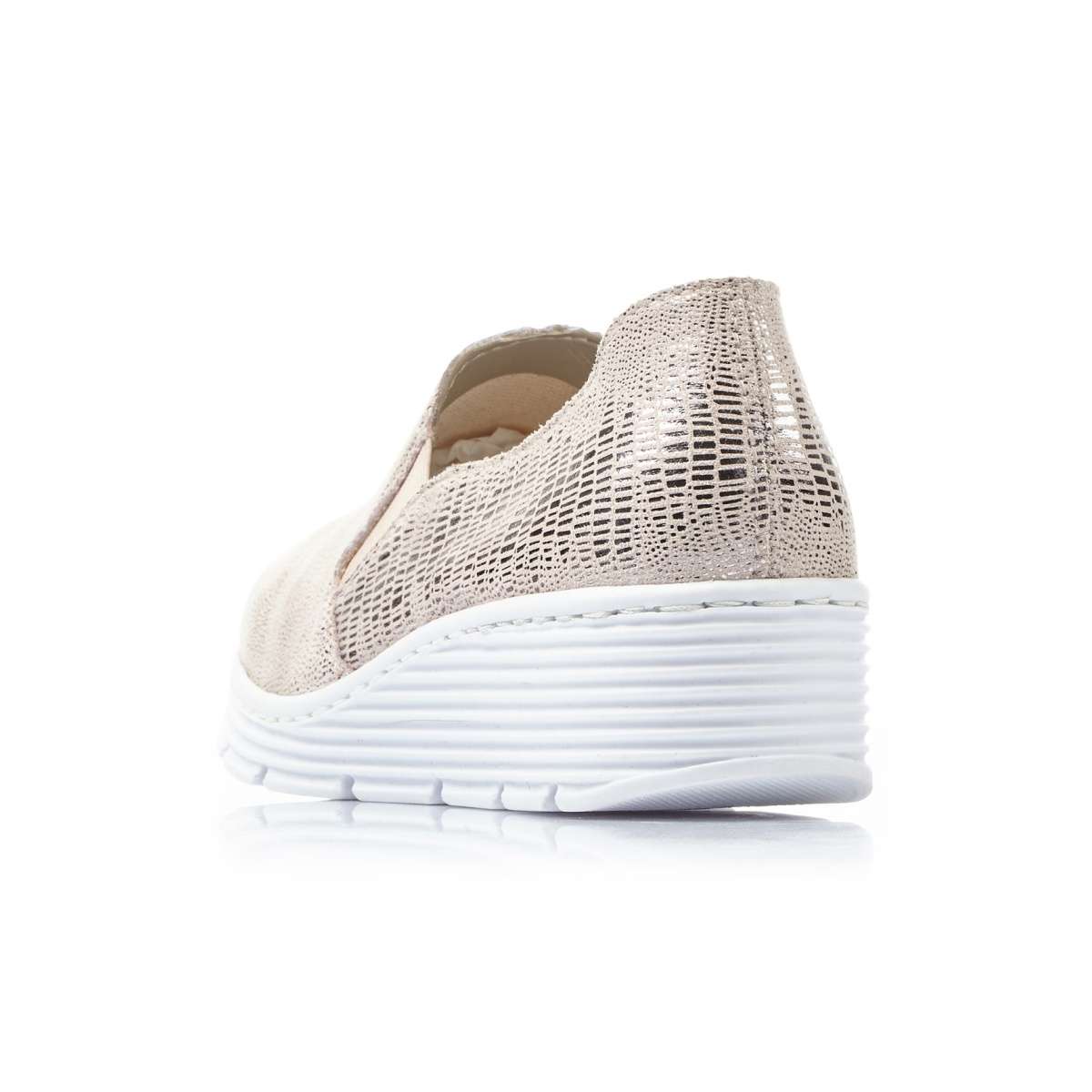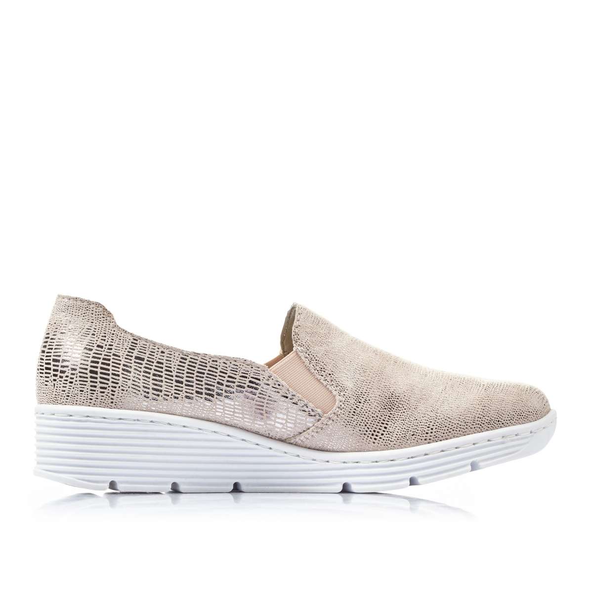 Lesklé vzorované růžovo-béžové mokasíny s výraznou bílou podešví na nízké platformě, ve kterých budete kouzelná. Díky technologii Antistress, která tlumí nárazy při chůzi jsou i pohodlné při dlouhodobé chůzi. Nazouvání Vám ulehčí vsazené gumičky v oblasti nártu. Boty si můžete obout do práce, na schůzku nebo na procházku s rodinou.