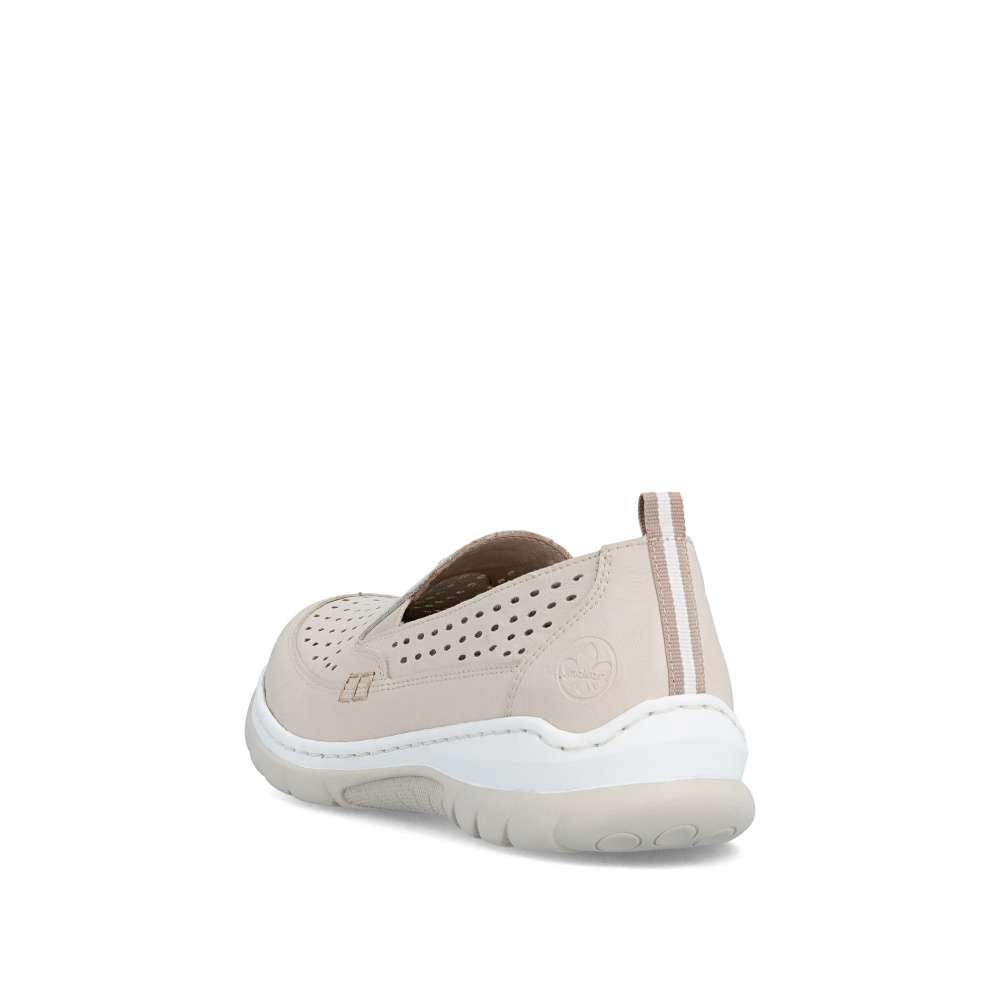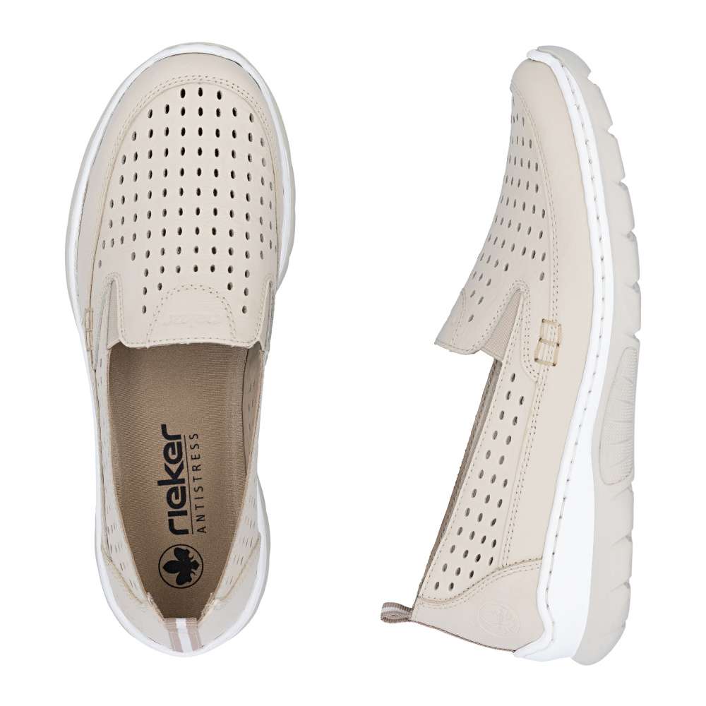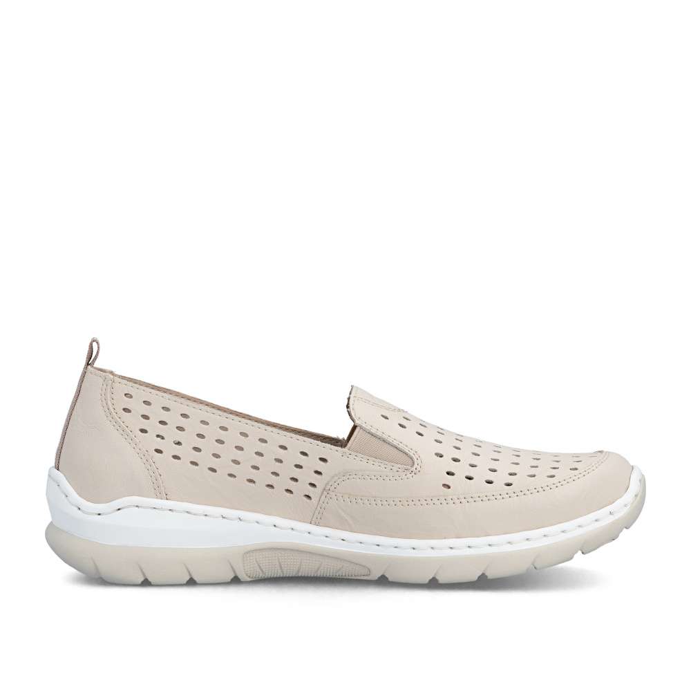 Mokasíny RIEKER v moderně nadčasovém stylu okouzlí již na první pohled koženým svrškem v béžovém odstínu s jemnou perforací, která dodává obuvi lehkost a svěží vzhled. Decentní logo značky podtrhuje kvalitu zpracování a zvýrazňuje jejich exkluzivní charakter. Uvnitř se nachází textilní stélka z paměťové pěny, která se dokonale přizpůsobí chodidlu a zajistí měkký došlap po celý den. Komfortním prvkem je také flexibilní podešev tlumící nárazy při chůzi, která podporuje přirozený pohyb nohy a zároveň dodává obuvi moderní výraz. Mokasíny poskytnou lehkost každého kroku a atraktivní vzhled – ať už v práci, ve městě nebo při volnočasových aktivitách.