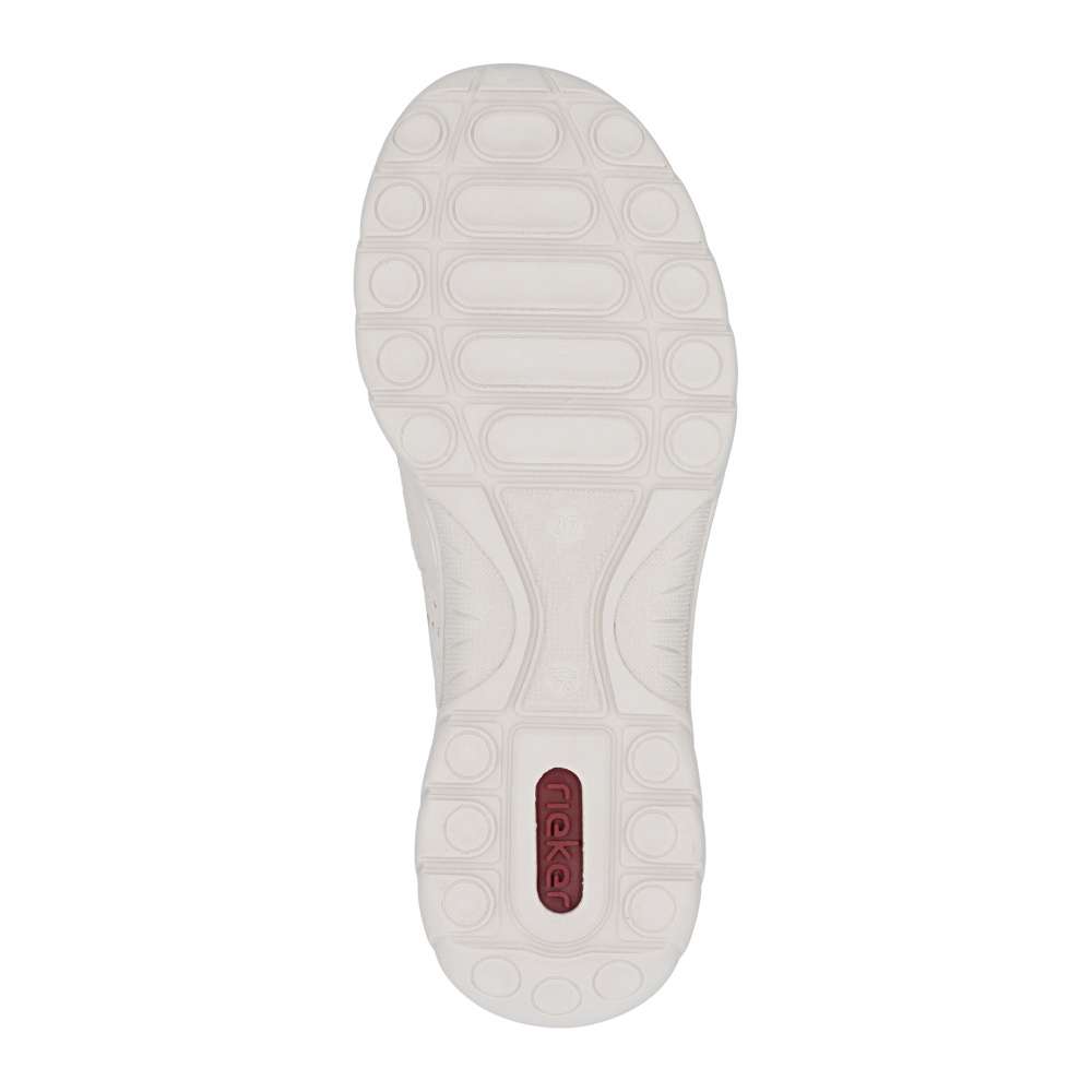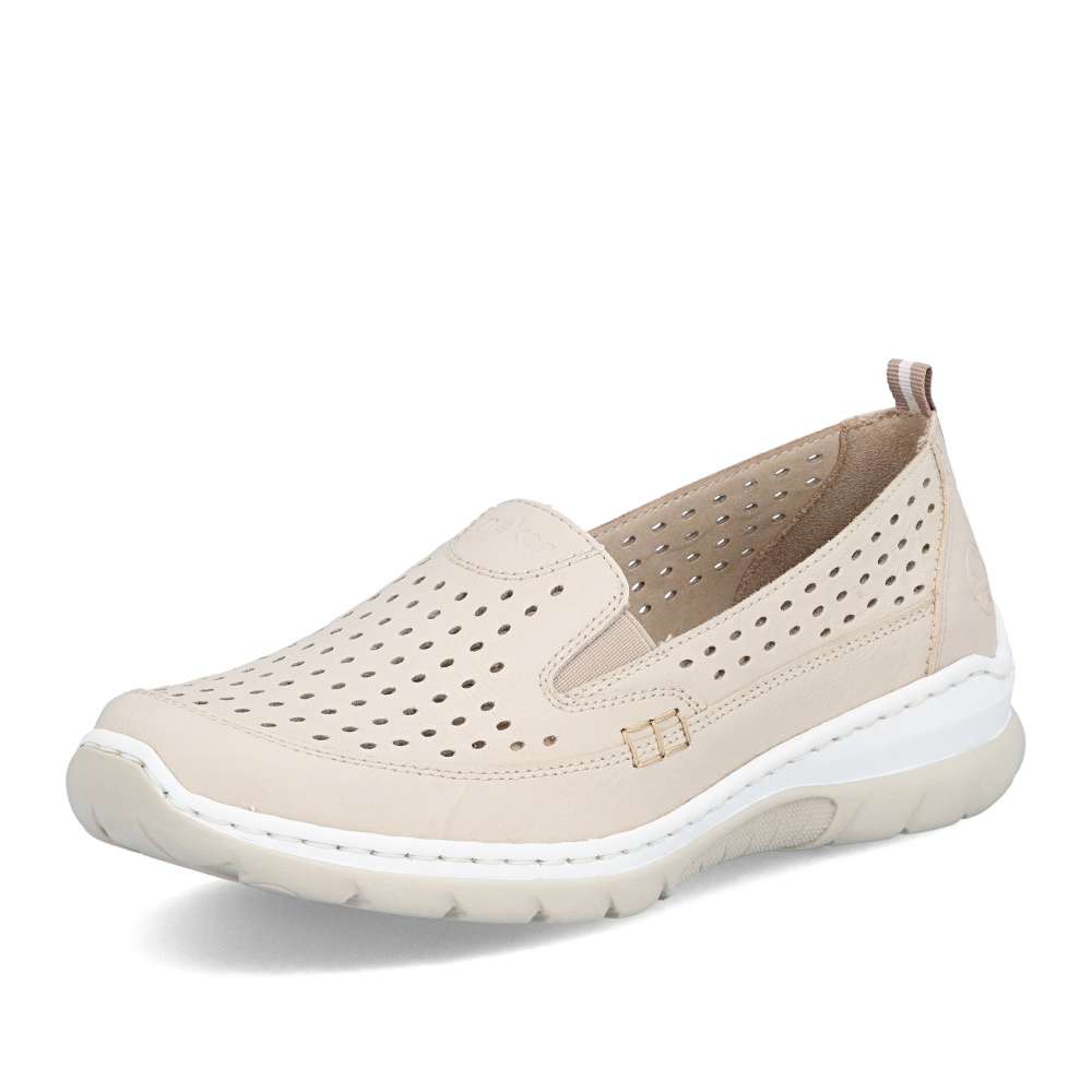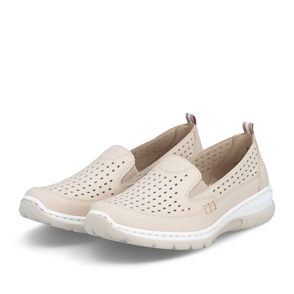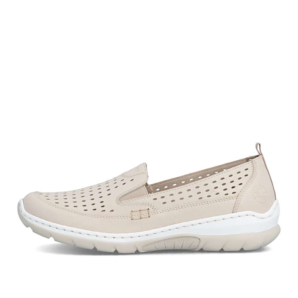 Mokasíny RIEKER v moderně nadčasovém stylu okouzlí již na první pohled koženým svrškem v béžovém odstínu s jemnou perforací, která dodává obuvi lehkost a svěží vzhled. Decentní logo značky podtrhuje kvalitu zpracování a zvýrazňuje jejich exkluzivní charakter. Uvnitř se nachází textilní stélka z paměťové pěny, která se dokonale přizpůsobí chodidlu a zajistí měkký došlap po celý den. Komfortním prvkem je také flexibilní podešev tlumící nárazy při chůzi, která podporuje přirozený pohyb nohy a zároveň dodává obuvi moderní výraz. Mokasíny poskytnou lehkost každého kroku a atraktivní vzhled – ať už v práci, ve městě nebo při volnočasových aktivitách.