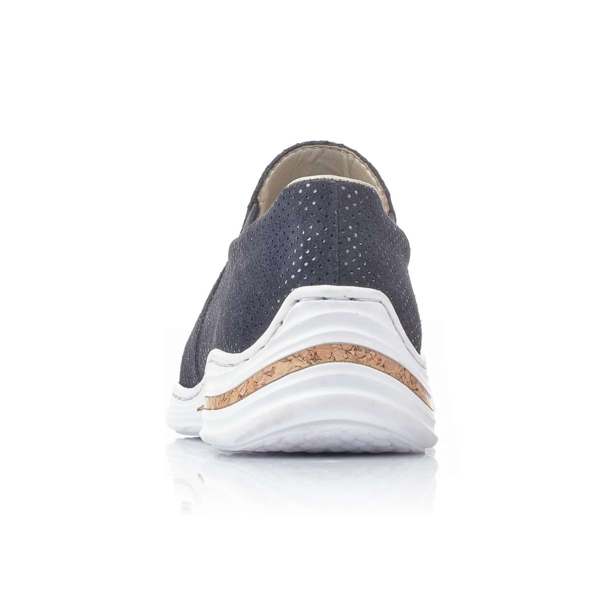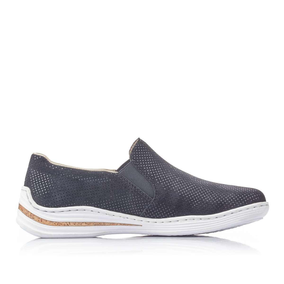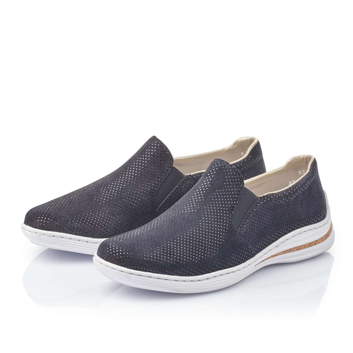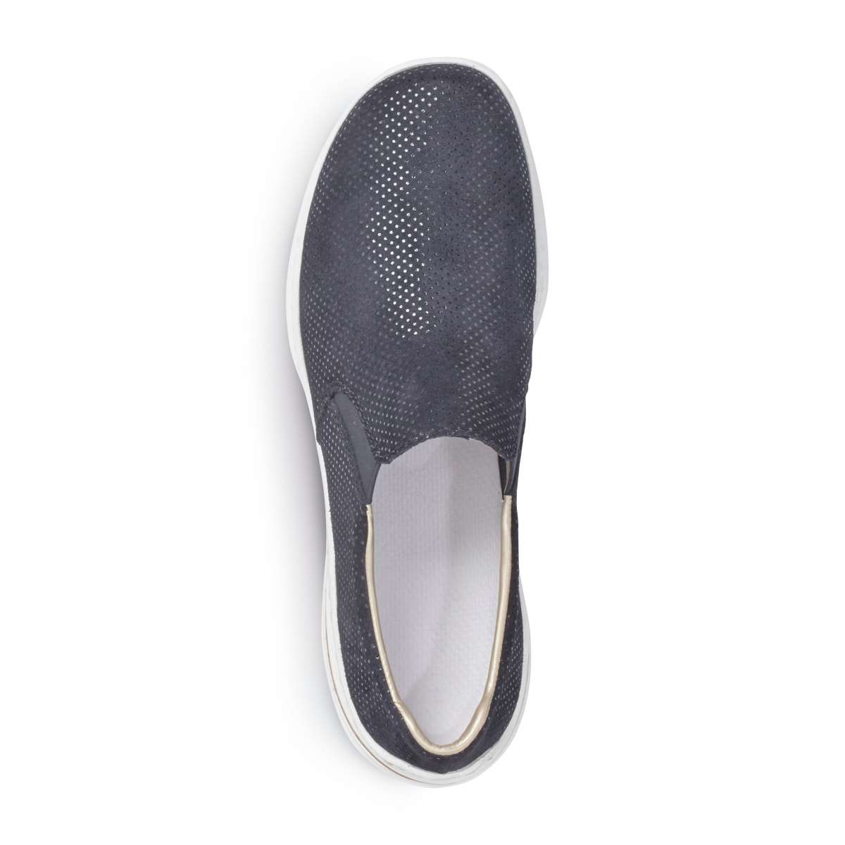 Dámské mokasíny z pravé broušené kůže jsou po celém svém povrchu zdobeny malými lesklými puntíky. Pro snadné nazouvání slouží všité pružné gumičky po stranách obuvi. Bílá syntetická podešev je díky technologii Anistress pružná, flexibilní a je ozdobena proužkem v motivu korku. Tato pohodlná obuv skvěle doplní Vaše každodenní pochůzky městem.