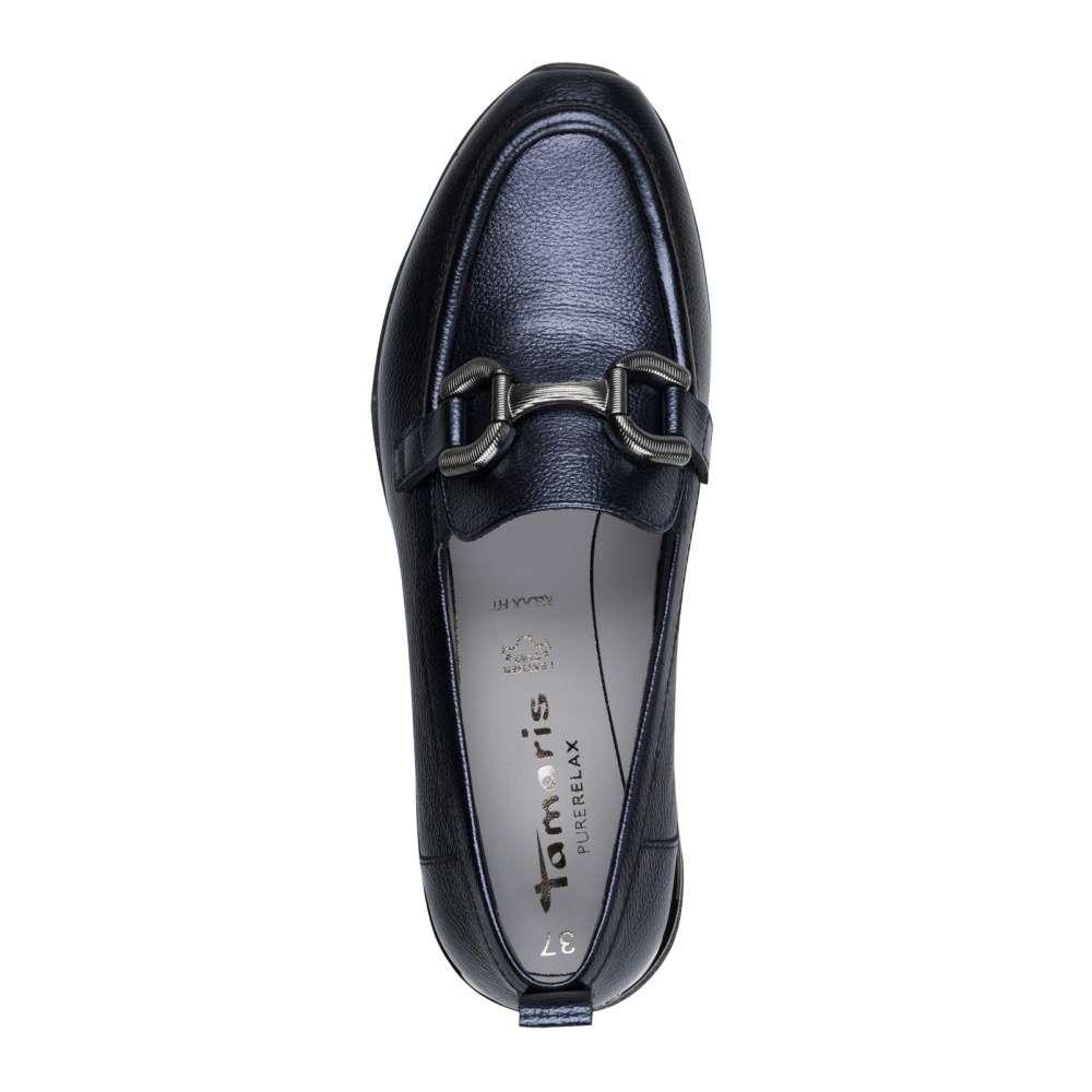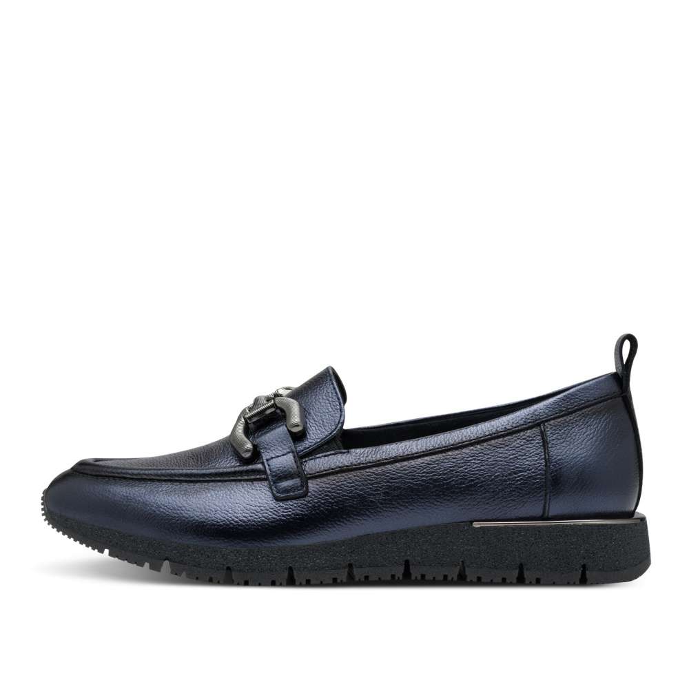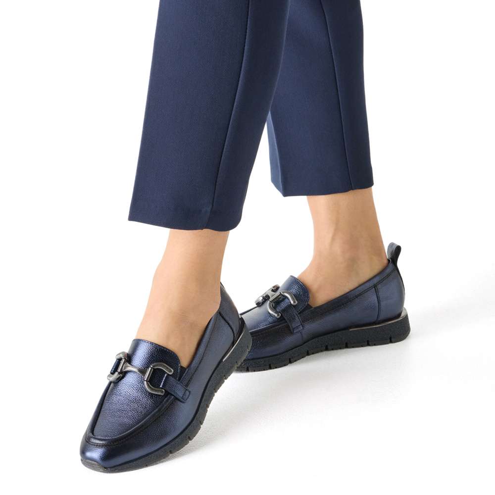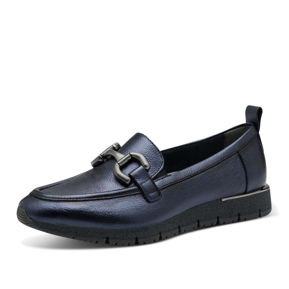Pohodlí v módním stylu – přesně to vystihuje tyto kožené mokasíny značky Tamaris. Tmavě modrý svršek s efektními odlesky a výraznou sponou na nártu propůjčuje těmto botám jedinečný vzhled, zatímco jemné dekorativní prošití podtrhuje jejich detailní zpracování. Pečlivě tvarovaná podešev s lesklým lemem v zadní části nabízí stabilitu a pohodlí i při delším nošení, a vyjímatelná kožená stélka zajistí komfort po celý den. Díky kombinaci stylu a praktičnosti se boty snadno nazouvají a jsou perfektní volbou pro každodenní nošení – skvěle doplní pracovní outfit i ležérní look, a umožní vám cítit se elegantně a pohodlně při každém kroku.
