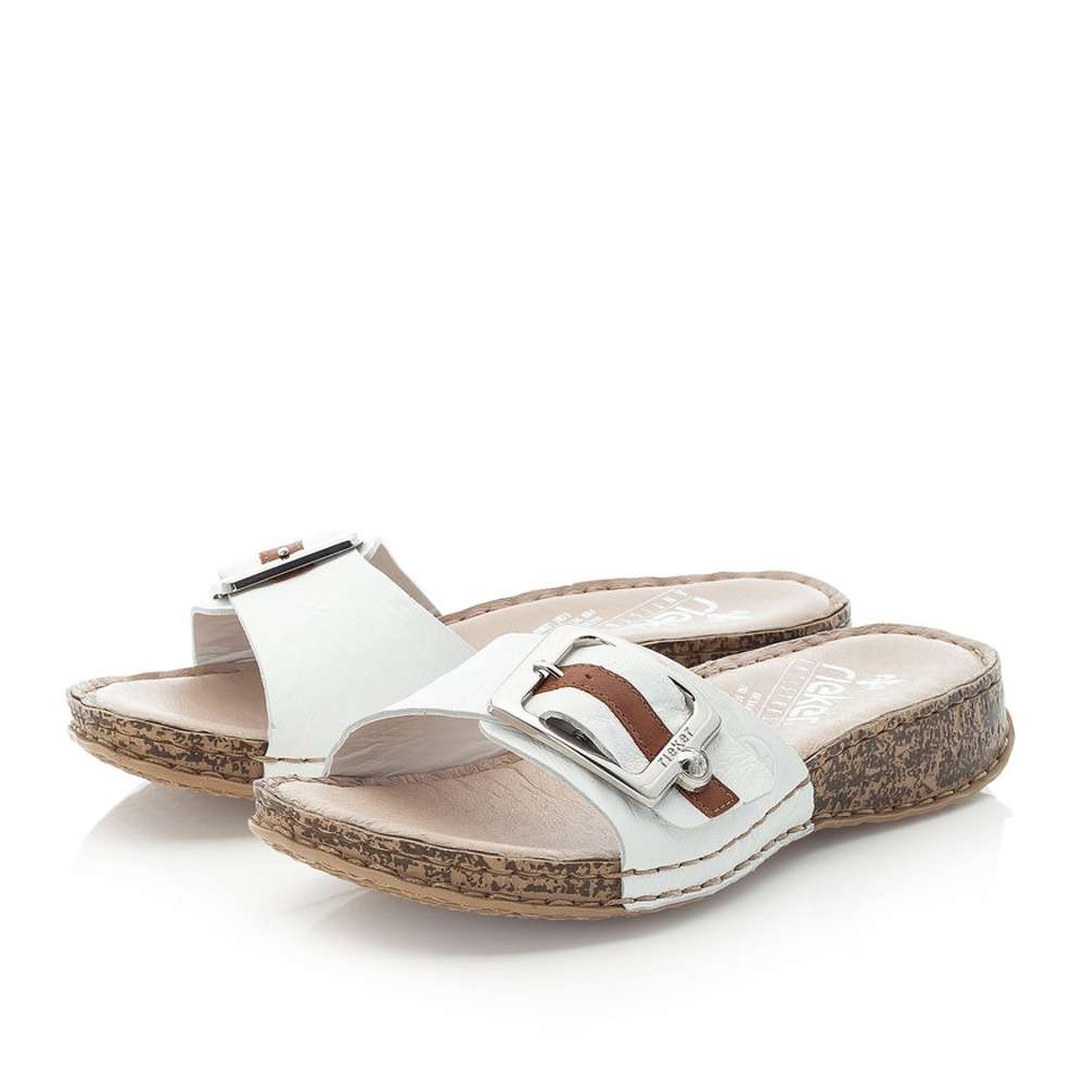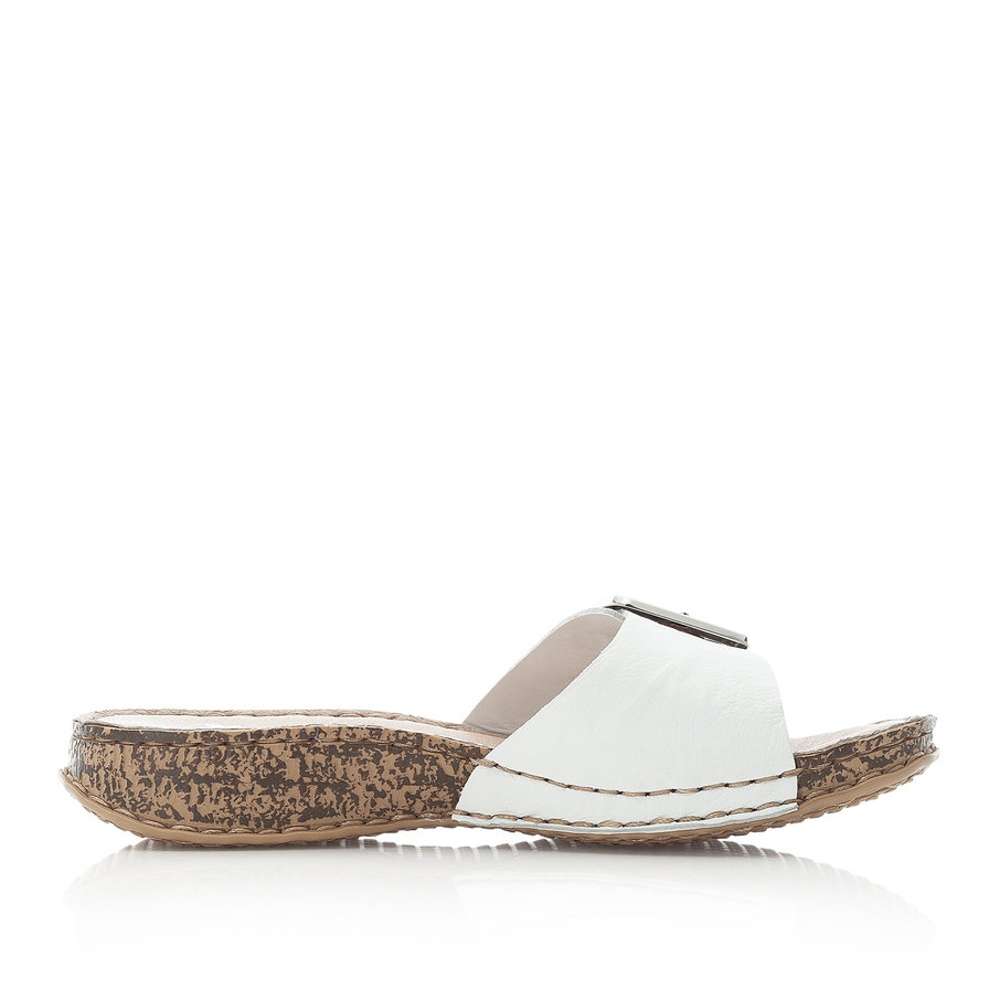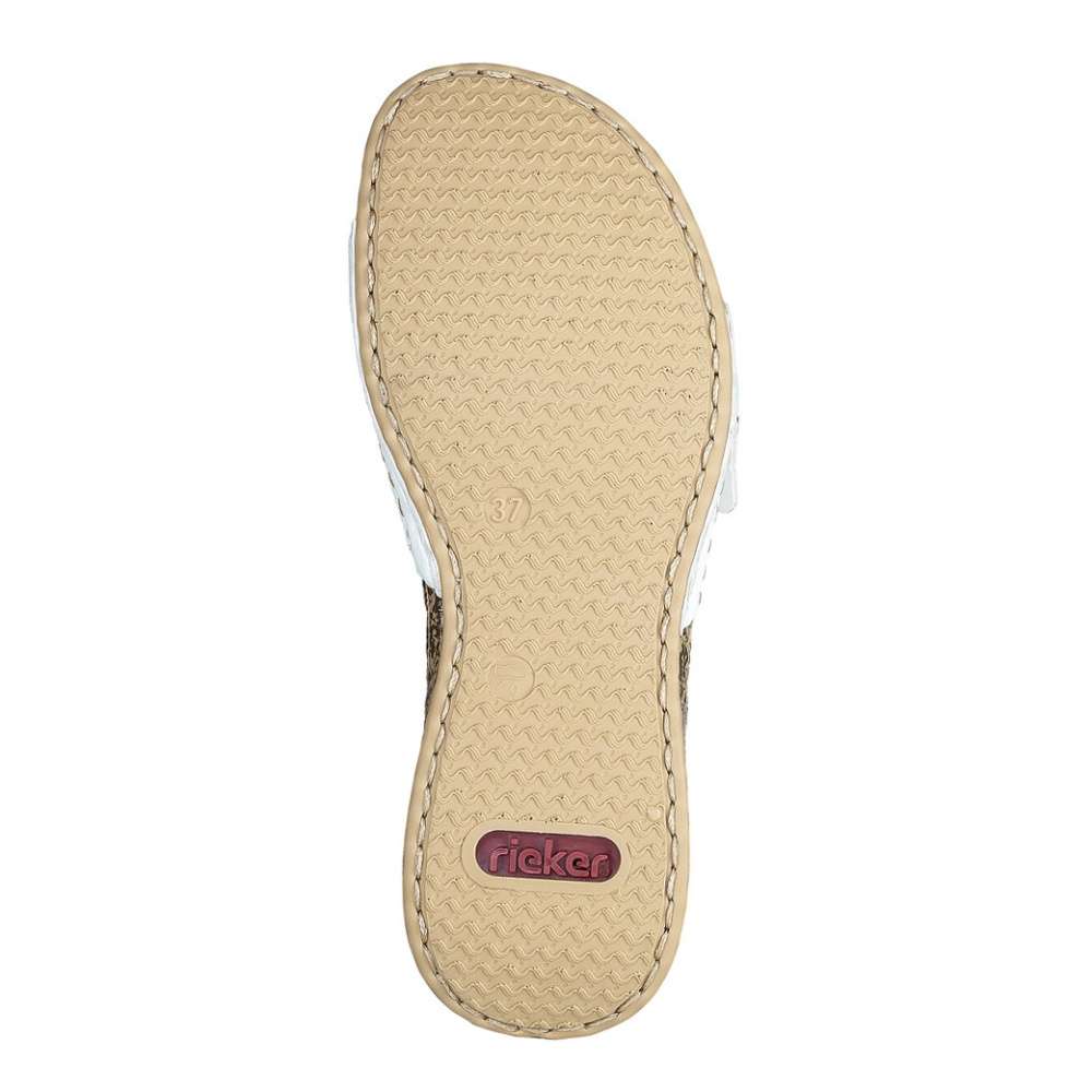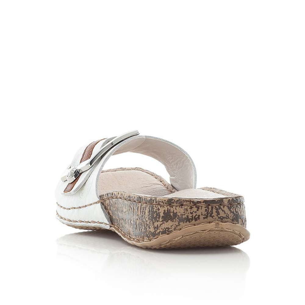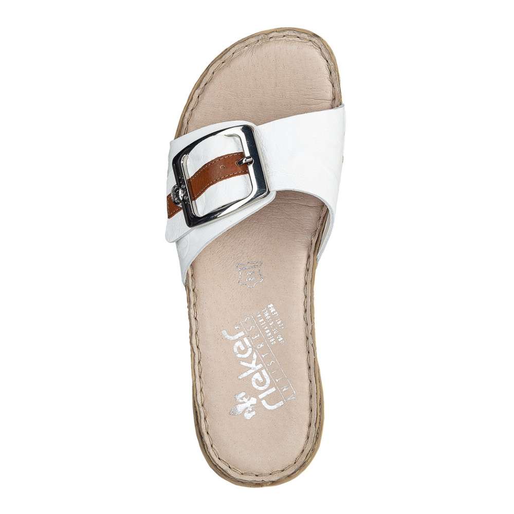 Jednoduché přesto designové nazouváky značky RIEKER budou tou správnou volbou. Širší pásek je vyrobený z pravé hladké kůže a je decentně ozdoben hnědým tenkým proužkem. Velká stříbrná spona slouží k nastavení obuvi přímo dle Vašich požadavků. Kožená stélka je pro Vaše pohodlí vyrobena z paměťové pěny a podešev dolaďuje celkový vzhled obuvi k dokonalosti. Tyto nazouváky budou v letních dnech nezbytnou součástí Vašeho botníku a díky jednoduchosti jej můžete sladit k jakémukoliv outfitu.
