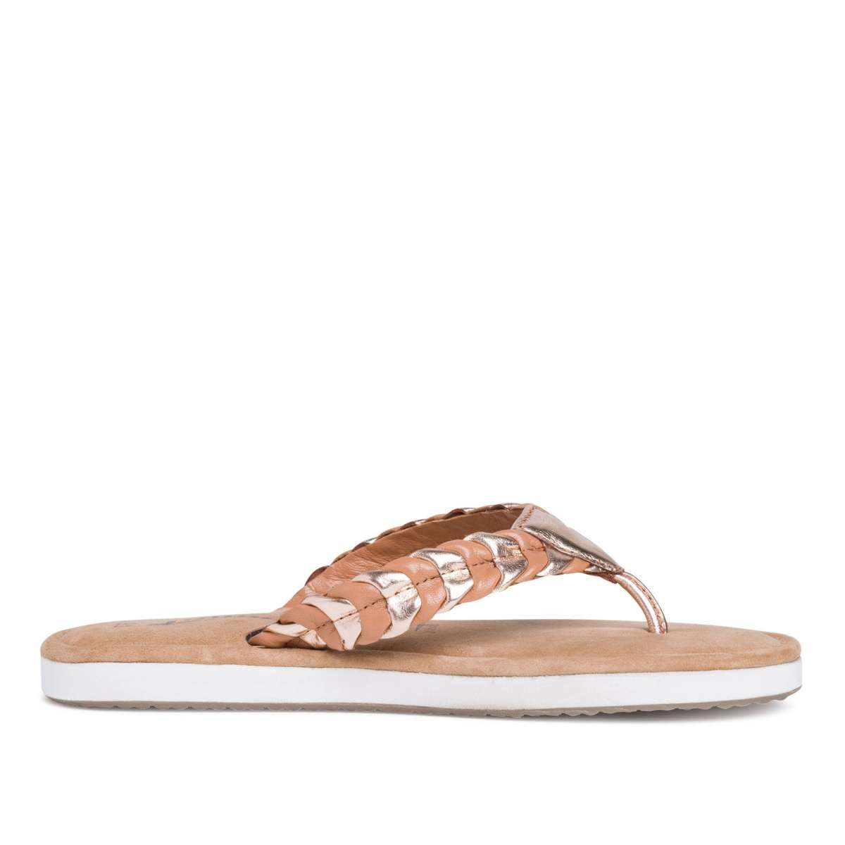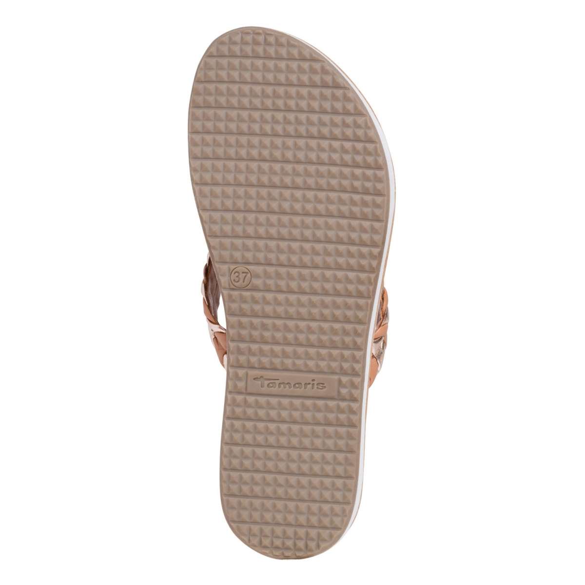 Dámské nazouváky žabkového stylu značky Tamaris mají hladký povrch a kulatou špičku. Zdobené jsou provedením a designem svršku, který je pro každou barvu unikátní. Kožený pásek je složen ze světle hnědých a bronzových částí, měkká světle hnědá stélka je vyrobena z paměťové pěny a celkový vzhled obuvi doplňuje bílá podešev. Tento model je vhodný na procházky po městě či na dovolené.