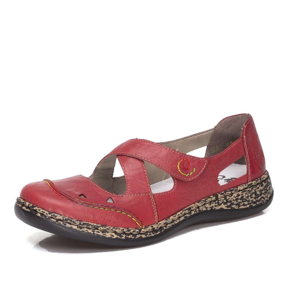Dámská polobotka červené barvy, s designovou podešví, s výkroji pro vzdušnost obuvi. Jeden pásek přes nárt má na vnitřní straně všitou pružnou gumičku pro lepší přizpůsobení noze a druhý má zapínání na suchý zip. Při celodenním chození oceníte měkkou stélku, která se postará o Vaše pohodlí při každém kroku. Tento model unosíte jak do práce k sukni, tak na běžné pochůzky městem či na nákupy.