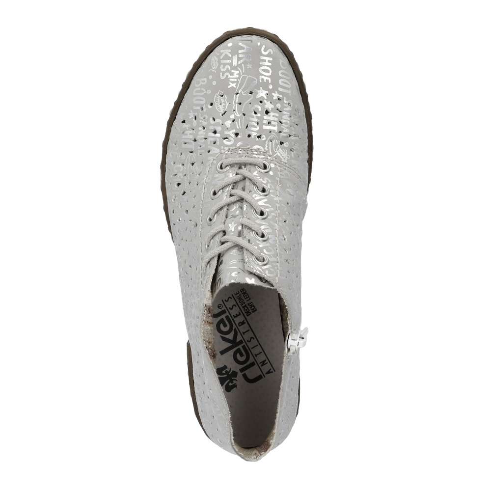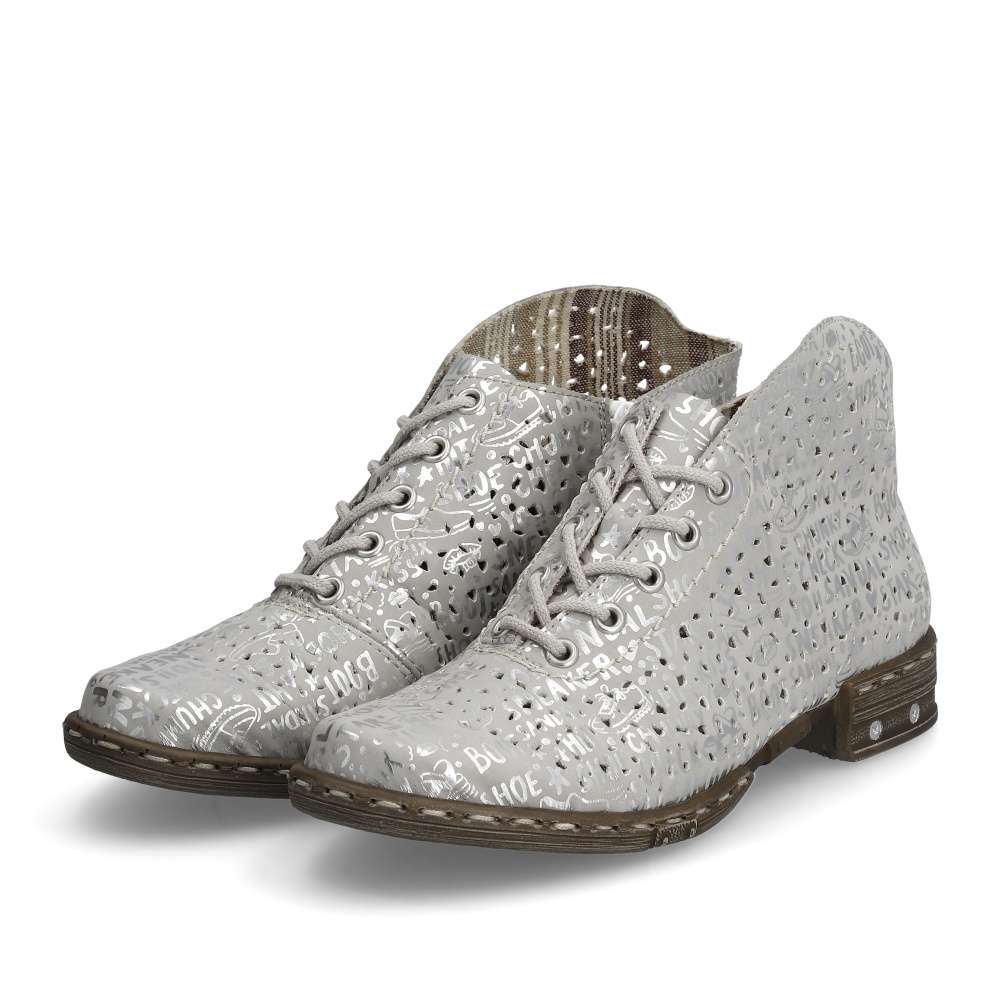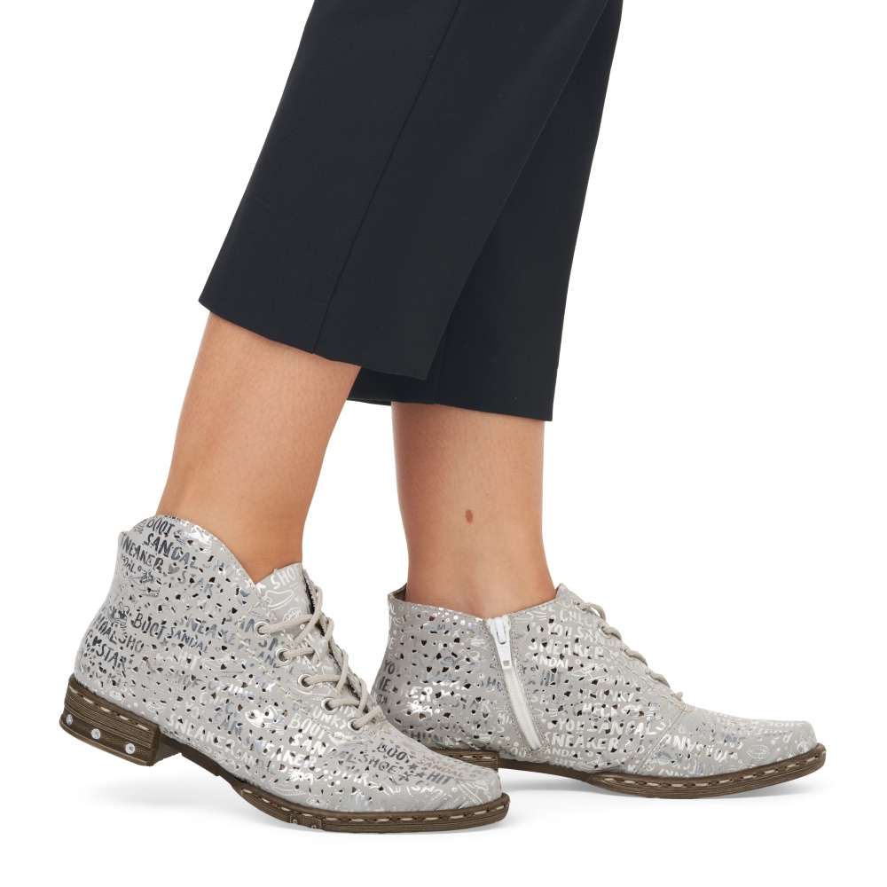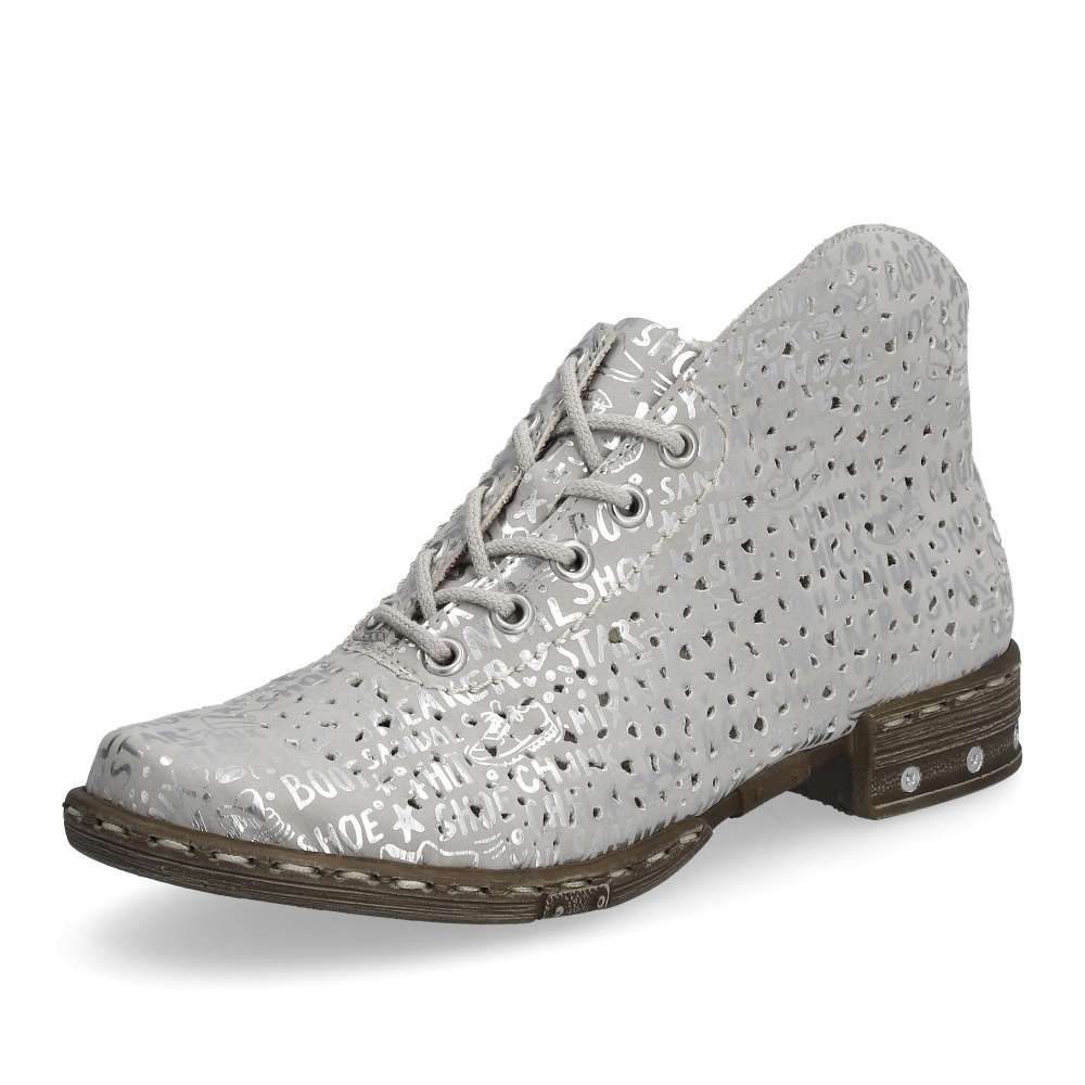 Šedé polobotky se stříbrným zdobením od značky RIEKER s perforací svrchního materiálu a asymetrickým horním okrajem. Ke snadnějšímu obutí skvěle poslouží funkční zip na vnitřní straně a tkaničkami na šněrování si je můžete upravit přesně podle Vašich představ. Měkká stélka z pravé přírodní usně zajistí pohodlnou a komfortní chůzi po celý den nošení. Obuv ideální na procházky parkem nebo na představení do divadla.