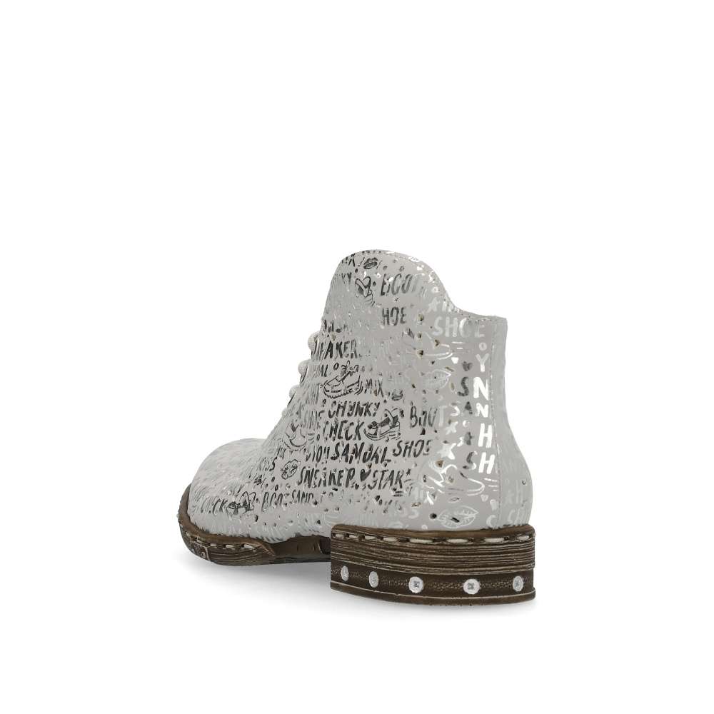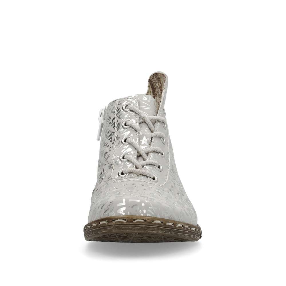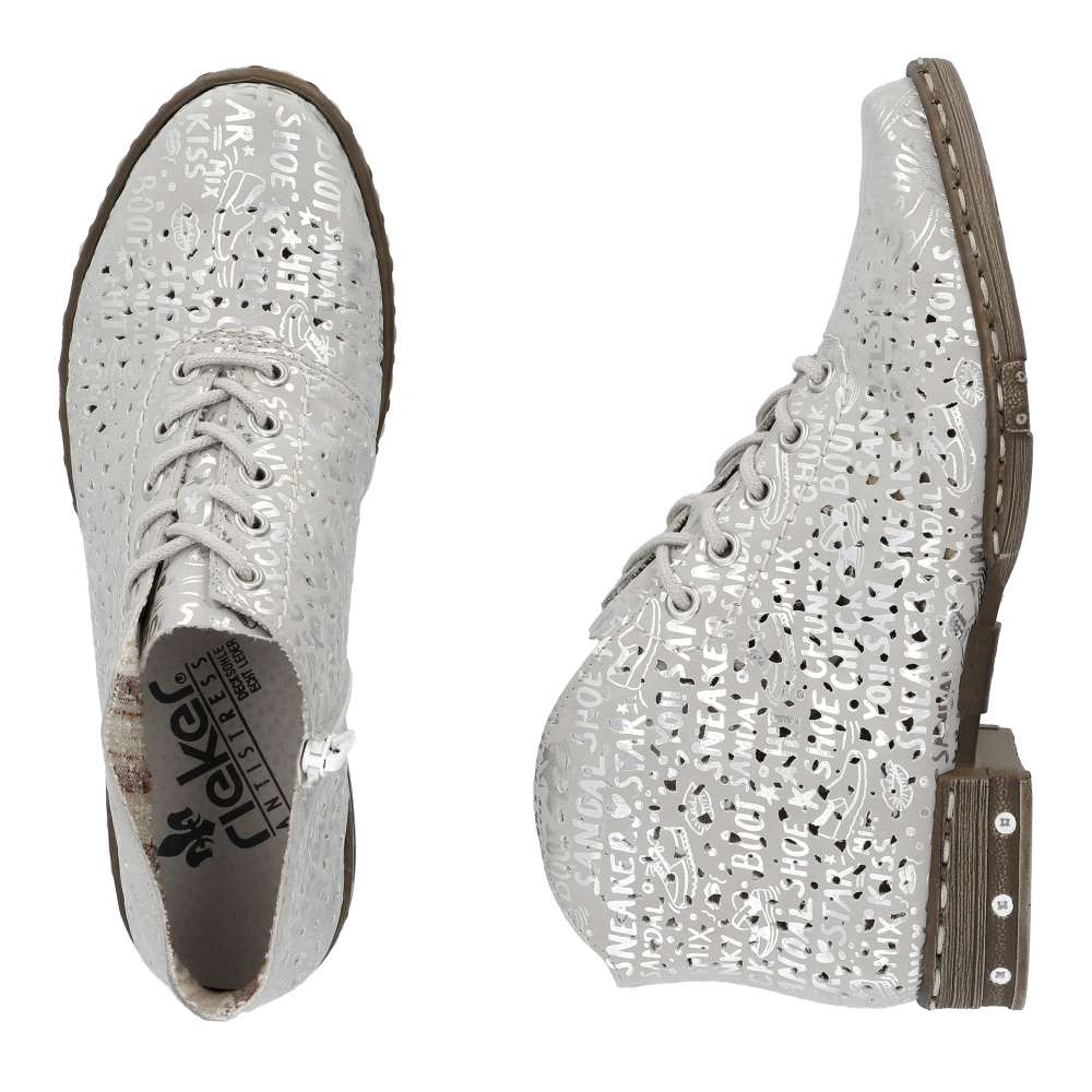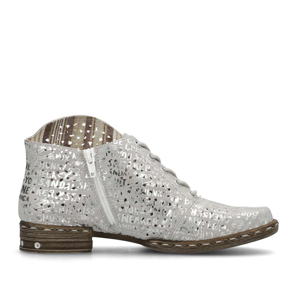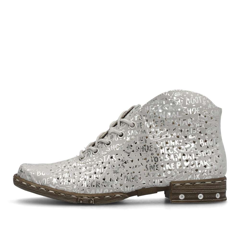 Šedé polobotky se stříbrným zdobením od značky RIEKER s perforací svrchního materiálu a asymetrickým horním okrajem. Ke snadnějšímu obutí skvěle poslouží funkční zip na vnitřní straně a tkaničkami na šněrování si je můžete upravit přesně podle Vašich představ. Měkká stélka z pravé přírodní usně zajistí pohodlnou a komfortní chůzi po celý den nošení. Obuv ideální na procházky parkem nebo na představení do divadla.