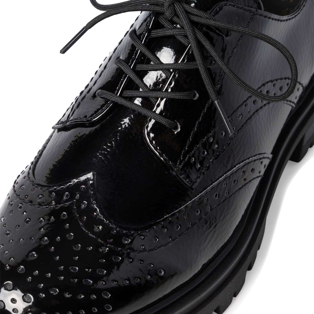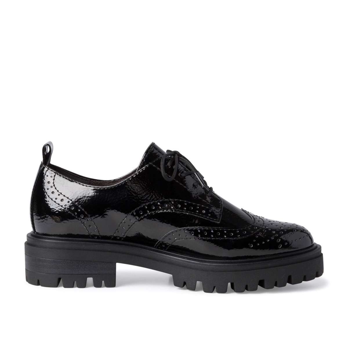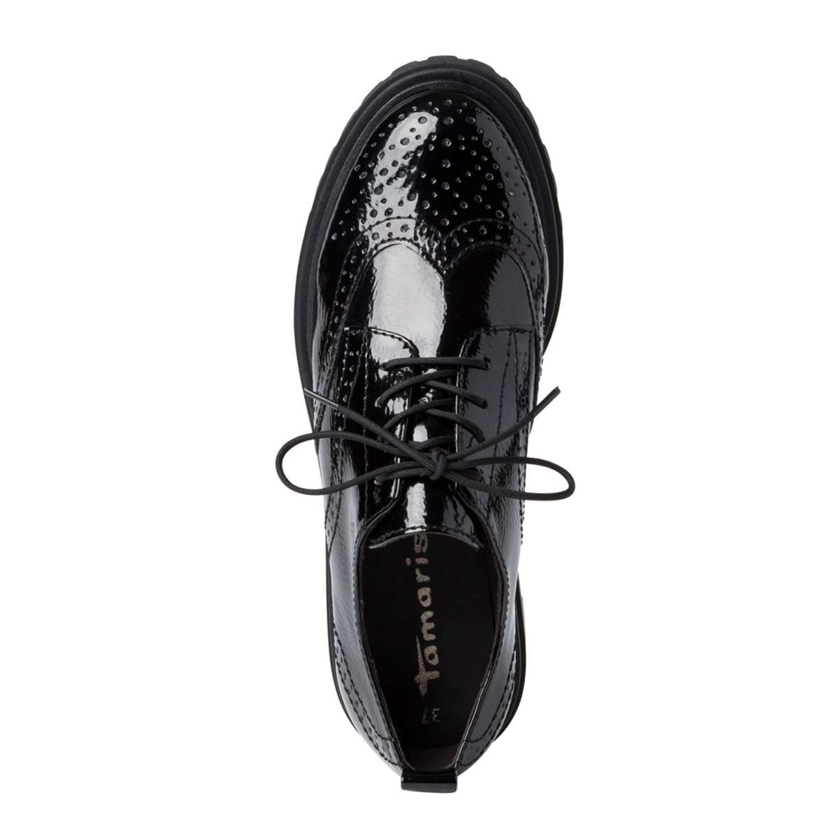 Dámské polobotky od značky Tamaris s lesklým vzorovaným povrchem a hrubou podešví v černé barvě. Tkaničkami na šněrování si je můžete utáhnout přesně podle Vaší potřeby. Měkká paměťová stélka zaručí pohodlí a komfort i při celodenním nošení a hrubá podešev Vám zajistí bezpečnou chůzi. Tento model je vhodný pro ženy, co mají rády svůj komfort a styl.
