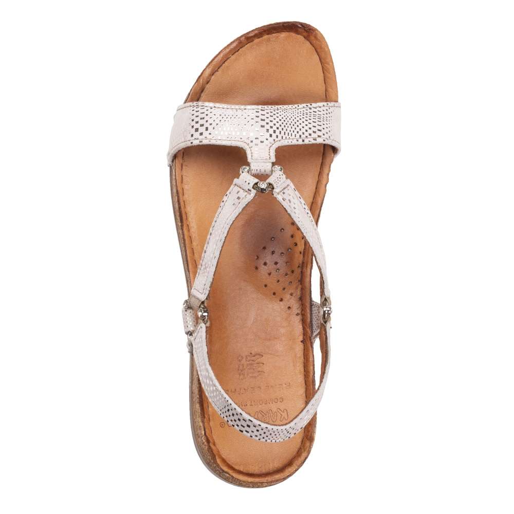 Zajímavé dámské kožené sandály značky IBERIUS budou tou správnou volbou. Kožený svršek je složen z několika pásků ozdobených stříbrnými aplikacemi. Pásky jsou spojeny pomocí ozdobných sponek a jsou na nich přišity i pružné gumičky pro snadné nazouvání. Stélka vyrobená z pravé kůže je pro každý Váš krok příjemně měkká a korková podešev doladí celkový vzhled k dokonalosti. Tento model je vhodný jak k pracovním povinnostem, tak k volnočasovým procházkám městem.