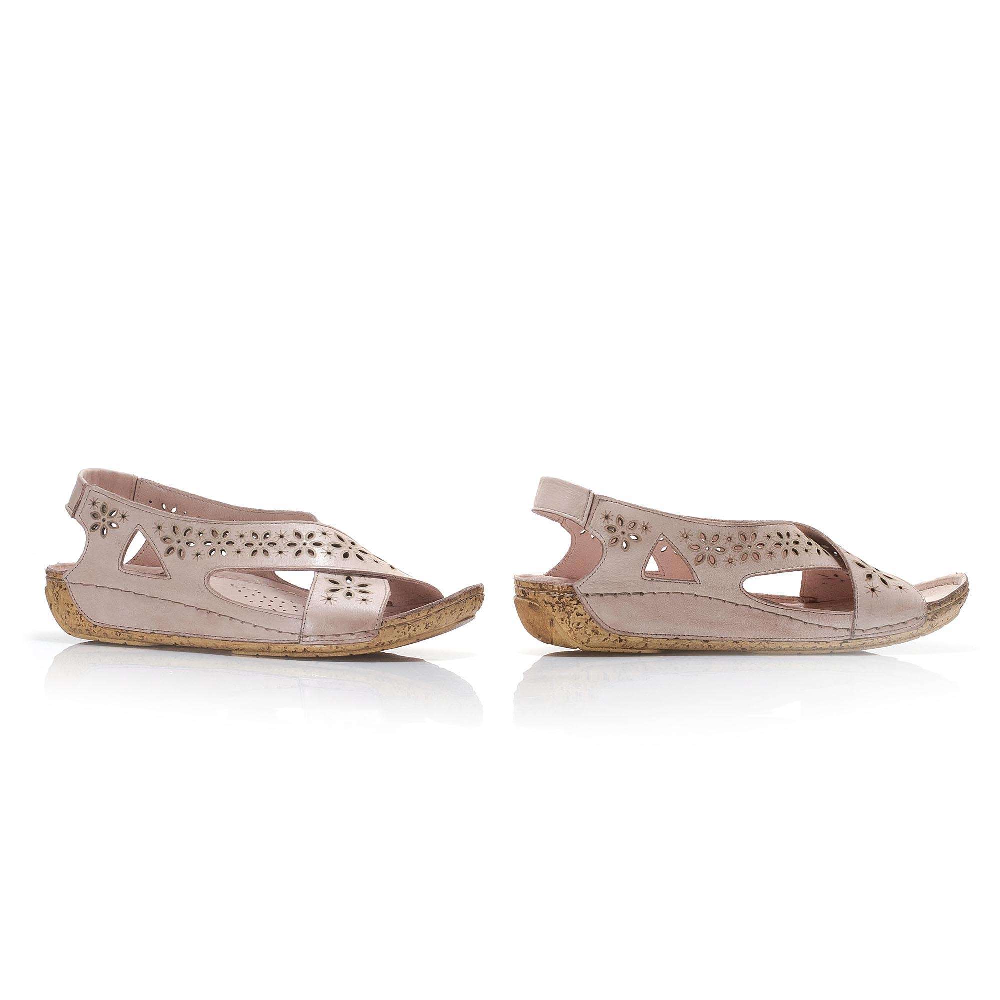 Zajímavé dámské sandály šité z pravé kůže mají hladký povrch a kulatou špičku. Zdobené jsou perforací svršku a křížením předních pásků. V patě je vsazena pružná gumička pro snadné obutí i vyzutí. Tento model unosíte k procházkám letní přírodou, ale i do práce.