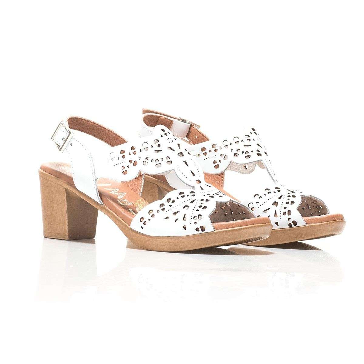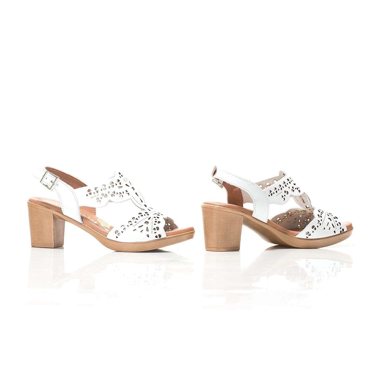 Dámský letní sandál na širokém podpatku je vyroben z pravé kůže. Zdobnými prvky je kontrastní provedení podešve a svršku, který je po celém povrchu perforován. Pro snadné nazouvání a dokonalém přizpůsobení přímo na Vaši nohu slouží pásek kolem paty se zapínáním na přezku. Tato obuv bude skvěle vypadat k dlouhým letním šatům.