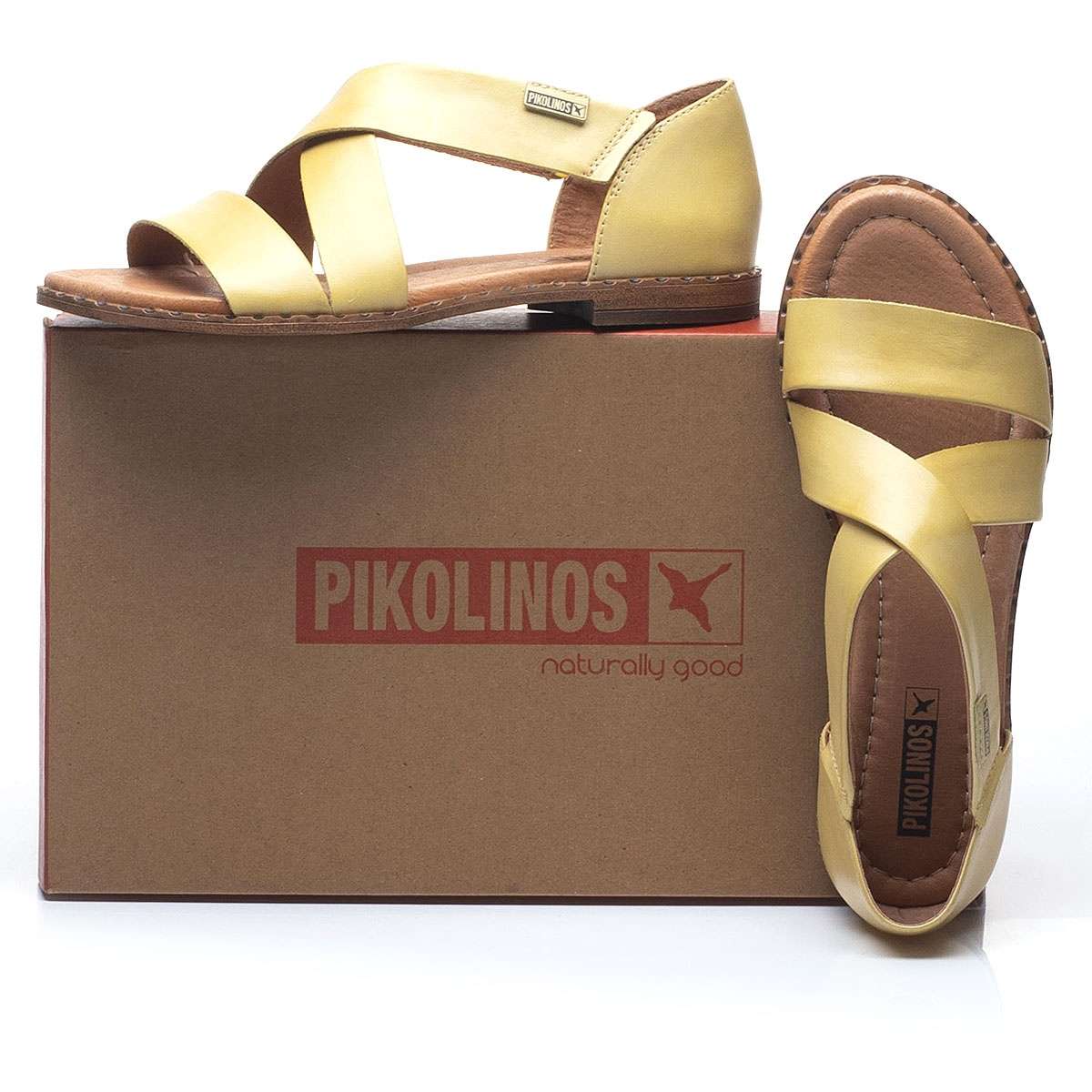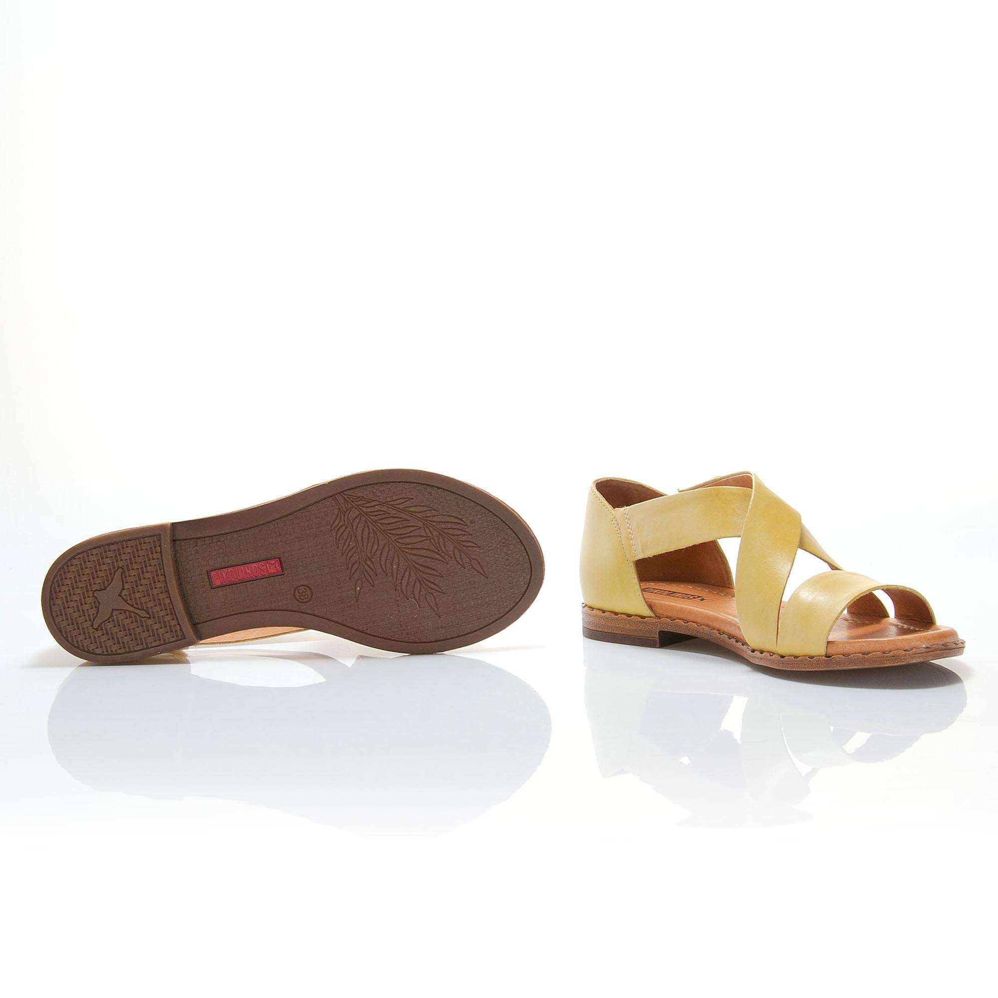 Dámské kožené sandálky značky PIKOLINOS, mají pevnou patu, hladký povrch a kulatou špičku. Zdobené jsou překříženými pásky přes nárt, které jsou zakončeny pružnými gumičkami pro snadné obouvání. V této obuvi se budete cítit pohodlně a zároveň elegantně všechny letní dny.