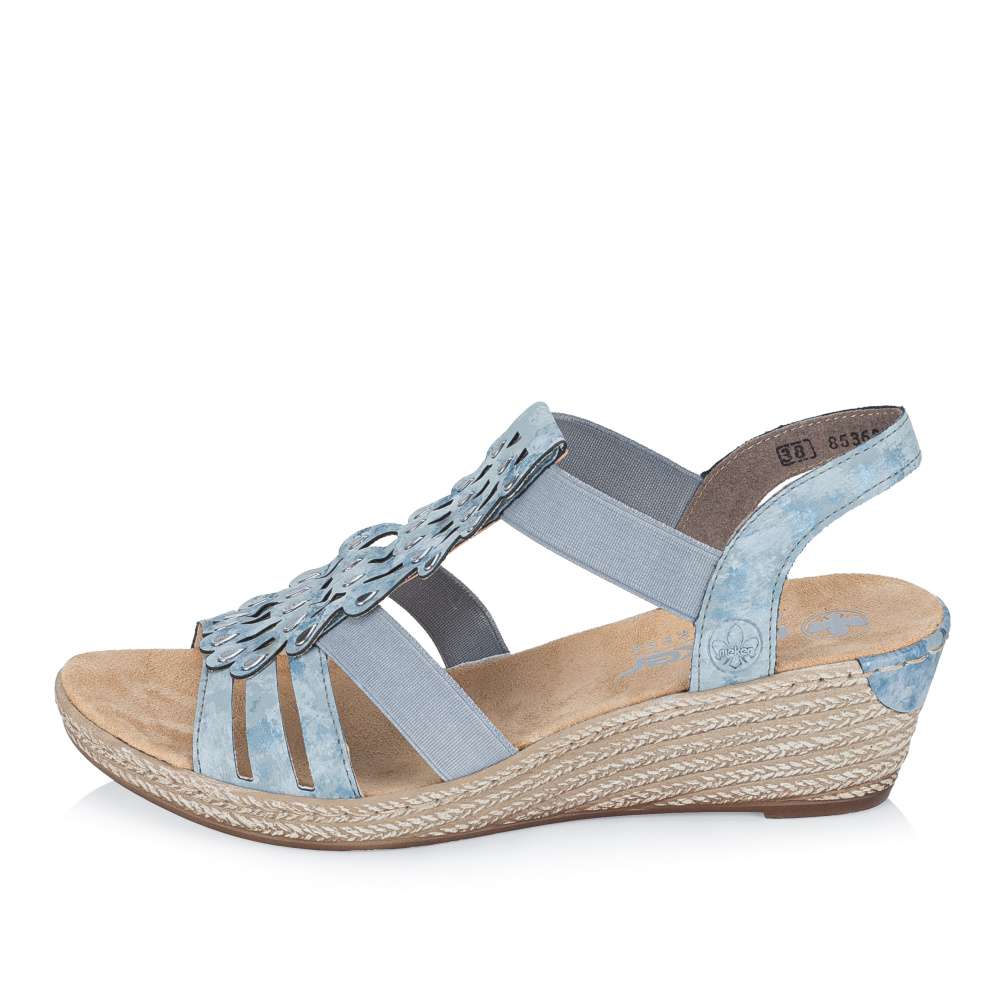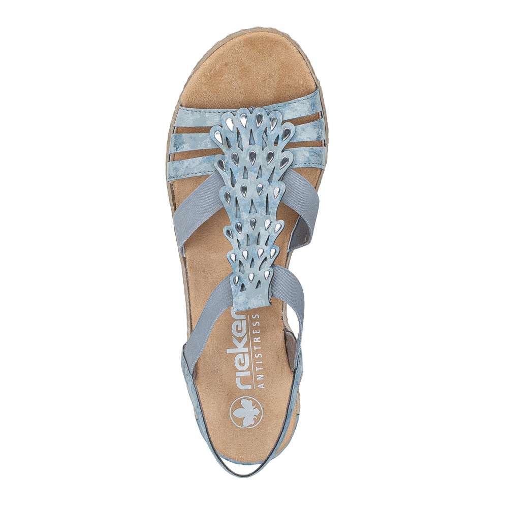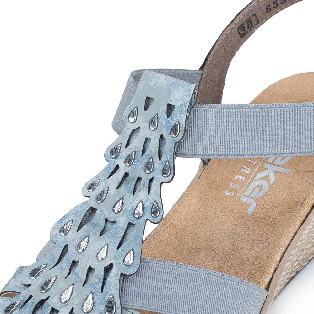 Tento výjimečný model sandálů značky RIEKER je ztělesněním ženského půvabu. Svršek je působivě poskládaný z pevných a pružných pásků doplněných jemnými odlesky, přičemž středový nártový pásek je zdoben jemnými stříbrnými detaily ve tvaru kapek, které podtrhují ženskost celkového vzhledu. Dva pružné boční řemínky zajišťují pohodlné a rychlé obouvání, zároveň se dokonale přizpůsobí tvaru chodidla a poskytují pocit jistoty při každém kroku. Měkká stélka z příjemného textilního materiálu a podešev s technologií tlumení nárazů zaručují maximální komfort každým krokem. Tento model je ideální volbou pro ženy, které hledají spojení noblesního vzhledu, pohodlí a kvality pro každodenní nošení i výjimečné příležitosti.
