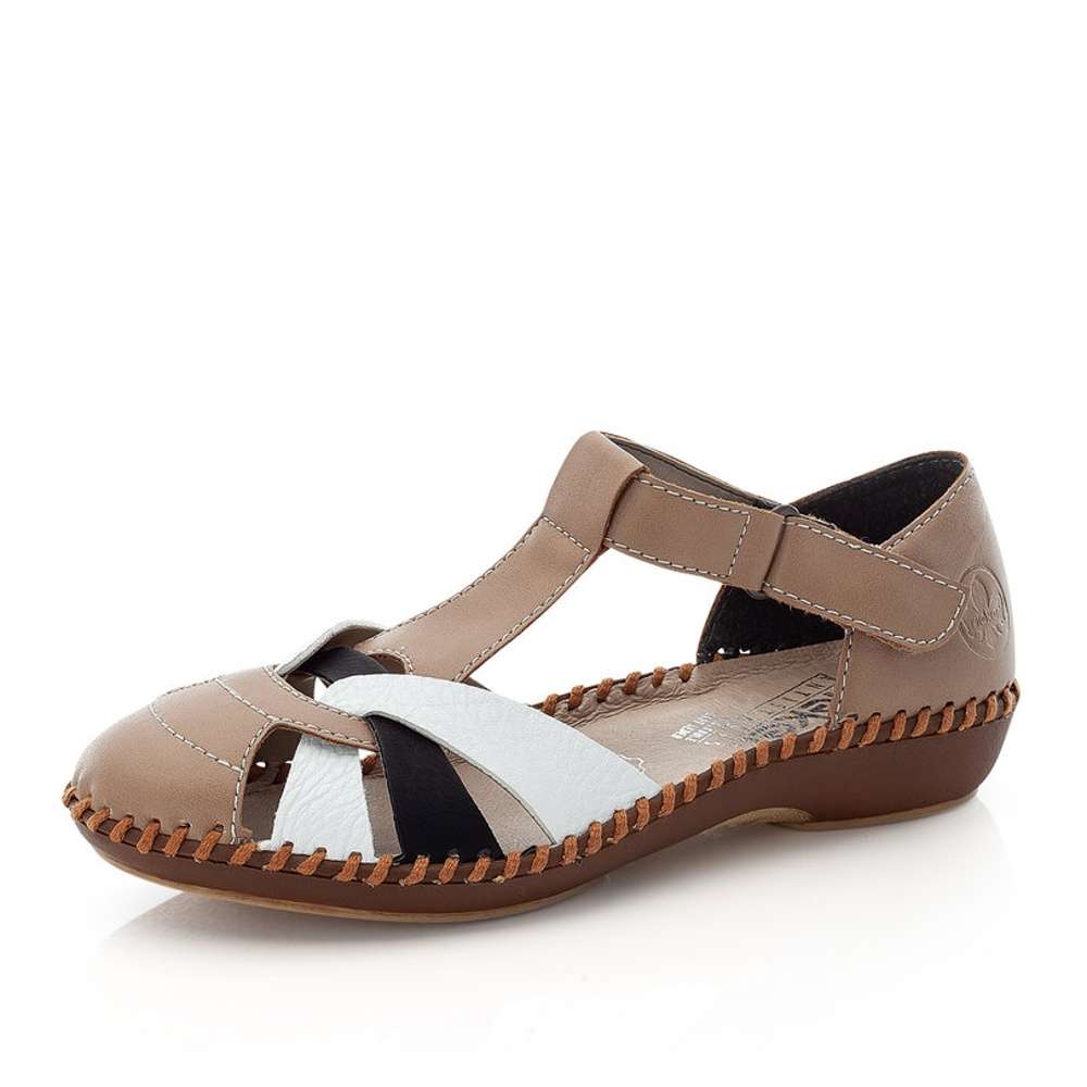 Tento model sandálků značky RIEKER Vás nadchne na první pohled. Přední část obuvi je poskládána ze tří různobarevných pásků, které jsou designově propleteny. Celý svršek je pak prošit kontrastní nití a na plné patní části je vytlačené logo značky. Pro snadné nazouvání a přizpůsobení obuvi dle Vašich požadavků slouží pásek se zapínáním na suchý zip. Kožená stélka je pro Vaše pohodlí vyrobena z paměťové pěny a kontrastní podešev je se svrškem spojena výrazným šitím. Tyto sandálky budou skvěle vypadat s letními outfity na procházkách městem.
