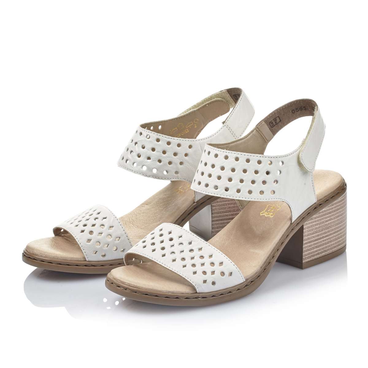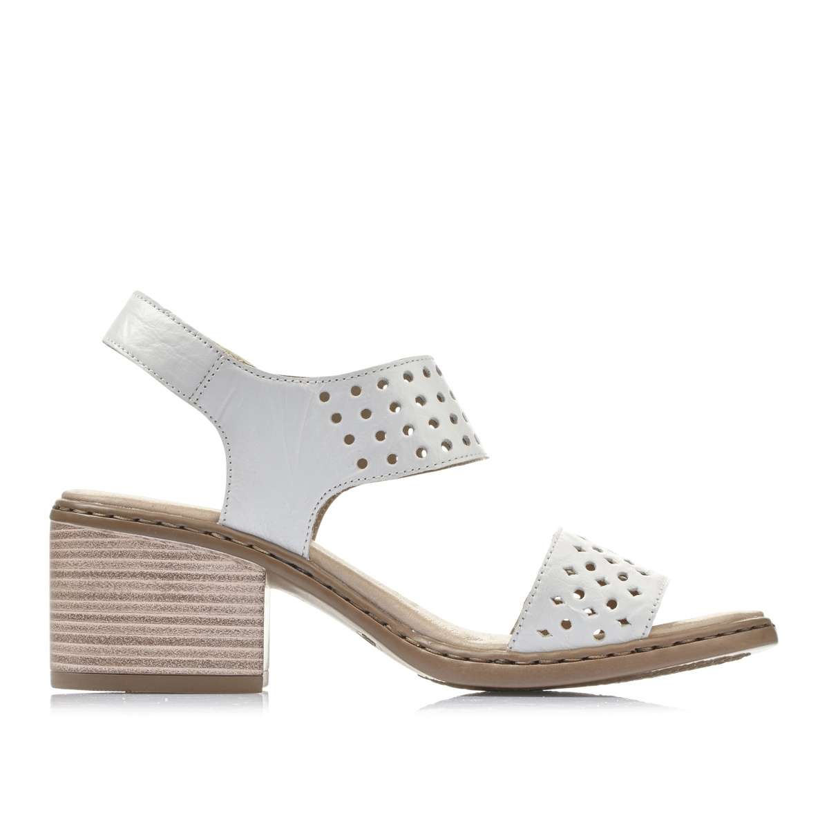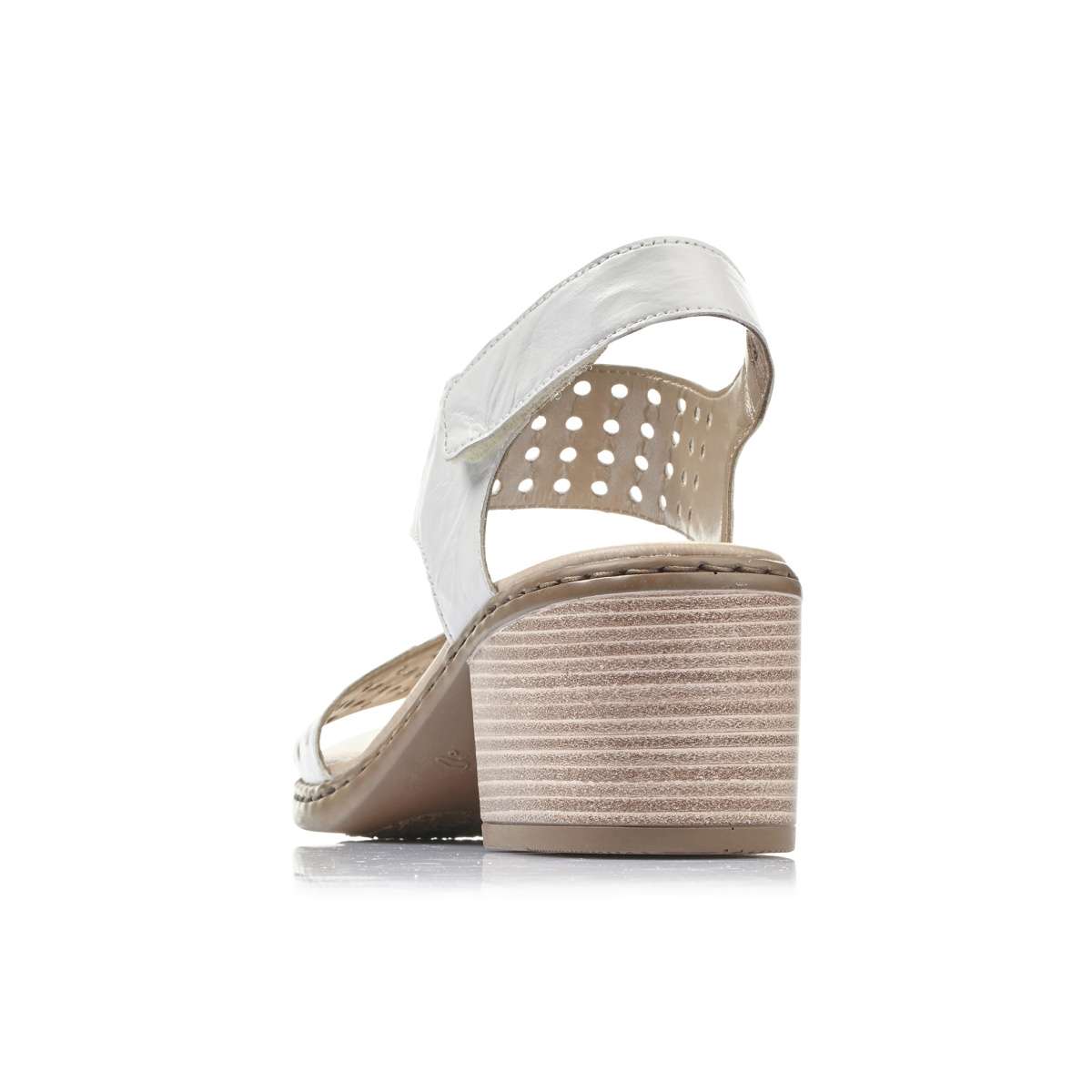 Dámské sandály šité z pravé kůže mají světlou barvu a kontrastní podešev. Design udává pásek přes nárt s perforací tvaru koleček, pásek v přední části s perforací tvaru čtverečků. Pásek kolem paty má na vnější straně zapínání na suchý zip pro úpravu boty přímo k Vaší noze. Pevná a stabilní podešev s podpatkem se postarají o jistý krok. Tento skvělý model bude vypadat nádherně s každou sukní i kalhotami při procházce či pochůzkách městem.