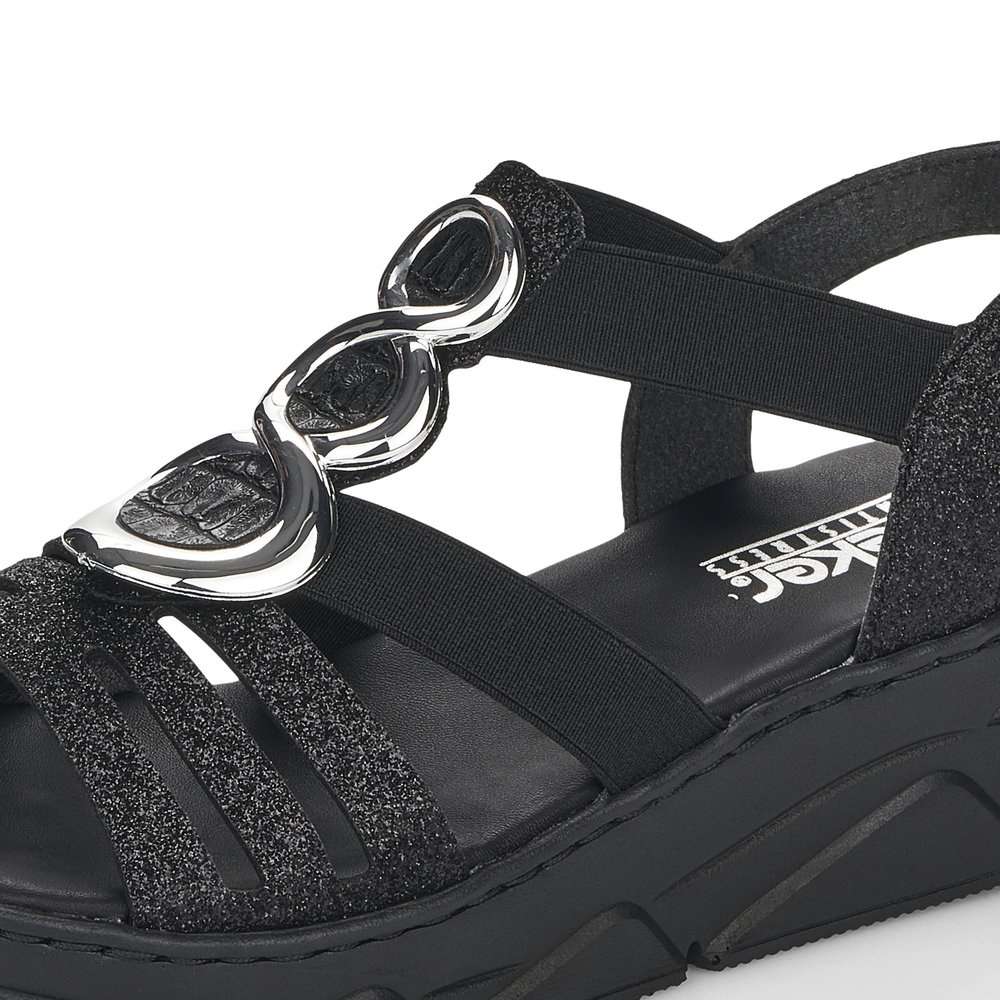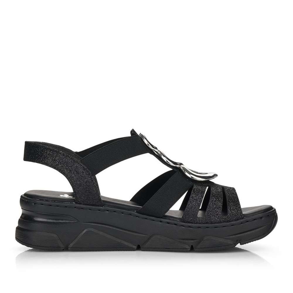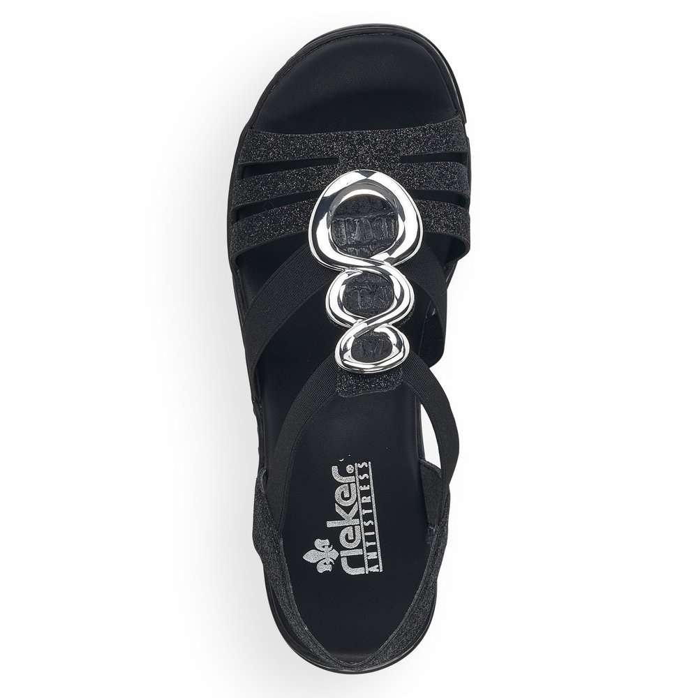 Zda-li hledáte obuv vhodnou na letní pochůzky městem, je tento model značky RIEKER tou správnou volbou. Svršek je designově poskládám z třpytivých a pružných pásků a je doplněn výraznou stříbrnou aplikací na nártu. Pohodlí na každém kroku zajistí měkká stélka a vyšší podešev s technologií Antistress. Sandálky budou vypadat skvěle například s dlouhými letními šaty.