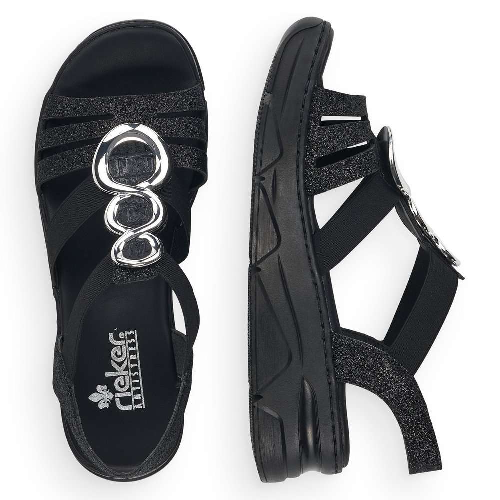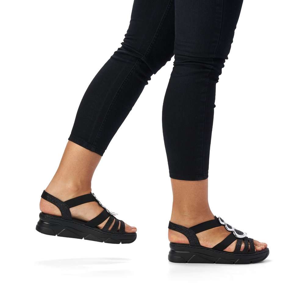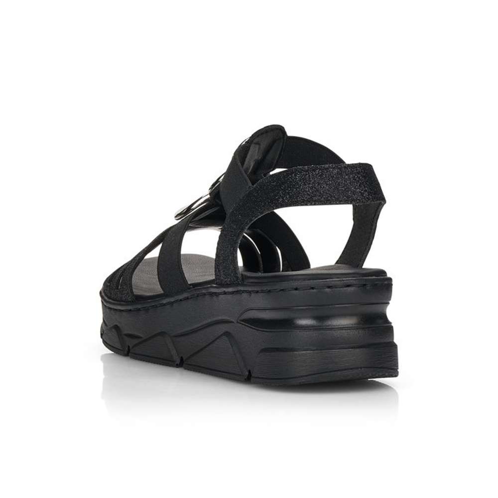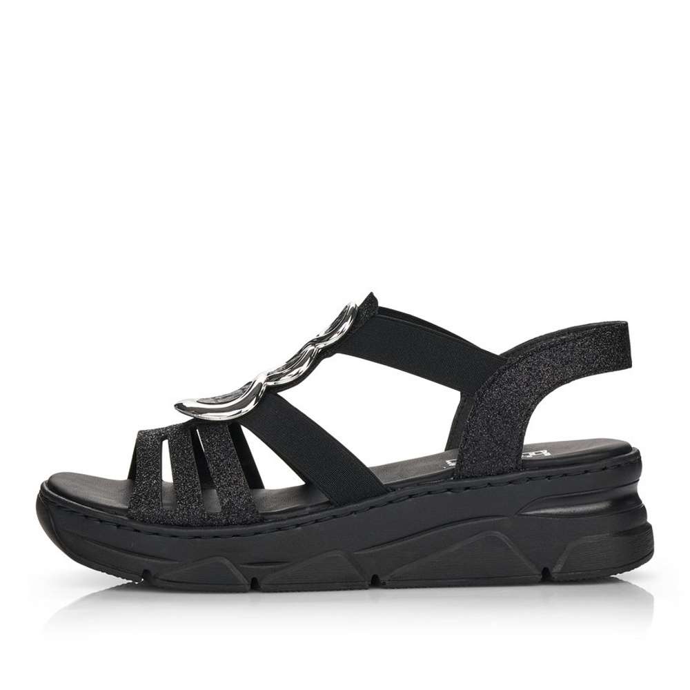 Zda-li hledáte obuv vhodnou na letní pochůzky městem, je tento model značky RIEKER tou správnou volbou. Svršek je designově poskládám z třpytivých a pružných pásků a je doplněn výraznou stříbrnou aplikací na nártu. Pohodlí na každém kroku zajistí měkká stélka a vyšší podešev s technologií Antistress. Sandálky budou vypadat skvěle například s dlouhými letními šaty.