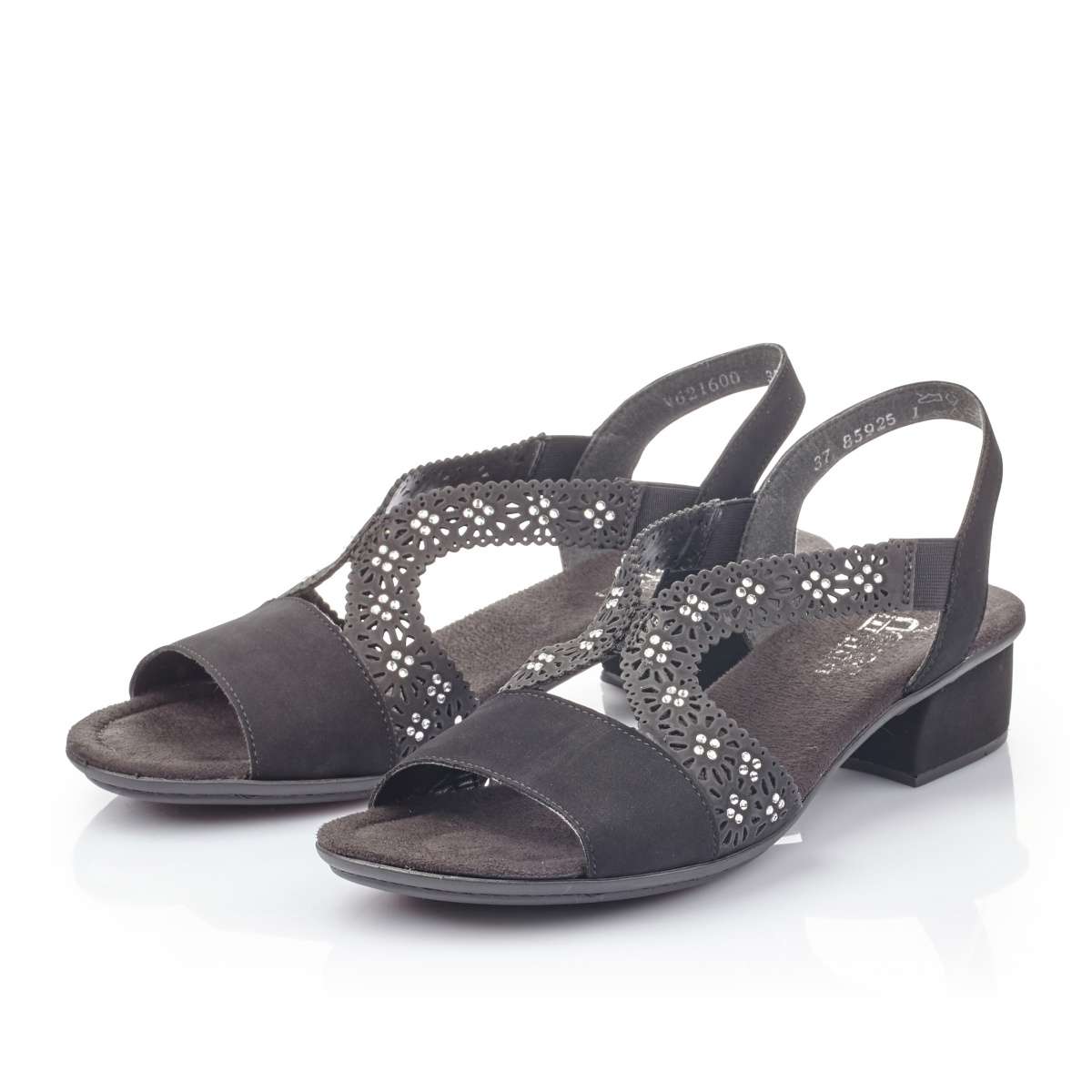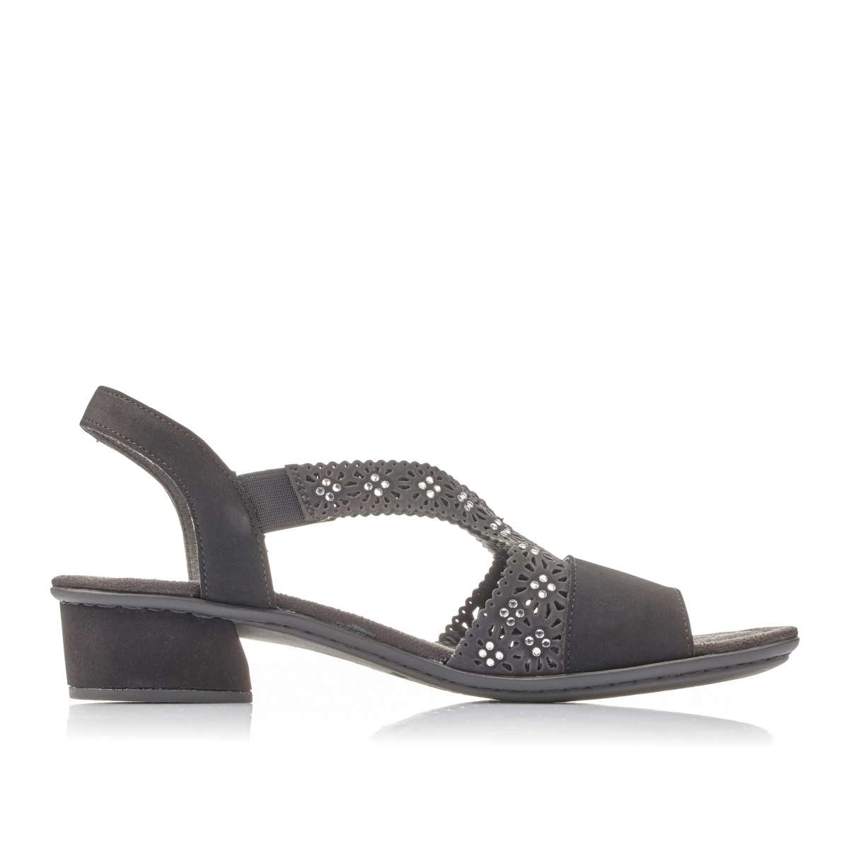 Dámské sandály černé barvy mají pásky v oblasti nártu posázené kamínky a jsou zdobené perforací. Tyto pásky jsou uprostřed spojeny pružnou gumičkou, která je použita i ve spojení s páskem kolem paty. Nízký podpatek a pevná podešev jsou zde pro Vaše pohodlí na každém kroku. Tento model unosíte jak do práce, tak třeba na procházku či koupaliště s dětmi.