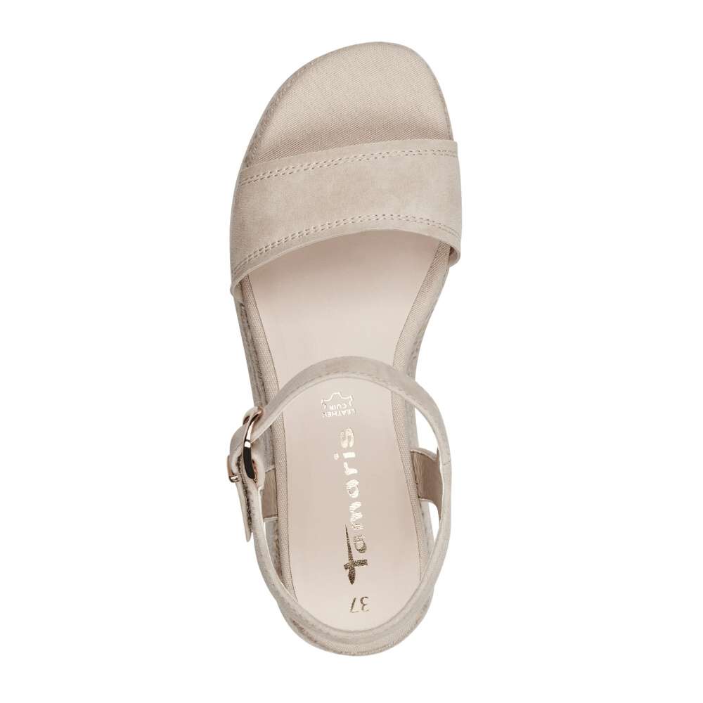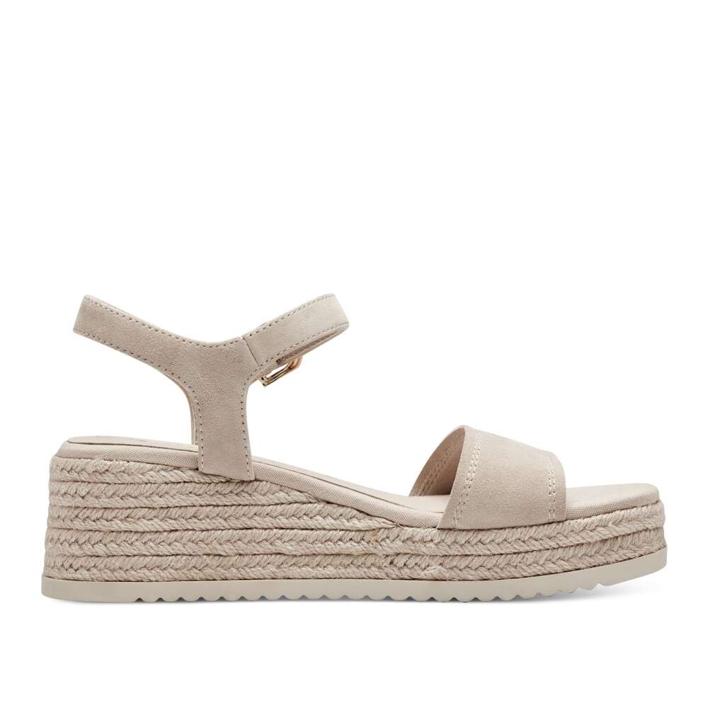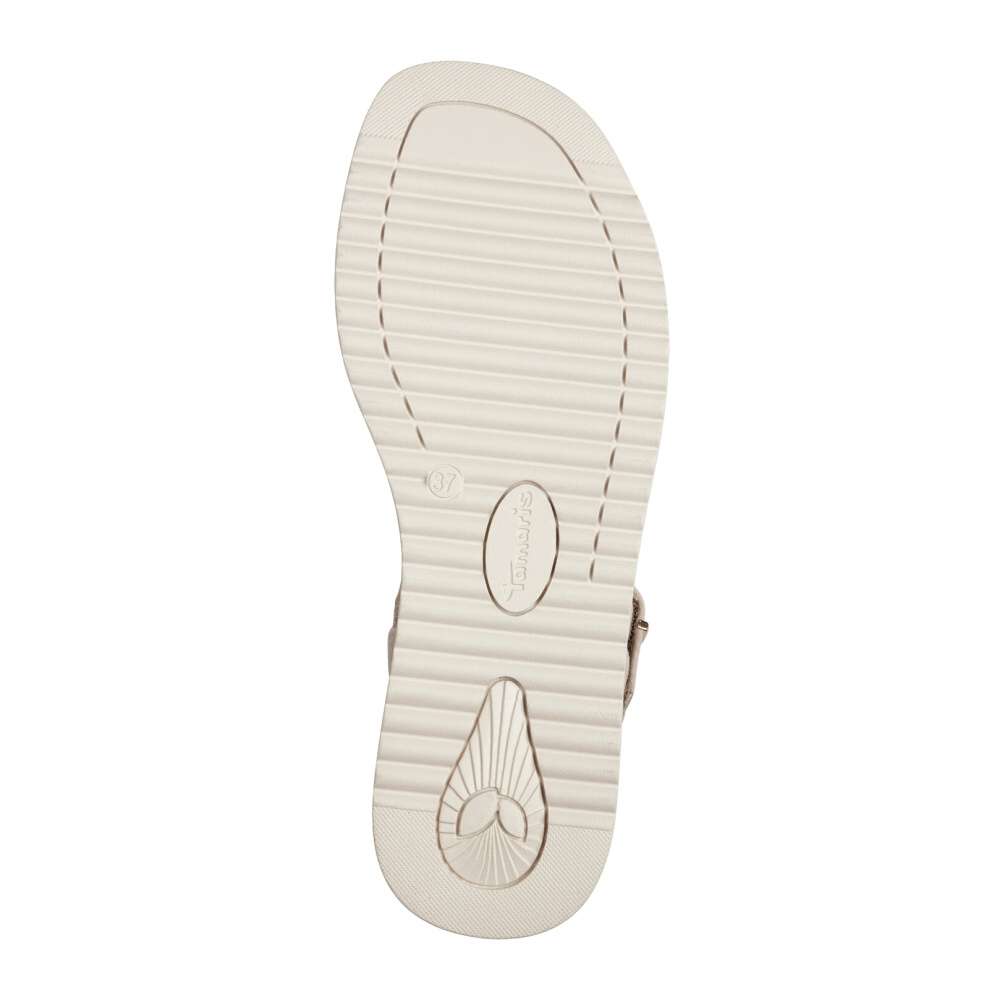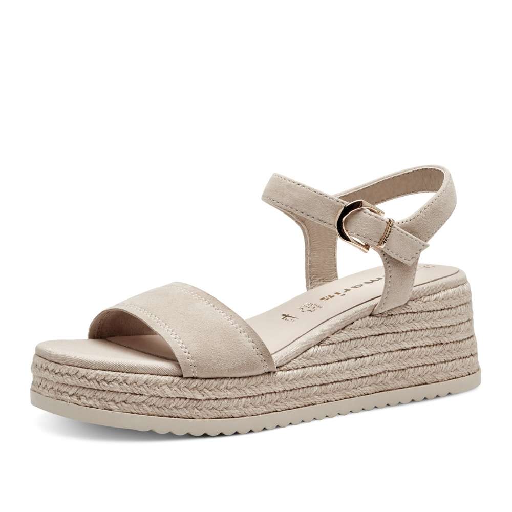 Tyto letní sandálky značky Tamaris díky svému nadčasovému svršku béžové barvy budou perfektním doplňkem do prosluněných dní. Tvořeny jsou širokým páskem přes prsty, a tenkými pásky kolem kotníku, které udrží nohu v botě pevně na svém místě, takže Vám nebude klouzat. Uzavíratelné jsou na malou přezku se suchým zipem, díky které se lépe přizpůsobí Vaší noze. Vyšší módní klínek je zdoben splétaným sisalovým vláknem, jenž v sandálech evokuje jejich prázdninový vzhled. Vhodné jsou na nošení například k šatům. Vyrazit v nich můžete na rande, procházku, anebo třeba do města na zmrzlinu.