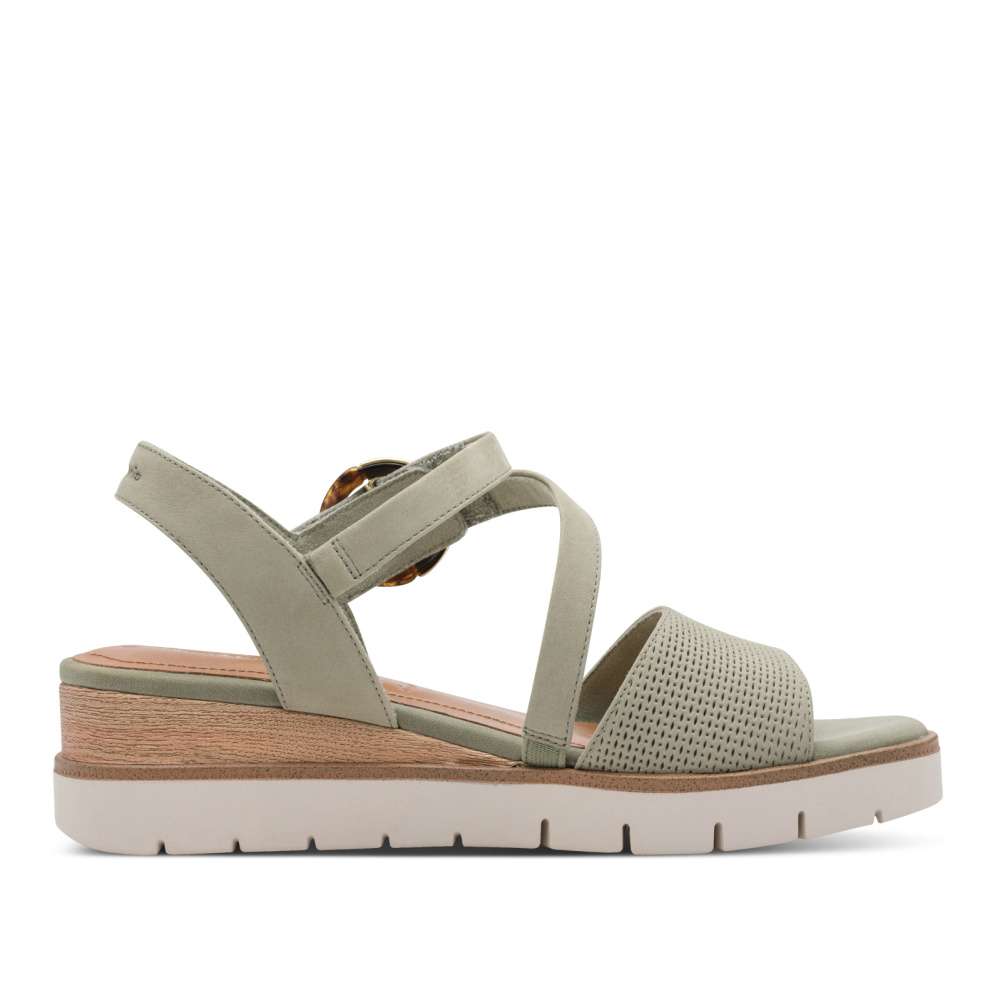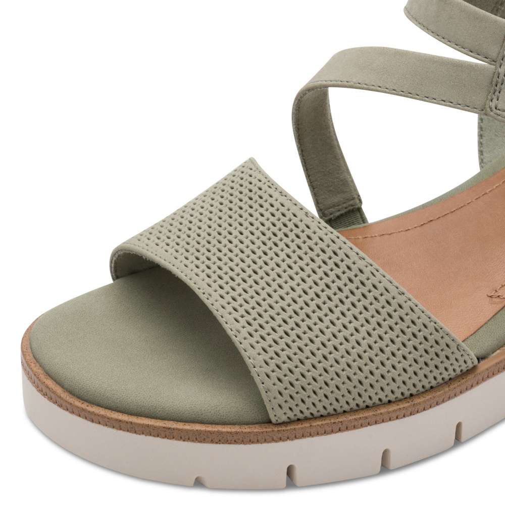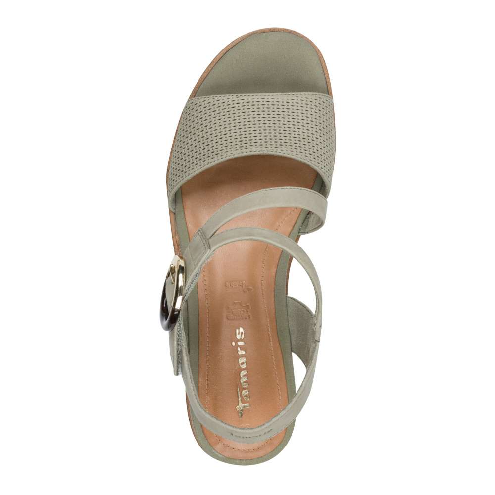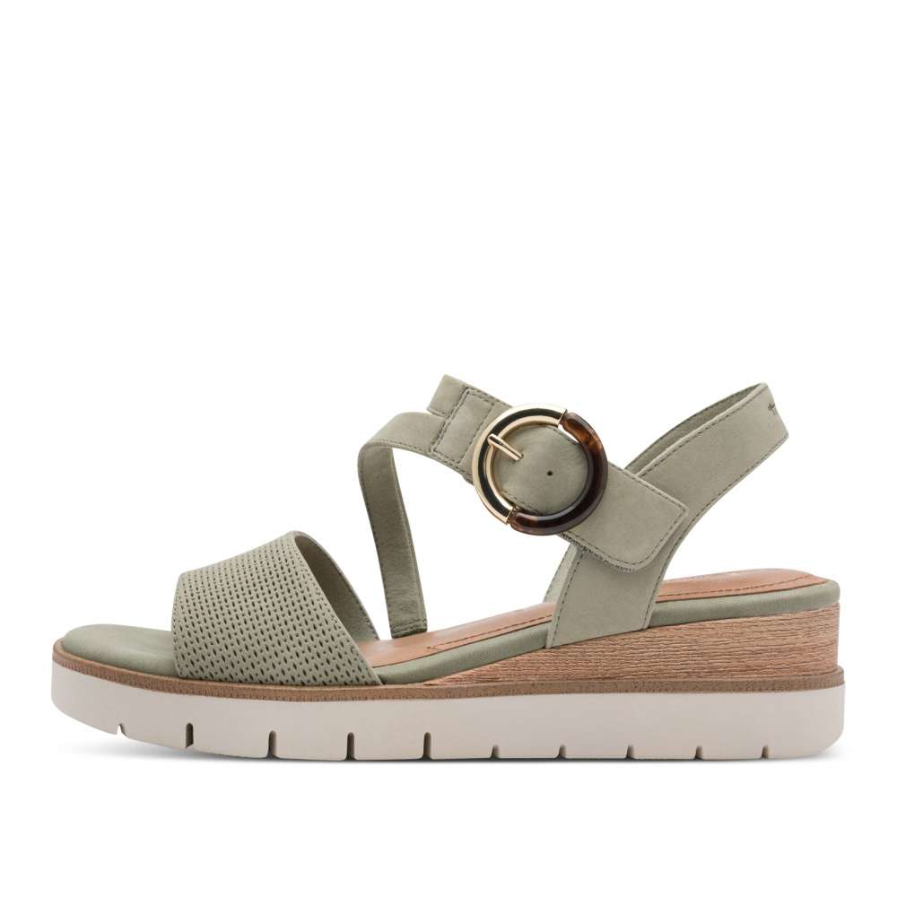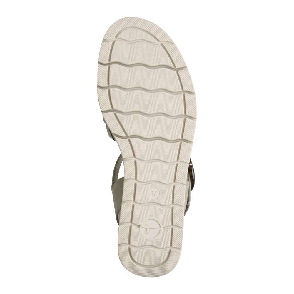 Elegantní dámské sandály Tamaris s koženým svrškem i koženou stélkou představují ideální spojení kvalitního zpracování a moderního designu. Přední pás je jemně zdobený, což dodává obuvi elegantní styl a podtrhuje její ženský charakter. Kolem kotníku se nachází dvojitý pásek s přezkou – jedna část obepíná kotník, zatímco druhá se táhne přes nárt až do přední části boty, čímž zajišťuje pevné a pohodlné usazení chodidla. Výrazná ozdobná přezka dodává sandálům stylový vzhled a zároveň usnadňuje regulaci šířky. Vyšší podešev v přírodním stylu poskytuje příjemný komfort při chůzi a zároveň působí moderně a lehce. Tento model je skvělou volbou pro ženy, které hledají pohodlné, kvalitní a zároveň výrazně designové letní sandály.