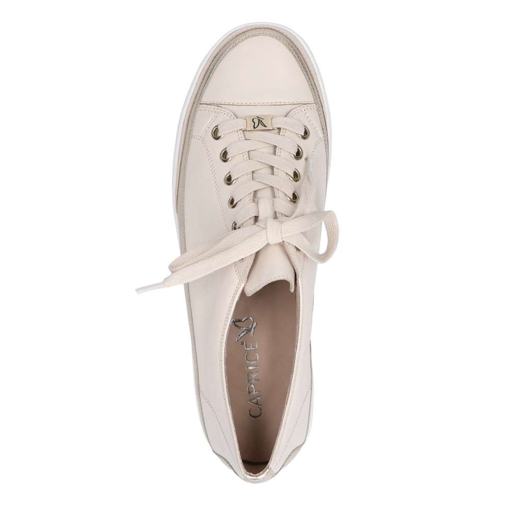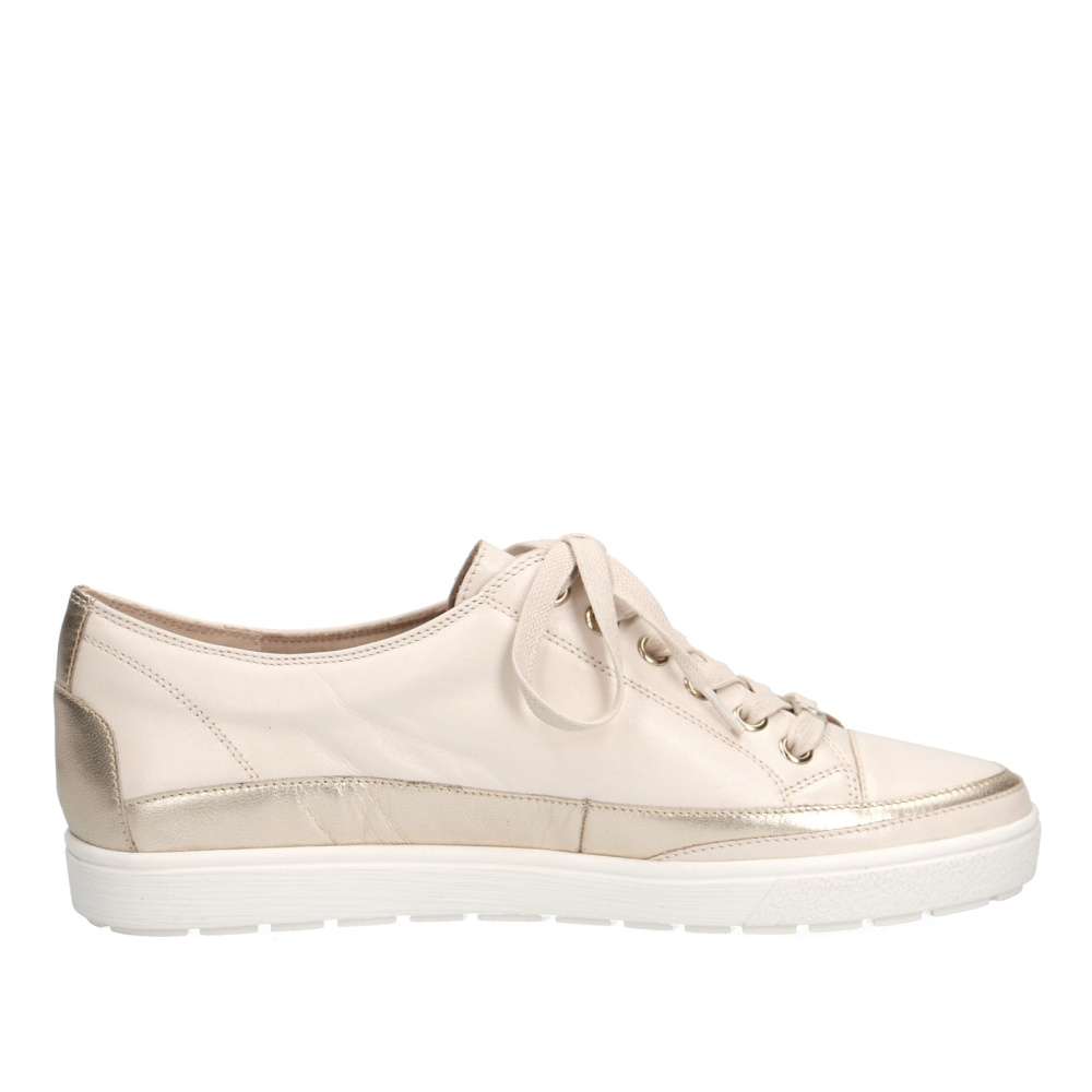 Tyto dámské kožené tenisky značky CAPRICE skvěle doplní Vaše každodenní outfity. Svršek je ve spodní části ozdoben zlatým pruhem kolem celého obvodu tenisky. Obuv si snadno nazujete a přizpůsobíte dle svých požadavků díky šněrování. Kožená stélka Vám zaručí při každém kroku měkký došlap a příjemnou chůzi. Tenisky snadno sladíte jak s kalhotami, tak třeba i se sukněmi.