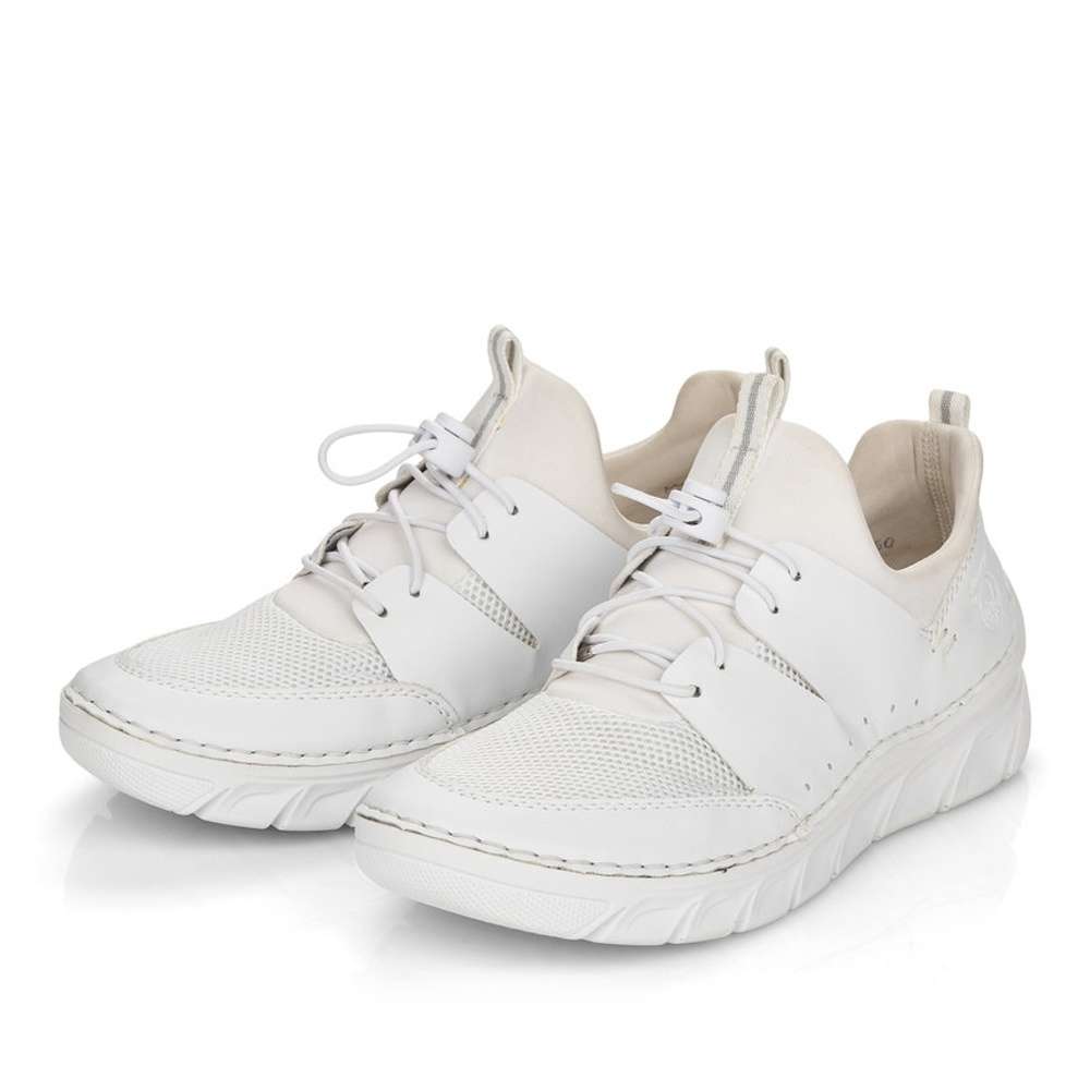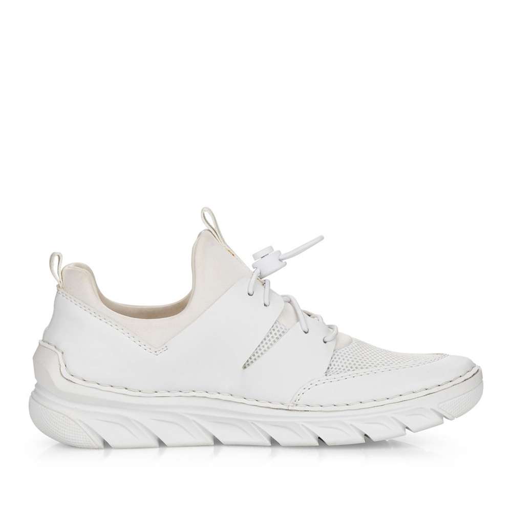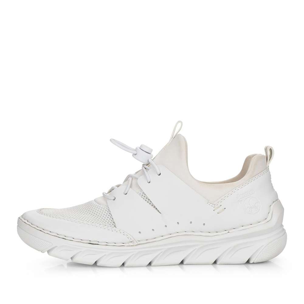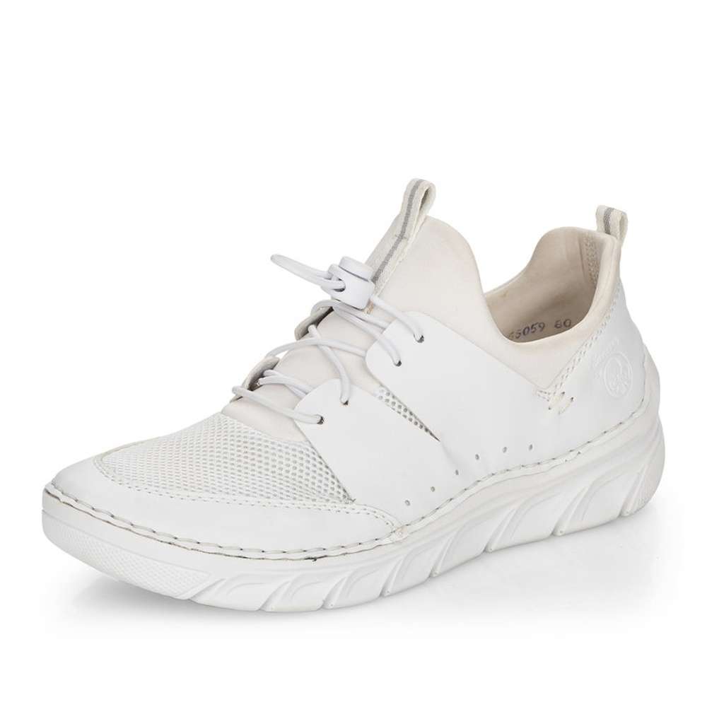 Originální dámské tenisky značky RIEKER, které nesmí chybět ve Vašem nákupním košíku. Originální bílý svršek je doplněn logem značky a prodyšnou podšívkou, aby chodidla mohla dýchat. Kvalitní kožená stélka zajistí pohodlí po celý den. Stylová podešev je lehká, flexibilní a tlumí nárazy při došlapu, a tak se nemusíte bát, že v botách nevydržíte celý den.