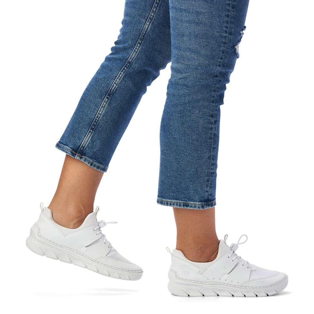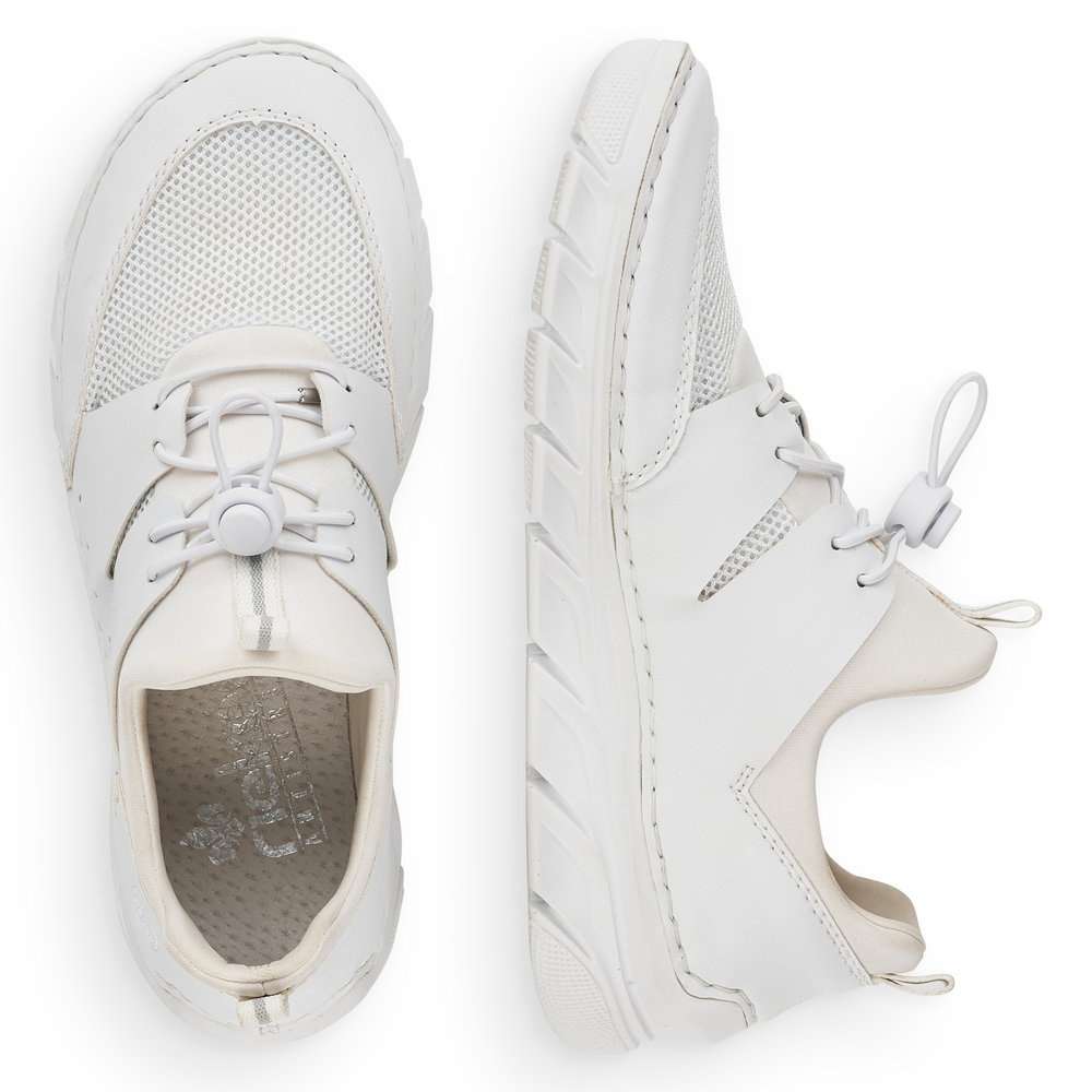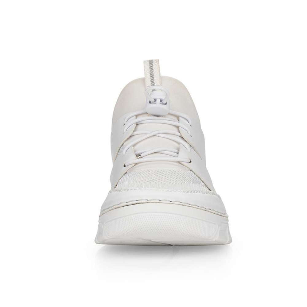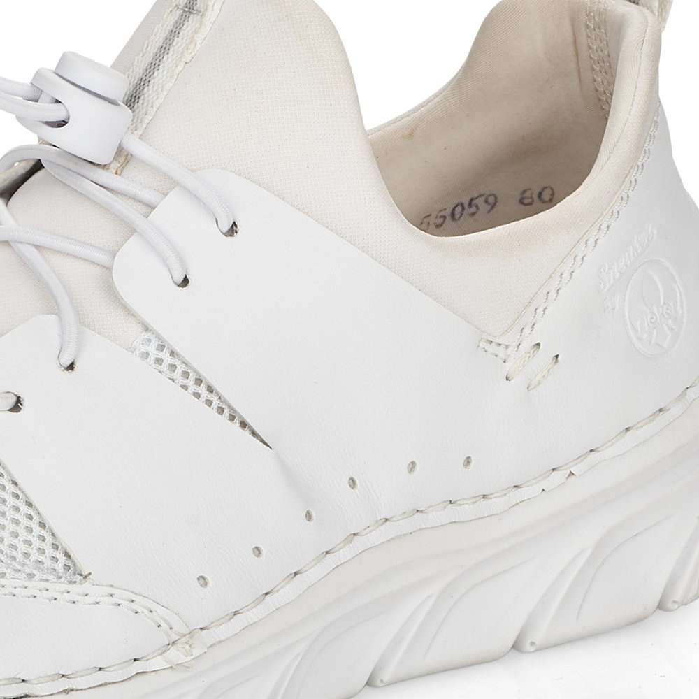Originální dámské tenisky značky RIEKER, které nesmí chybět ve Vašem nákupním košíku. Originální bílý svršek je doplněn logem značky a prodyšnou podšívkou, aby chodidla mohla dýchat. Kvalitní kožená stélka zajistí pohodlí po celý den. Stylová podešev je lehká, flexibilní a tlumí nárazy při došlapu, a tak se nemusíte bát, že v botách nevydržíte celý den.