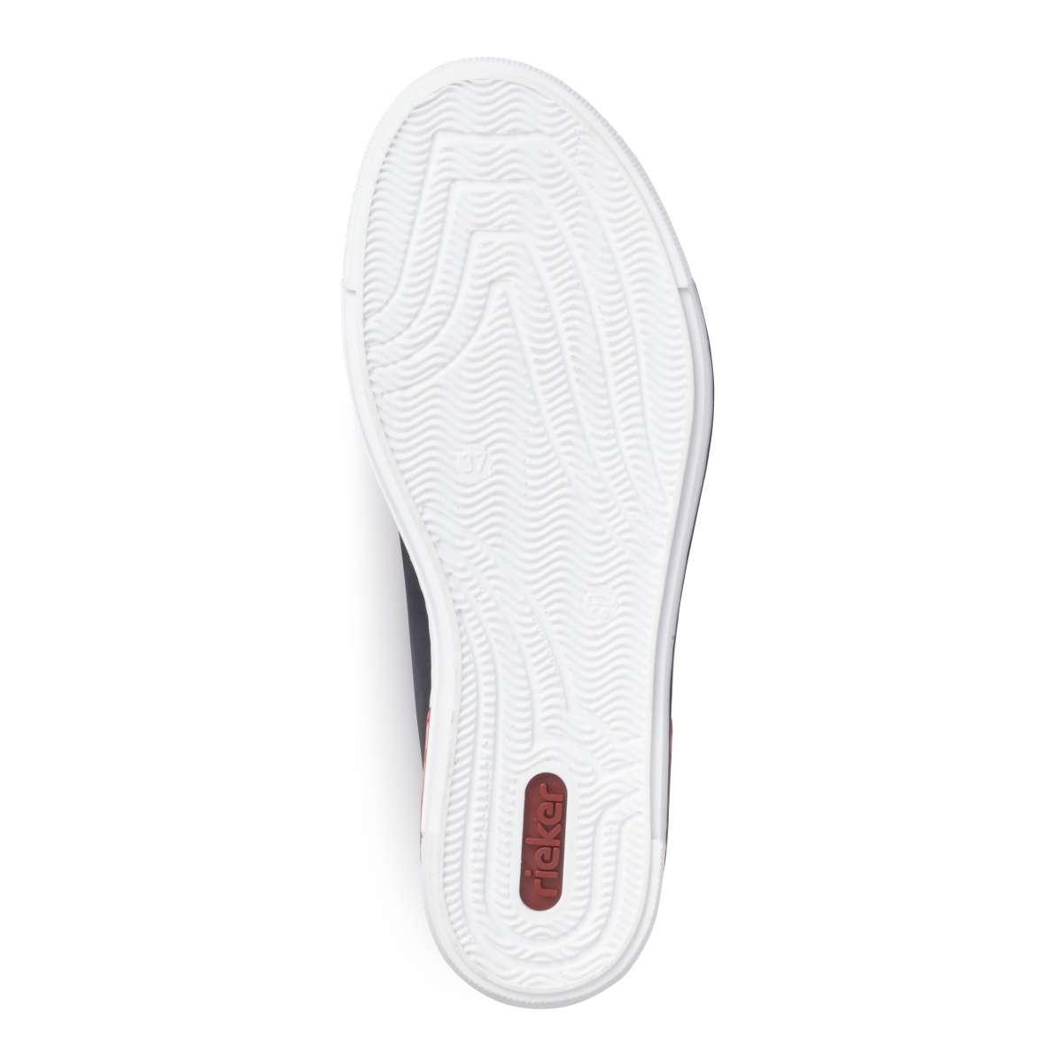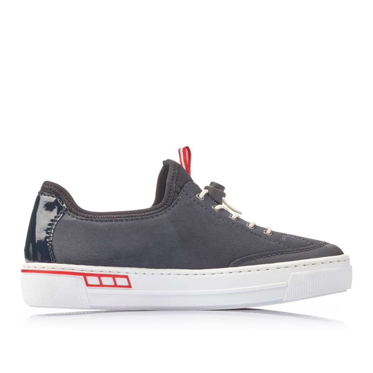 Tmavě modré tenisky Rieker s červenými detaily a lakovanou kotníkovou částí jsou zcela výjimečné díky zdobnému zipu. Obuv se utahuje pružnou gumičkou s aplikátorem. Měkká kožená stélka zajistí celodenní komfort a podešev o výšce cca 3,5 cm je vyrobena z velmi kvalitního syntetického materiálu. Pohodlnost a styl tyto slova přesně vystihují tento vkusný model.