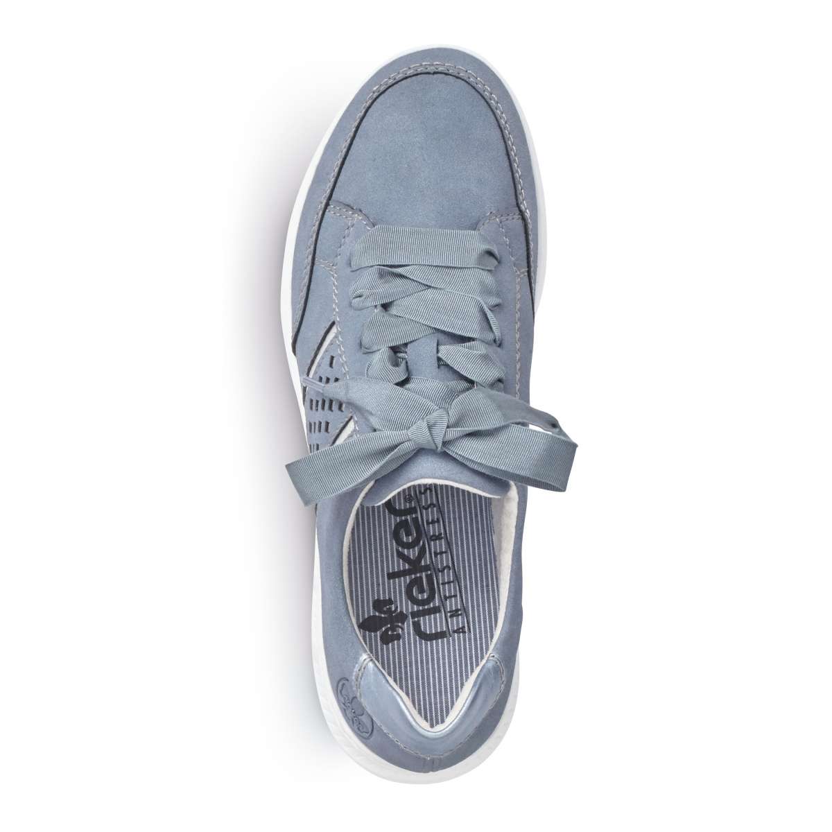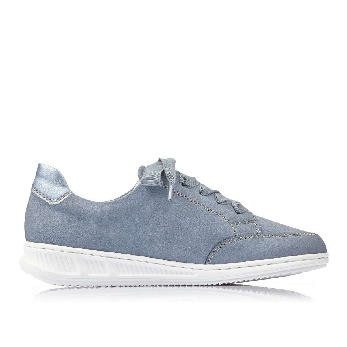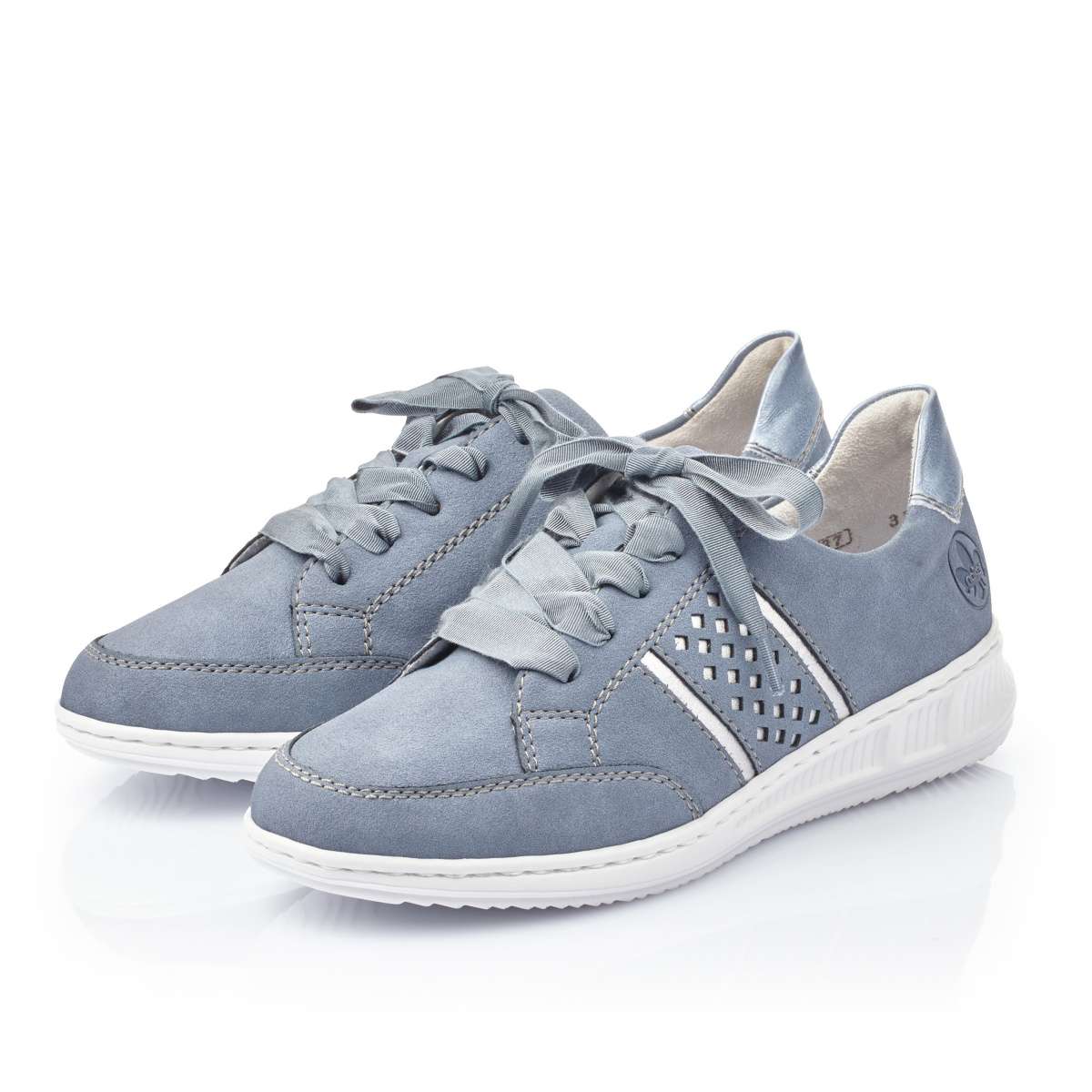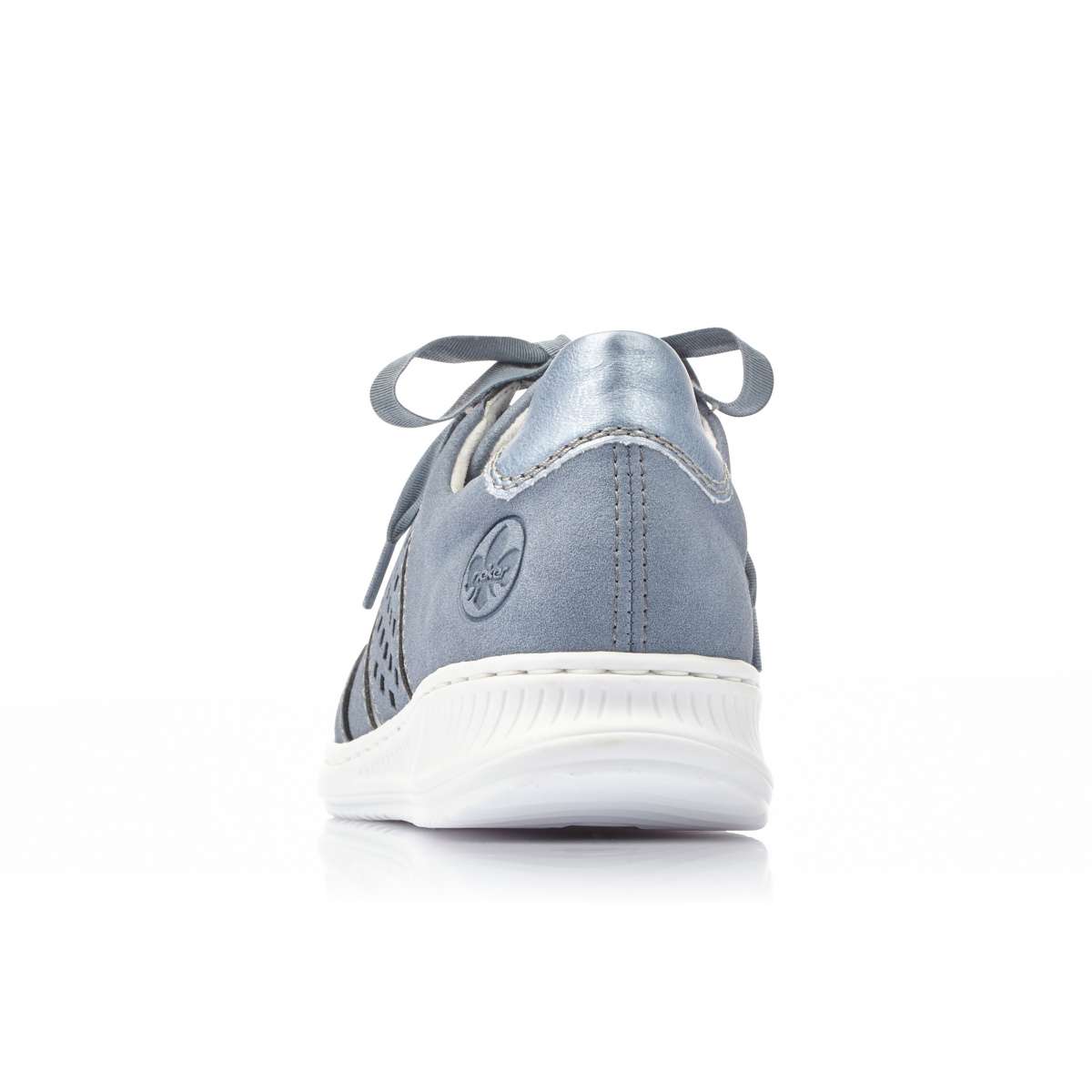 Dámské tenisky mají modrý svršek doplněný bílou podešví s jemným vzorem. Na vnější straně je povrchová perforace, která je podšitá lesklým materiálem stříbrné barvy. Místo tkaniček je použita stuha pro snadné obutí a přizpůsobení boty přímo k Vaší noze. Tento lehounký a velmi pohodlný model s vyjímatelnou stélkou unosíte od jara až do podzimu.