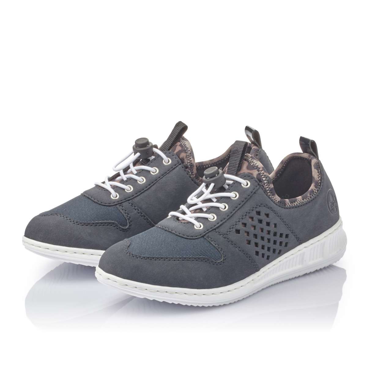 Tyto sportovní tenisky značky Rieker využijete ke každému sportovnímu outfitu, ať už vyrazíte do práce či na procházku do přírody. Tmavě modrý svršek je zdoben na vnější straně perforací s podkladem v leopardím vzoru. Ten je použit i na pružné látce kolem kotníku, která je zde pro snadnější obutí. Místo klasické šňůrky je použita pružný gumička, kterou si nastavíte dle potřeby. Díky technologii Antistress se v těchto botách budete cítit pohodlně po celý den.