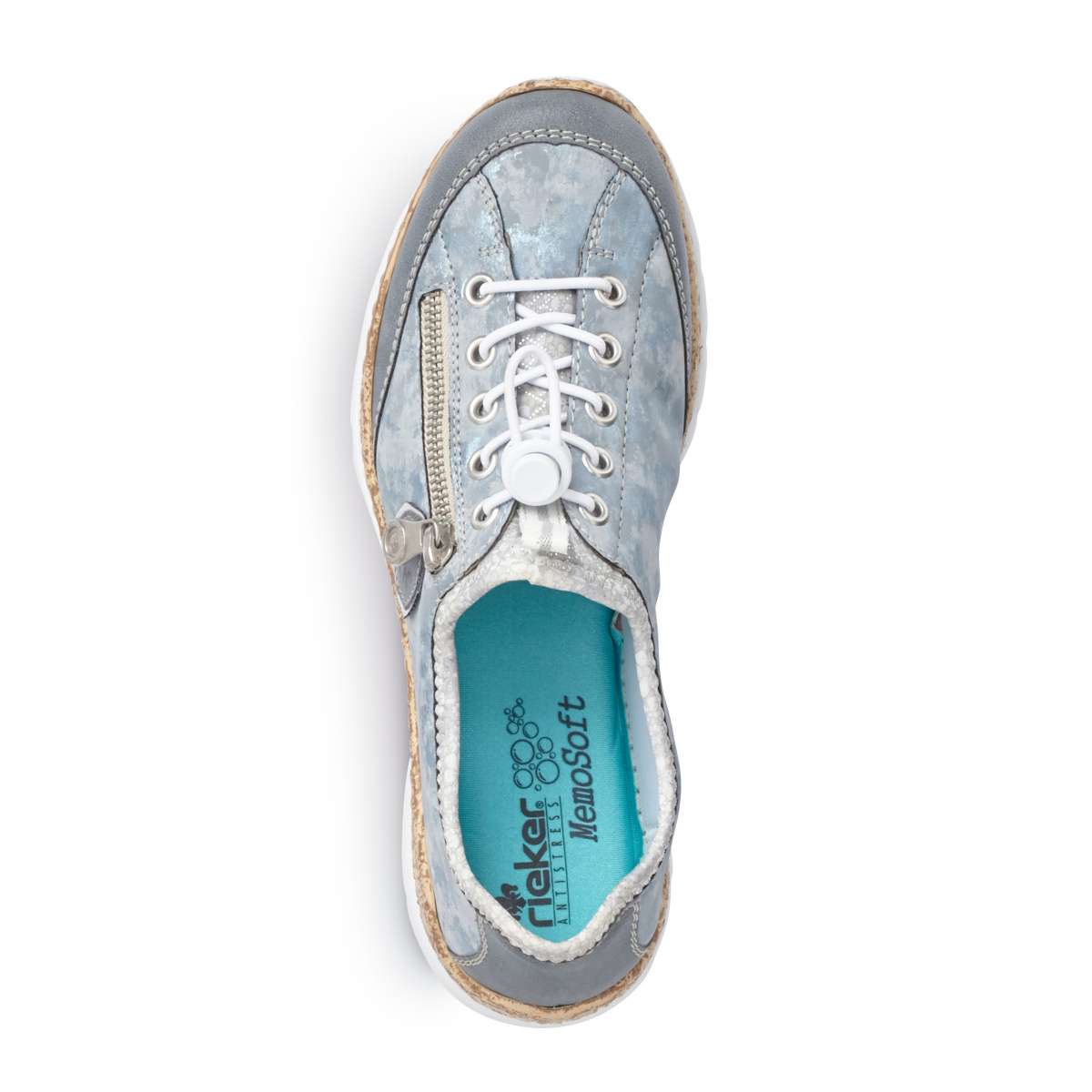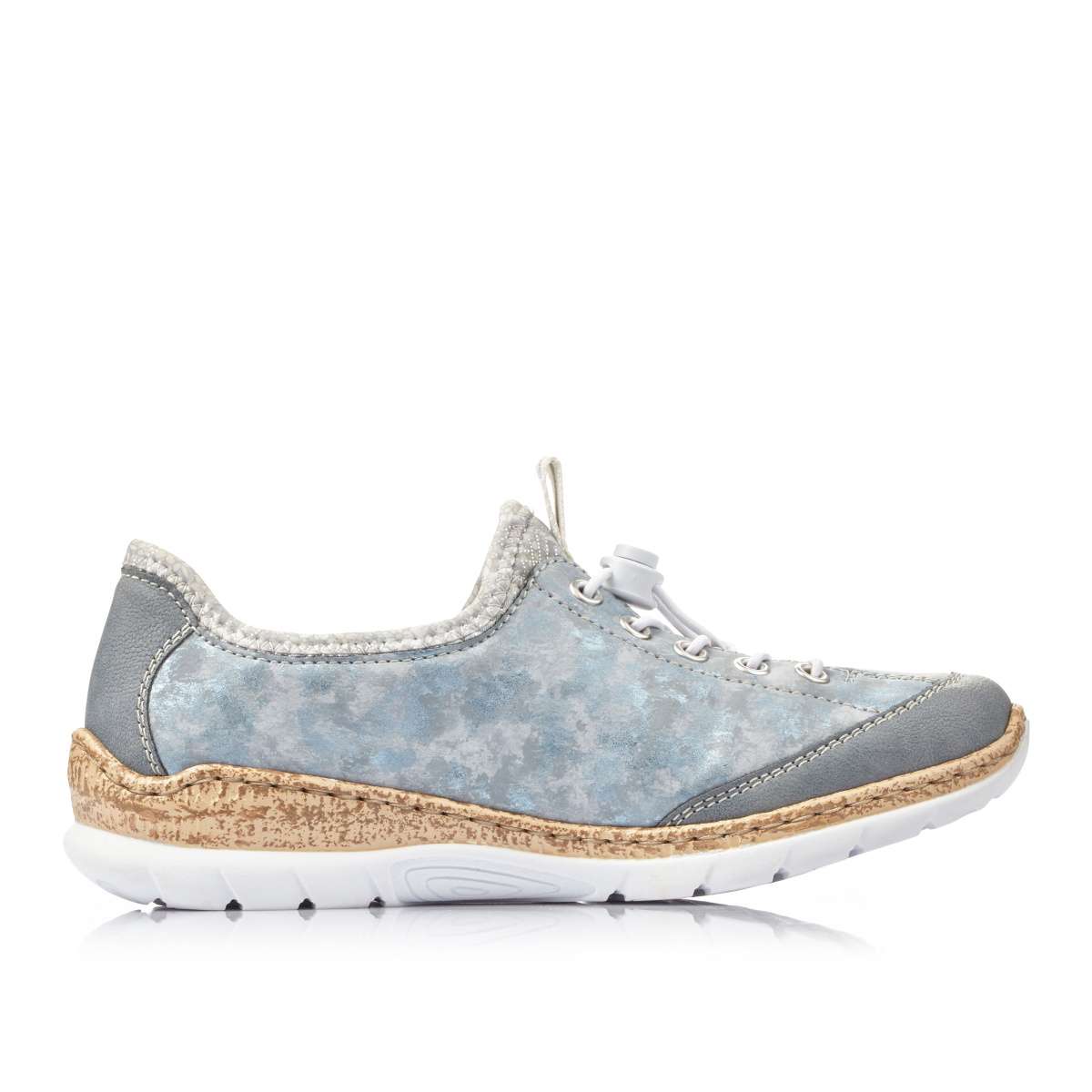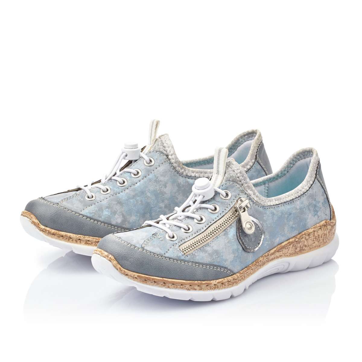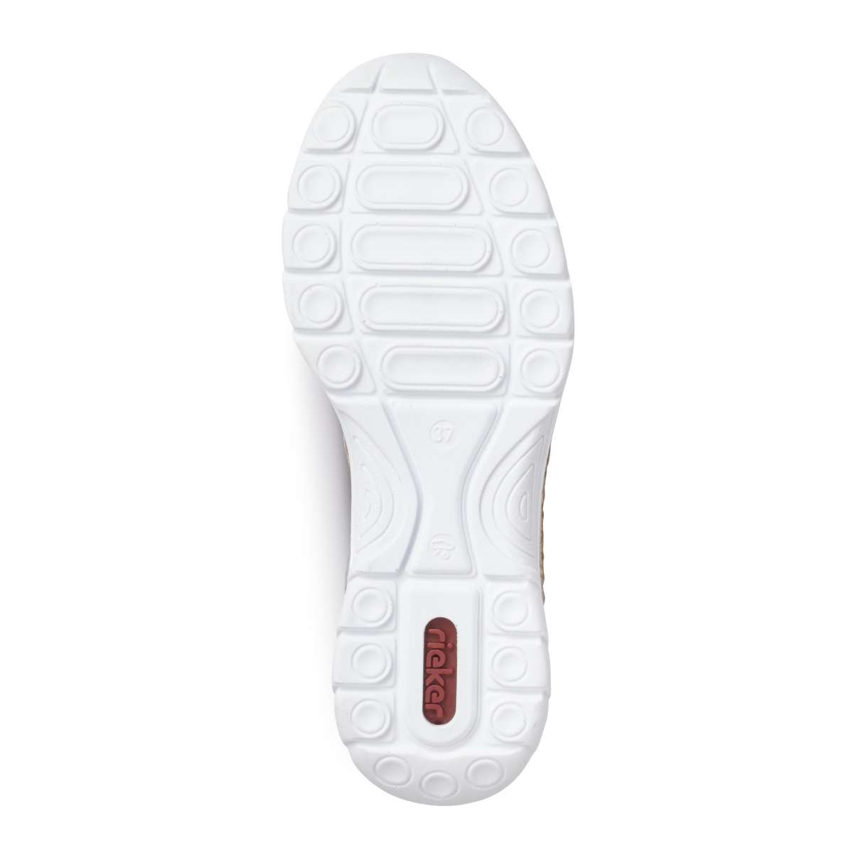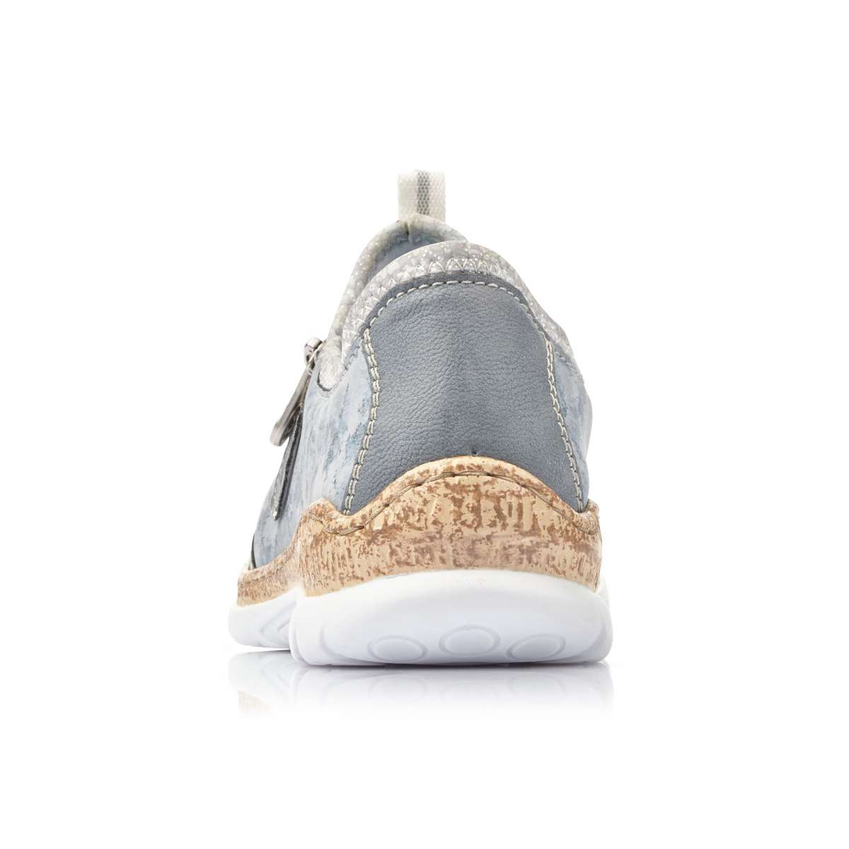 Šikovné a elegantní polobotky sportovního stylu mají zdobný zip na vnější straně i logo značky Rieker a kontrastní dvoubarevnou podešev. Místo tkaniček je zde praktická bílá gumička a poutko pro snadné obutí. Tento vysoce komfortní vzor je vhodný pro každodenní nošení ke každému outfitu.