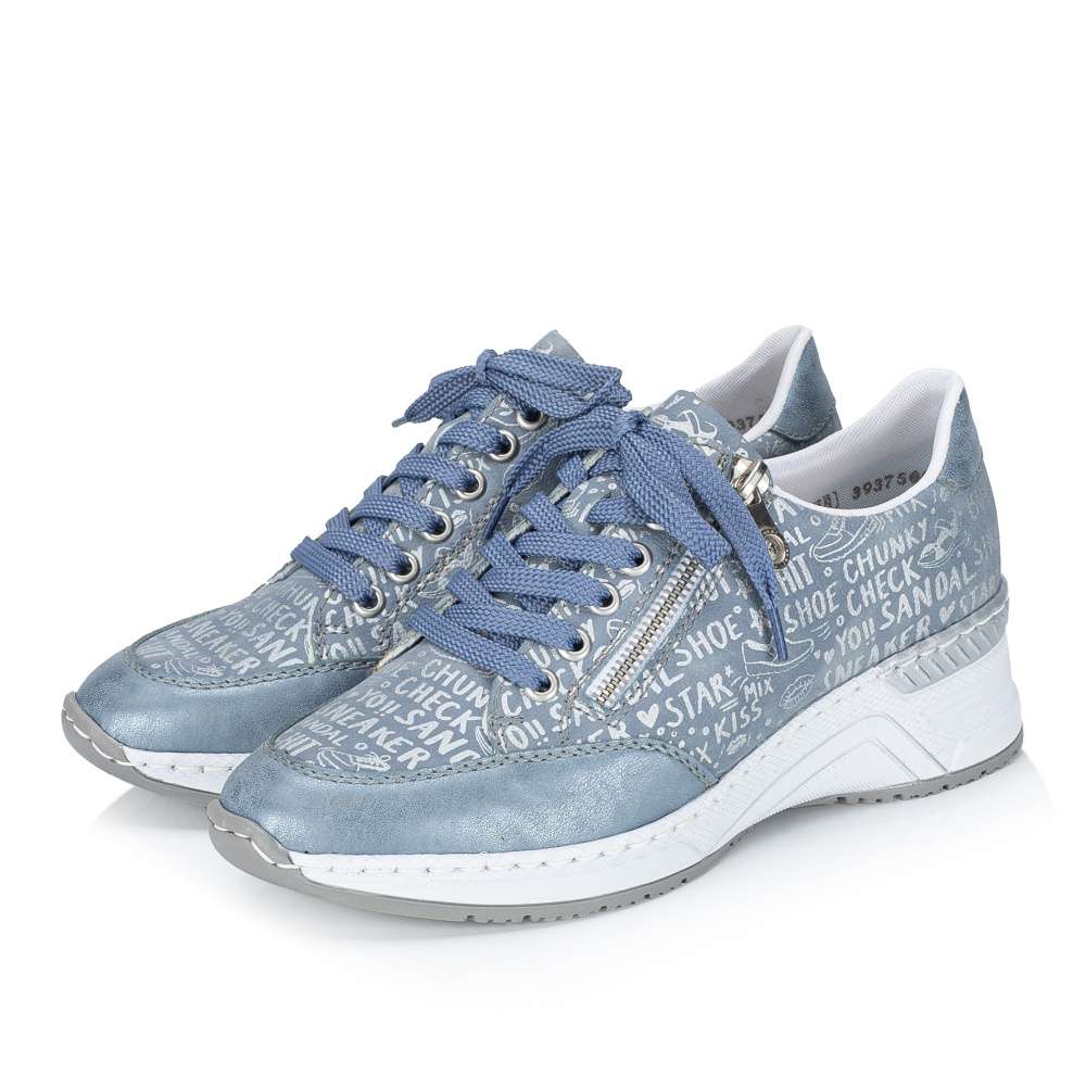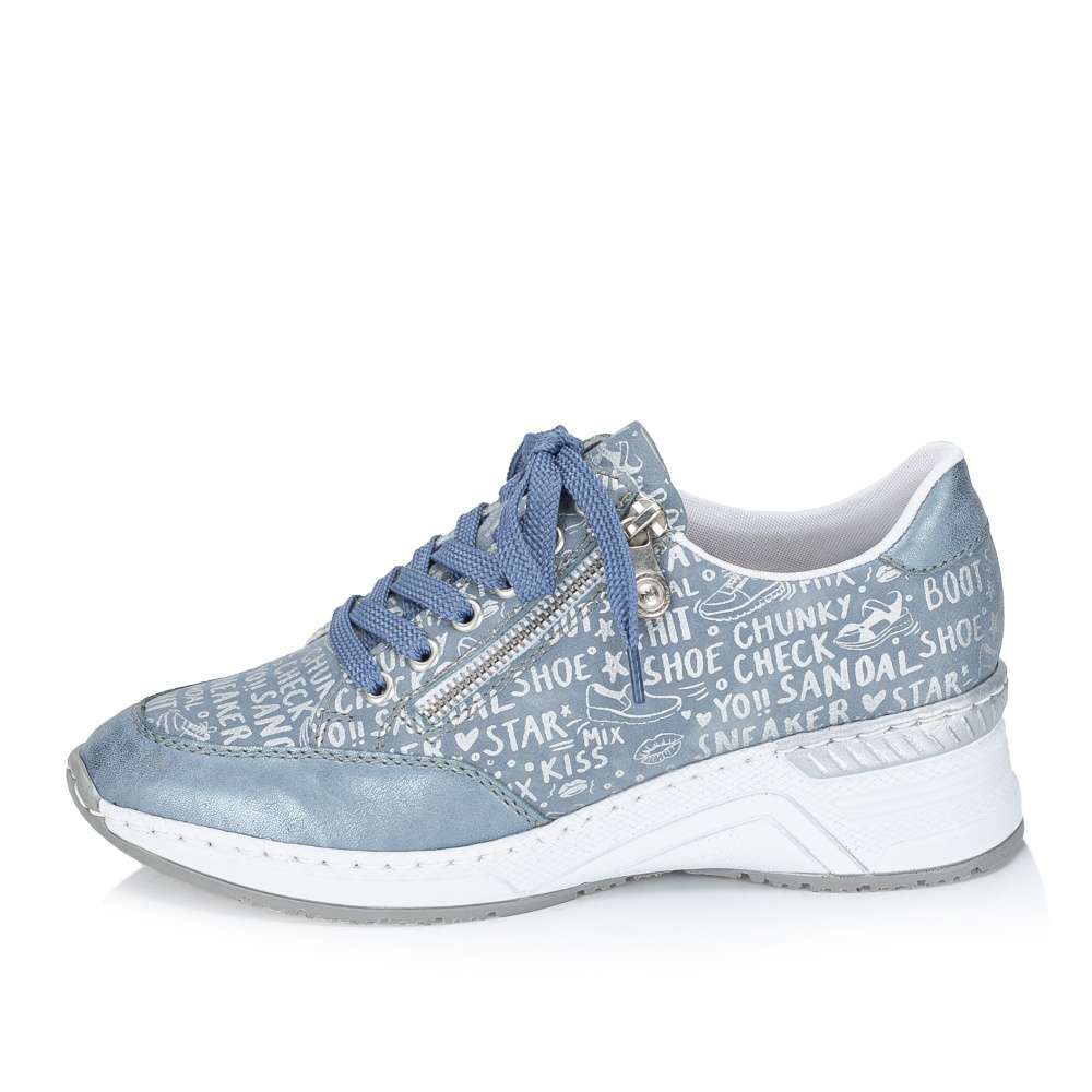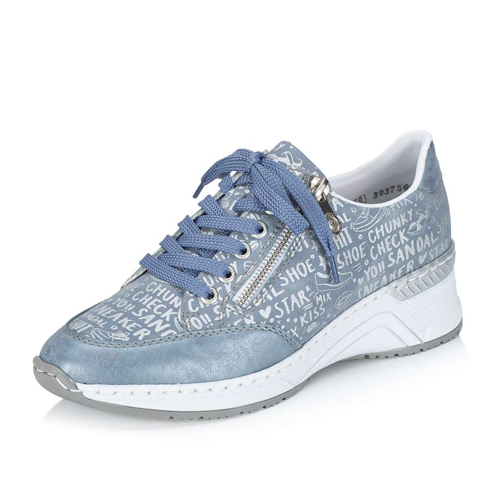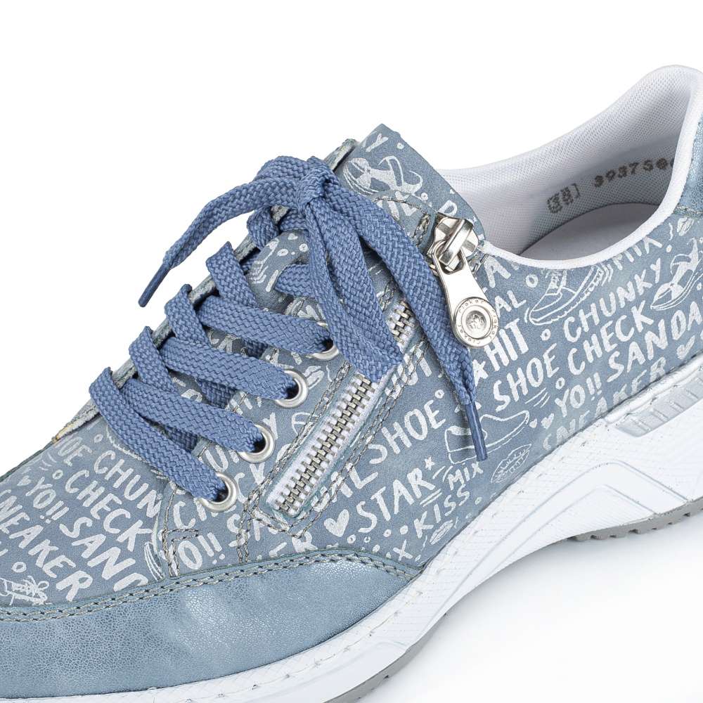 Každý detail těchto tenisek RIEKER je precizně přepracován tak, aby spojoval originální design s maximálním pohodlím. Modrý svršek zaujme dekorativními nápisy a efektními odlesky, které dodávají obuvi dynamický vzhled. Kombinace klasického šněrování a zipu v oblasti nártu zajišťuje snadné obouvání a zároveň umožňuje ideální přizpůsobení noze. Vyjímatelná kožená stélka je příjemná na došlap a poskytuje komfort i při celodenním nošení. Vyšší podešev v originálním stylu značky RIEKER nejen podtrhuje design tenisek, ale zároveň tlumí nárazy při chůzi a zajišťuje stabilitu při každém kroku. Tyto tenisky jsou ideální volbou pro ženy, které chtějí vyniknout stylem, ale zároveň si potrpí na pohodlí a kvalitu při každodenních aktivitách.
