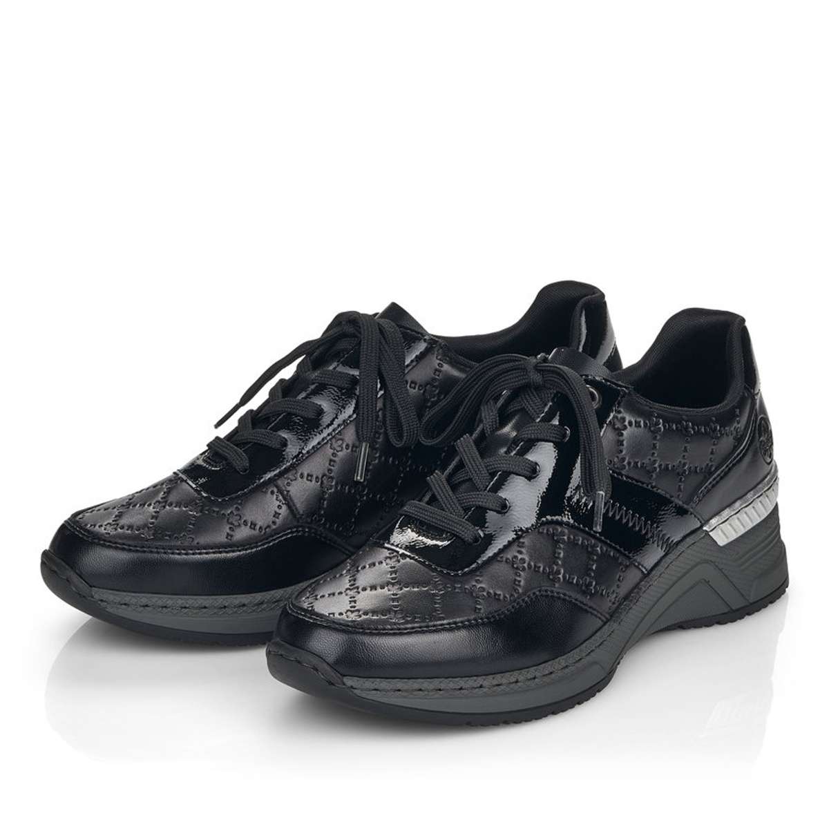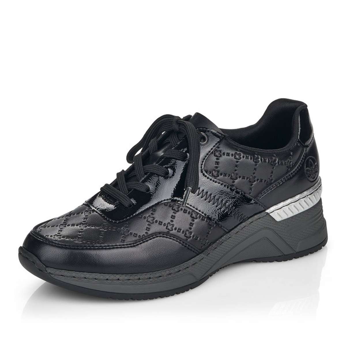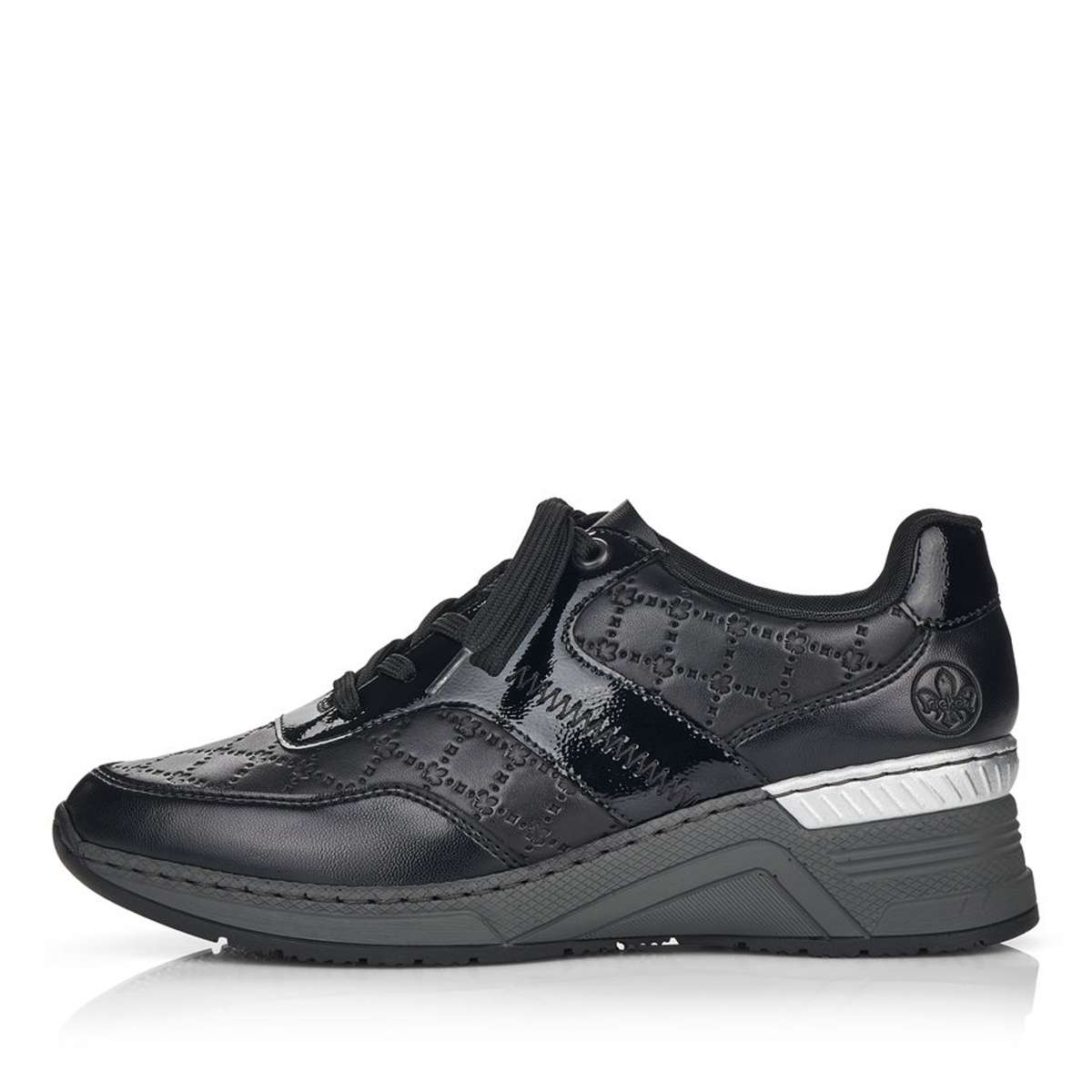 Zcela nezapomenutelně na Vás zapůsobí tyto tenisky značky RIEKER a ještě Vám přidají pár centimetrů navíc. Šněrování Vám ulehčí nazouvání, kvalitní svršek s vytláčenými prvky a kožená vyjímatelná stélka zaručí celkové pohodlí i při dlouhodobém nošení. Podešev je vyšší s pruhem ve stříbrné barvě pro hezčí vizuální dojem a hrubší vzorek ze spodní části platformy pro funkčnost na jakémkoliv povrchu. Díky této zajímavé kombinaci si můžete boty obout do práce i na volný čas a vždy budete vypadat a cítit se skvěle.