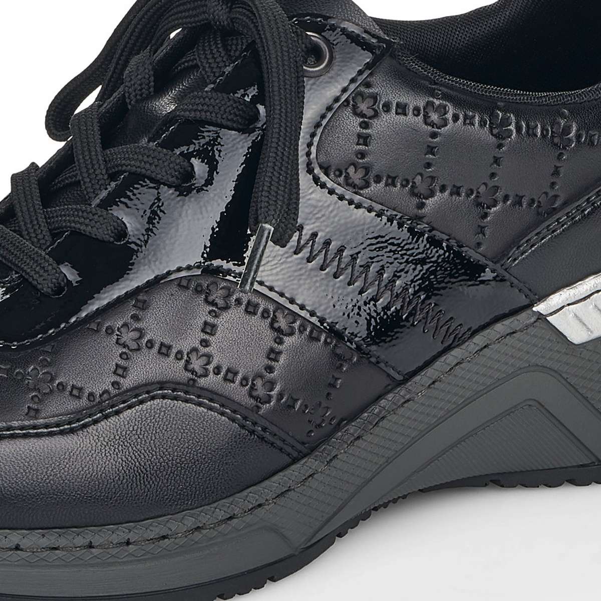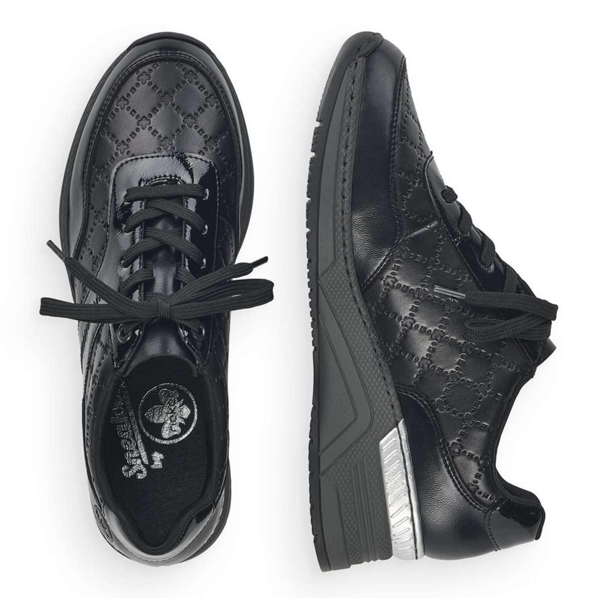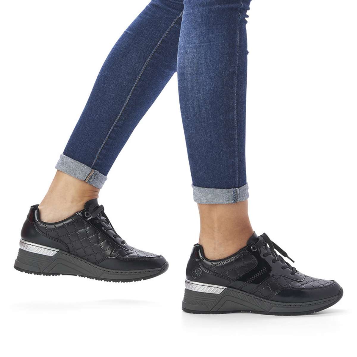 Zcela nezapomenutelně na Vás zapůsobí tyto tenisky značky RIEKER a ještě Vám přidají pár centimetrů navíc. Šněrování Vám ulehčí nazouvání, kvalitní svršek s vytláčenými prvky a kožená vyjímatelná stélka zaručí celkové pohodlí i při dlouhodobém nošení. Podešev je vyšší s pruhem ve stříbrné barvě pro hezčí vizuální dojem a hrubší vzorek ze spodní části platformy pro funkčnost na jakémkoliv povrchu. Díky této zajímavé kombinaci si můžete boty obout do práce i na volný čas a vždy budete vypadat a cítit se skvěle.
