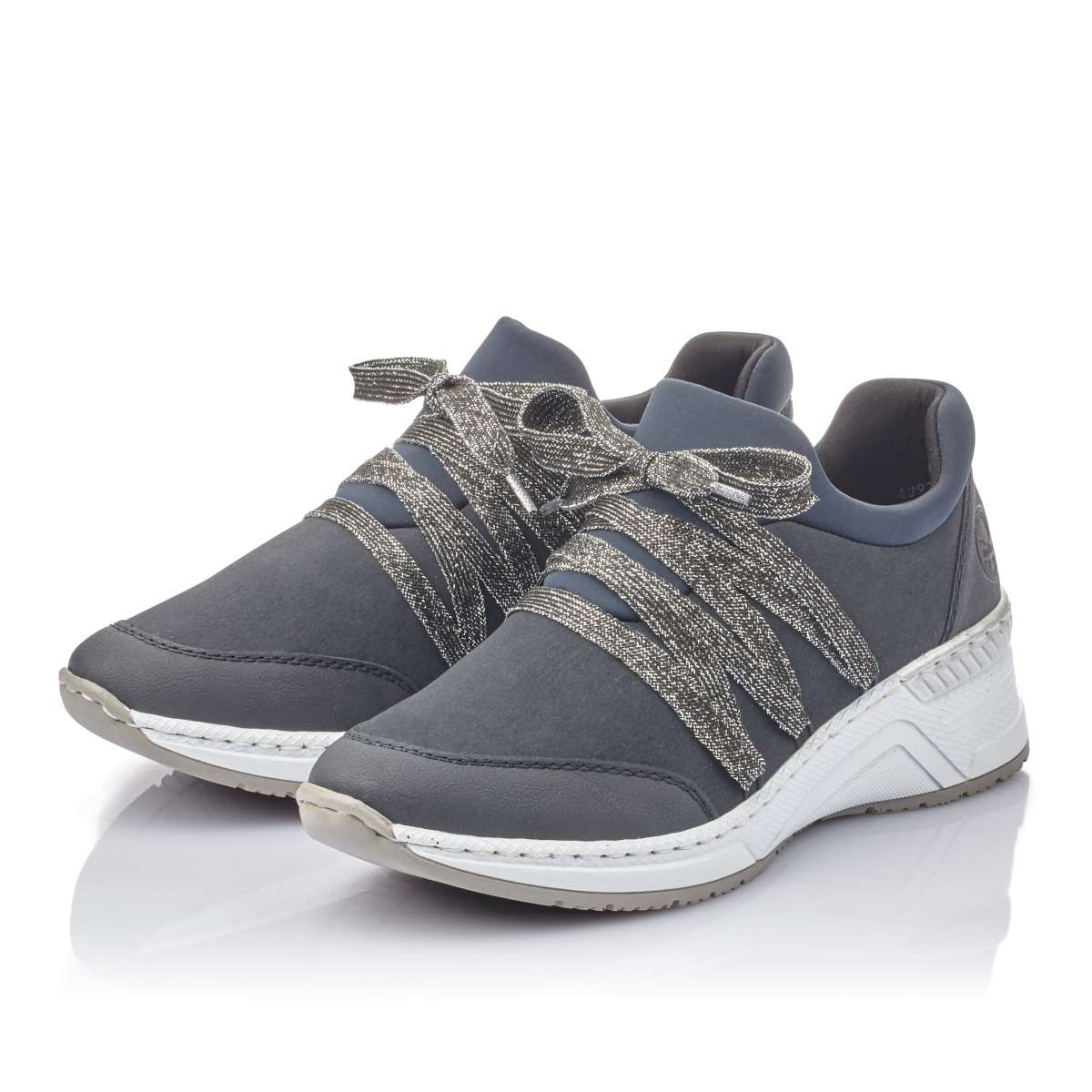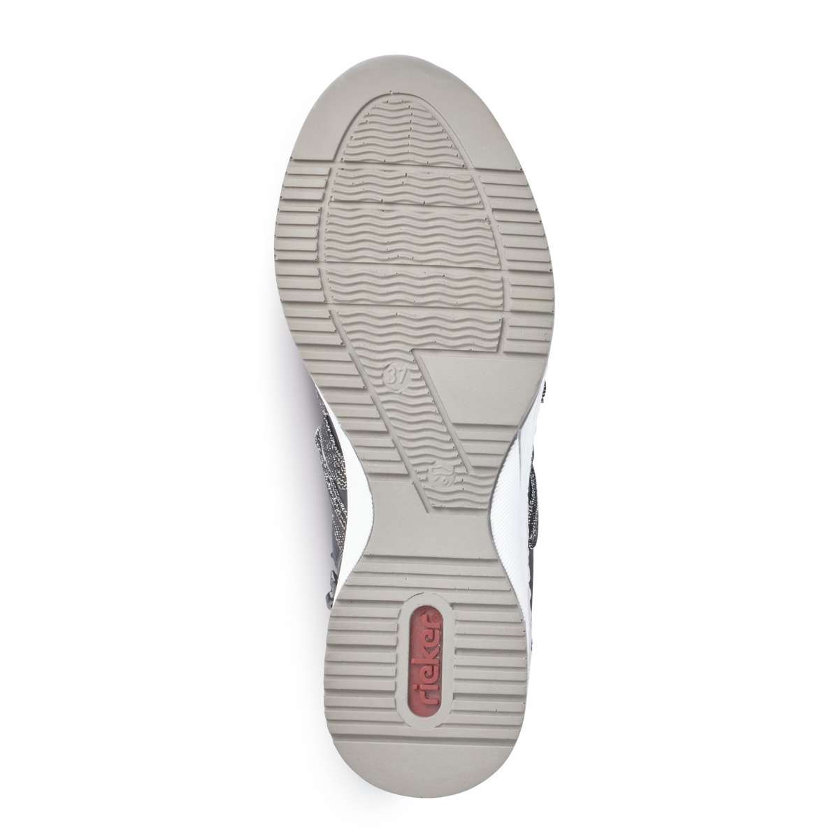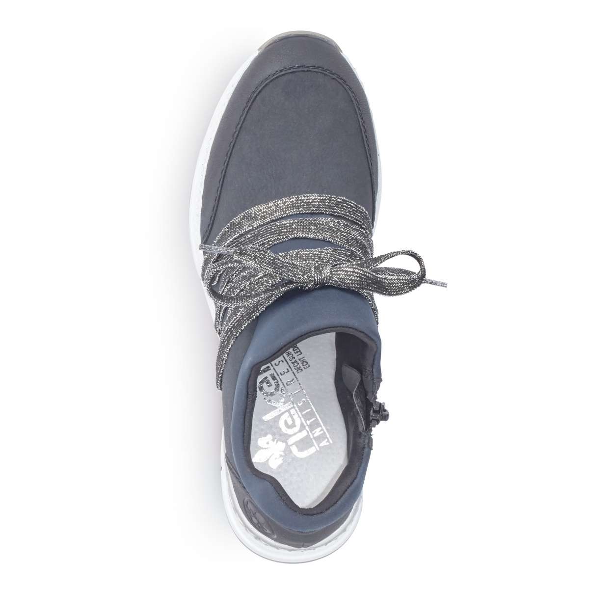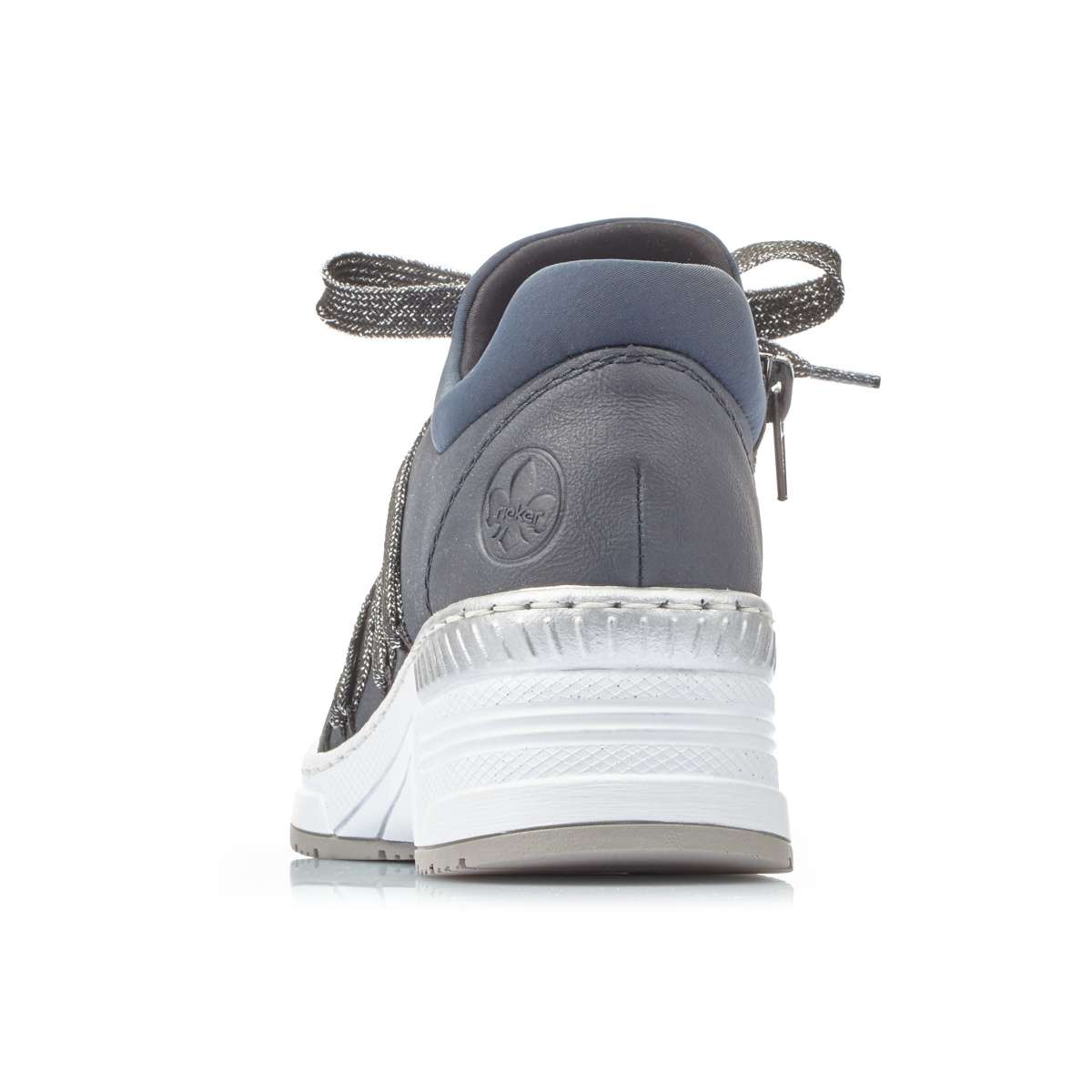 Tyto módní tenisky značky RIEKER využijete snad ke každému outfitu, ať už vyrazíte do práce či za zábavou. Tmavě modrý hladký svršek zdobí černo stříbrné tkaničky, jemné prošívání a vytlačené logo značky. Pro snadnější obutí je lem kolem kotníku pružný a na vnitřní straně najdete funkční zip. Díky podešvi s technologií Antistress a vyjímatelné kožené stélce se v této sportovní obuvi budete cítit pohodlně po celý den.