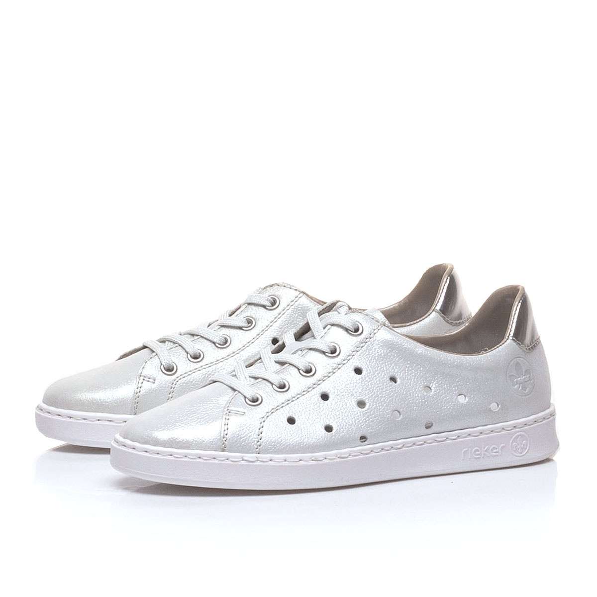 Dámské tenisky, šité z pravé kůže mají svršek s metalickými odlesky a v patě lesklý proužek. Po stranách je perforace pro pěkný design a lepší cirkulaci vzduchu. Šněrováním si obuv upravíte dle svých představ. Pevná a stabilní podešev se postarají o jistý krok. Tento světlý model bude vypadat nádherně s každou sukní i kalhotami.