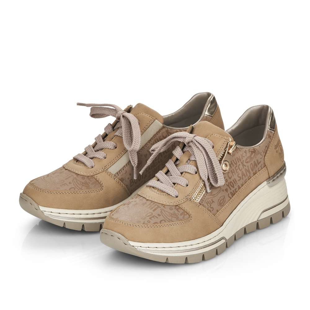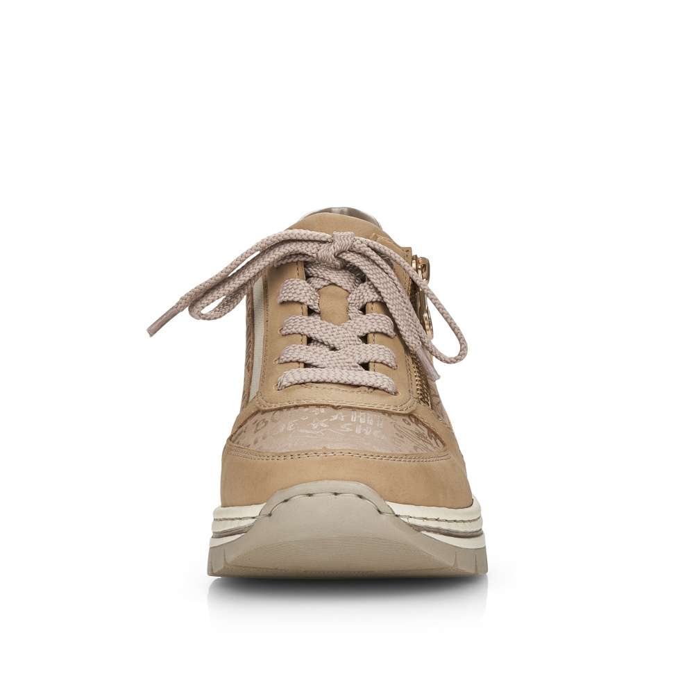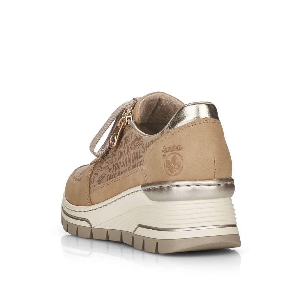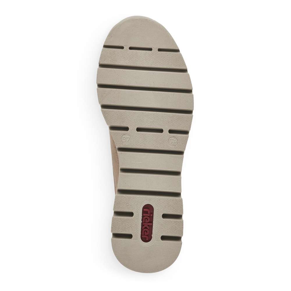 Tato krásná teniska od značky Rieker je skvělý módní doplněk, se kterým zazáříte ať už se vydáte na nákup či výlet do města. Svršek boty má velmi zajímavé provedení, ve kterém se doplňují dva odstíny béžové barvy, z nichž jeden je zdoben moderním textem. Teniska má na vnější straně funkční zip a disponuje také tkaničkami. Aby Vám skvěle padla, nachází se na vnější straně i prvek s gumičkou, díky kterému botu také pohodlně obujete. Bota navíc zaujme vyvýšenou podešví v oblasti paty, která jí dodává na originalitě. Teniska utváří skvělý outfit s riflemi i kraťasy.